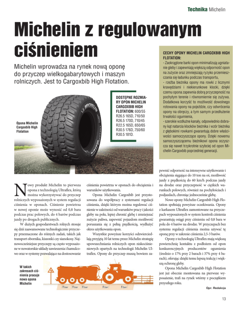 Technika Michelin Michelin z regulowanym ciśnieniem Michelin wprowadza na rynek nową oponę do przyczep wielkogabarytowych i maszyn rolniczych. Jest to Cargoxbib High Flotation. Opona Michelin Cargoxbib High Flotation N owy produkt Michelin to pierwsza opona z technologią Ultraflex, którą można wykorzystywać do przyczep rolniczych wyposażonych w system regulacji ciśnienia w oponach. Ciśnienie powietrza w nowej oponie może wynosić od 0,8 bara podczas prac polowych, do 4 barów podczas jazdy po drogach publicznych. W dużych gospodarstwach rolnych stosuje się dziś zaawansowane technologicznie przyczepy przeznaczone do różnych zadań, takich jak transport obornika, kiszonki czy sianokosy. Najnowocześniejsze przyczepy są często wyposażone w nowatorskie układy zawieszenia i hamulcowe oraz w systemy pozwalające na dostosowanie W takich zakresach ciśnienia pracuje nowa opona Michelin DOSTĘPNE ROZMIARY OPON MICHELIN CARGOXBIB HIGH FLOTATION: 600/55 R26.5 165D, 710/50 R26.5 170D, 710/45 R22.5 165D, 650/65 R30.5 176D, 750/60 R30.5 181D. ciśnienia powietrza w oponach do obciążenia i warunków użytkowania. Opona Michelin Cargoxbib jest przystosowana do współpracy z systemami regulacji ciśnienia, dzięki którym można regulować ciśnienie w zależności od warunków pracy i jakości gleby na polu, lepiej chronić glebę i zmniejszać zużycie paliwa, zapewnić pojazdom możliwość poruszania się z pełną prędkością, wydłużyć okres użytkowania opon. Wszystkie powyższe korzyści odzwierciedlają przyjętą 10 lat temu przez Michelin strategię upowszechniania rolniczych opon niskociśnieniowych opartych na technologii Michelin Ultraflex. Opony do przyczep muszą bowiem za- CECHY OPONY MICHELIN CARGOXBIB HIGH FLOTATION: - Zaokrąglone barki opon minimalizują ugniatanie gleby i zapewniają większą odporność opon na zużycie oraz zmniejszają ryzyko przemieszczania się ładunku podczas transportu, - rzeźba bieżnika opony ma rowki z licznymi krawędziami i niekierunkowe klocki, dzięki czemu opona zapewnia dobrą przyczepność na pochyłym terenie i równomiernie się zużywa. Dodatkowa korzyść to możliwość dowolnego rotowania opony na pojeździe, czy odwrócenia opony na obręczy, a tym samym przedłużenie trwałości ogumienia, - szerokie wzdłużne kanały, odpowiednio dobrany kąt natarcia klocków bieżnika i wzór bieżnika z głębokimi rowkami gwarantują dobre właściwości samoczyszczące opony. Dzięki nowemu samoczyszczącemu bieżnikowi opona oczyszcza się nawet trzykrotnie szybciej od opon Michelin Cargoxbib poprzedniej generacji. pewnić odporność na intensywne użytkowanie i obciążenia sięgające do 10 ton na oś, możliwość jazdy z prędkością do 60 km/h podczas jazdy na drodze oraz przyczepność w ciężkich warunkach polowych, również na pochyłościach i podjazdach, chroniąc jednocześnie glebę. Nowe opony Michelin Cargoxbib High Flotation spełniają powyższe oczekiwania. Opony z karkasem Ultraflex zamontowane na przyczepach wyposażonych w system kontroli ciśnienia gwarantują osiągi przy ciśnieniu od 0,8 bara w polu do 4 barów na drodze. W przyczepach bez systemu regulacji ciśnienia można używać tę oponę przy w zakresie ciśnienia 2,5-3 barów. Opony z technologią Ultraflex mają większą powierzchnię kontaktu z podłożem od opon konkurencyjnych producentów ogumienia (średnio o 17% przy 2 barach i 37% przy 4 barach), oferując dzięki temu lepszą trakcję i większą ochronę gleby. Opona Michelin Cargoxbib High Flotation jest już obecnie montowana na pierwsze wyposażenie, trafi na rynek wtórny z początkiem przyszłego roku. Opr. Redakcja 13