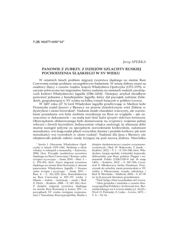 УДК 94(477+438)“14” Jerzy SPERKA PANOWIE Z ZUBRZY. Z DZIEJÓW SZLACHTY RUSKIEJ POCHODZENIA ŚLĄSKIEGO W XV WIEKU W ostatnich latach problem migracji rycerstwa śląskiego na ziemie Rusi Czerwonej zostaje poddany szczegółowym badaniom. W miarę dobrze znani są osadnicy śląscy z czasów rządów księcia Władysława Opolczyka (1372–1379), w zarysie uchwycono też migrantów, którzy nadania na ziemiach ruskich zawdzięczali królowi Władysławowi Jagielle (1386–1434)1. Niniejszy artykuł chciałbym poświecić jednemu z beneficjentów Jagiełły, który dał początek rodzinie Zubrskich, gospodarzącej w XV wieku na kilku wsiach leżących w pobliżu Lwowa. W 1407 roku (27 X) król Władysław Jagiełło przebywając w Medyce koło Przemyśla nadał Janowi z Bierawy na prawie dziedzicznym wieś Zubrzę w dystrykcie i ziemi lwowskiej*. Nadanie miało charakter wieczysty, ale warunkiem posiadania wsi była osobista rezydencja na Rusi ze względu – jak zaznaczono w dokumencie – na małą tam ilość ludzi (propter defectum hominum). Obowiązkiem obdarowanego było dostarczanie na wyprawy wojenne jednej włóczni i dwóch łuczników. Jednocześnie władca zastrzegł, że alienacja dóbr możne nastąpić jedynie za specjalnym zezwoleniem królewskim, natomiast mieszkańcy wsi mają nadal płacić wszystkie daniny i podatki królowi, jak inni mieszkańcy wsi rycerskich w ziemi ruskiej2. Nadanie dla Jana z Bierawy nie obejmowało jednak całości osady kryjącej się pod nazwą Zubrza. Niewielka 1 Sperka J. Otoczenie Władysława Opolczyka w latach 1379–1401. Studium o elicie władzy w relacjach z monarchą. – Katowice, 2006; Idem. Początki osadnictwa rycerstwa śląskiego na Rusi Czerwonej // Kняжа доба: історія і культура. – Львів, 2010. – Вип. 3. – С. 278–301; Idem. Zarys migracji rycerstwa śląskiego na ziemie Rusi Koronnej w okresie panowania Władysława Jagiełły // Kняжа доба: історія і культура. – Львів, 2011. – Вип. 4. – С. 221–229; Idem. Borschniowie na Rusi Czerwonej w XIV–XV wieku // Miasta – ludzie – instytucje – znaki / Red. Z. Piech. – Kraków, 2008. – S. 247–262; Idem. Z dziejów migracji rycerstwa śląskiego na ziemie Rusi Koronnej w końcu XIV i w początkach XV wieku (wstępne rozpoznanie) // Narodziny Rzeczypospolitej. Studia z dziejów średniowiecza i czasów wczesnonowożytnych / Red. W. Bukowski, T. Jurek. – Kraków, 2012. – T. 1. – S. 519–548; Idem. Władysław, książę opolski, wieluński, kujawski, dobrzyński, pan Rusi, palatyn Węgier i namiestnik Polski (1326/1330–8 lub 18 maja 1401). – Kraków, 2012. – S. 347–356; Czwojdrak B. Młodowiccy herbu Działosza. Przyczynek do szlachty ziemi przemyskiej w XV wieku // Mieszczanie, wasale, zakonnicy / Red. B. Śliwiński. – Malbork, 2004. – S. 47–59 (w tych pracach literatura przedmiotu). * Dziś Зубрa, 8 km na południe od Lwowa. 2 Akta grodzkie i ziemskie z czasów Rzeczypospolitej Polskiej z Archiwum w. Bernardyńskiego we Lwowie (dalej cyt. AGZ) / Wyd. O. Pietruski, X. Liske. – Lwów, 1873. – T. 4. – Nr 16. 340 Jerzy SPERKA część wsi była już wcześniej – może nawet od czasów Władysława Opolczyka – w rękach prywatnych; w 1391 roku notowany jest Dietko z Zubrzy3; natomiast w latach 1394–1407 dziedzicem części osady był Stanisław Lambertowicz heres de Zubrza4. Mimo wspomnianych nadań nadal duża część wsi pozostała w rękach królewskich i ona też, co jakiś czas była obciążana sumami, które monarchowie zapisywali różnym beneficjentom. Były one ubezpieczeniem zaciągniętych pożyczek, albo nagrodą za oddane zasługi5. Nowy właściciel części Zubrzy, Jan, pochodził z Górnego Śląska. Jego rodzinna Bierawa (Birawa) leżała koło Koźla (dziś Kędzierzyn-Koźle) w ówczesnej domenie książąt oleśnickich, którym jeszcze w drugiej połowie XIV wieku w podziale księstwa bytomsko-kozielskiego przypadła część kozielska. Rodzonym bratem Jana, był Paweł (Paszek) zwany Gawronek6, który też dziedziczył na Bierawie7. Natomiast najpewniej ich ojcem był Pakosz z Bierawy, starosta strzelecki (1387), który za zasługi otrzymał od księcia opolskiego Bolesława IV wójtostwo w Leśnicy (1386)8. Jan i Paweł nie byli jednak jedynymi właścicielami 3 Sprzedał wtedy (wraz z przyjacielem Wojciechem), za radą brata Bruna, sianożęć (łąkę) Grzegorzowi Dawidowskiemu za 1600 groszy: Petruszewicz A., x. Materiały historyczne // Przegląd Archeologiczny. – Lwów, 1882. – Zesz. 1, nr 1. – S. 72–73. 4 AGZ. – Lwów. 1872. – T. 3. – Nr 57, Ibidem. – T. 4. – Nr 19. Stanisław Lambertowicz był pasierbem (privignus) Lamberta (Lymbarda), który w 1375 roku otrzymał Oświcę (i Zduszyce) od księcia Władysława Opolczyka: AGZ. – Lwów, 1870. – T. 2. – Nr 5; Gilewicz A. Stanowisko i działalność gospodarcza Władysława Opolczyka na Rusi w latach 1372–1378 // Prace historyczne wydane ku uczczeniu 50-lecia Akademickiego Koła Historyków Uniwersytetu Jana Kazimierza we Lwowie 1878–1928. – Lwów, 1929. – S. 99; Sperka J. Otoczenie... – S. 279; Idem. Początki osadnictwa... – S. 295. Wieś odziedziczyli Przedbór i Stanisław (określani w dokumencie, jako filiastros Lamberta), ale po długich sporach w 1393 roku Przedbór zrezygnował z niej na rzecz Stanisława: AGZ. – T. 3. – Nr 56. 5 Mikołaj Klus z Wyżnian miał zapisane jakieś sumy na Zubrzy przez króla Władysława Jagiełłę, natomiast Kazimierz Jagiellończyk zapisał mu jeszcze 100 grzywien (na Zubrzy i innych wsiach): Katalog dokumentów pergaminowych ze zbiorów Tomasza Niewodniczańskiego w Bitburgu / Oprac. J. Tomaszewicz, M. Zdanek, pod red. W. Bukowskiego. – Kraków, 2004. – Nr 59; AGZ. – Lwów, 1875. – T. 5. – Nr 114; Andrzej Jacimierski w 1469 roku okazał lustratorom dokumenty królewskie na sumy zapisane na
