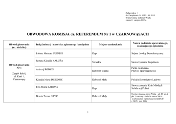 Załącznik nr 1 do Zarządzenia Nr 0050.1.89.2015 Wójta Gminy Dobrzeń Wielki z dnia 11 sierpnia 2015r. OBWODOWA KOMISJA ds. REFERENDUM Nr 1 w CZARNOWĄSACH Obwód głosowania (nr, siedziba) Imię (imiona ) i nazwisko zgłaszanego kandydata Łukasz Mateusz ULIŃSKI Justyna Klaudia KAŁUŻA Obwód głosowania Nr 1 Zespół Szkół, ul. Kani 1, Czarnowąsy Andrzej RODZIS Klaudia Maria DZIEDZIC Ewa Maria KARDAS Dorota Teresa GRYC Miejsce zamieszkania Kup Sojusz Lewicy Demokratycznej Świerkle Stowarzyszenie Wspólnota Dobrzeń Wielki Partia Polityczna Prawo i Sprawiedliwość Dobrzeń Mały Polskie Stronnictwo Ludowe Kup Stowarzyszenie Klub Młodych Solidarnej Polski Dobrzeń Mały 1 Nazwa podmiotu uprawnionego, dokonującego zgłoszenia Osoba wskazana przez Wójta - art. 13 ust. 2 pkt 2a ustawy z dnia 14 marca 2003r. o referendum ogólnokrajowym (Dz.U. z 2015r. poz. 318). Załącznik nr 2 do Zarządzenia Nr 0050.1.89.2015 Wójta Gminy Dobrzeń Wielki z dnia 11 sierpnia 2015r. OBWODOWA KOMISJA ds. REFERENDUM Nr 2 w CHRÓŚCICACH Obwód głosowania (nr , siedziba) Imię (imiona ) i nazwisko zgłaszanego kandydata, Urszula Teresa KASPRZYK Sławomir Krzysztof PETRUS Miejsce zamieszkania Chróścice Sojusz Lewicy Demokratycznej Dobrzeń Wielki Partia Polityczna Prawo i Sprawiedliwość Brzezie Polskie Stronnictwo Ludowe Chróścice Stowarzyszenie Klub Młodych Solidarnej Polski Obwód głosowania Nr 2 Katarzyna Eugenia CMOK Sala przy OSP, ul. Powstańców Śląskich 11, Sylwia LEDWOLORZ Chróścice Iwona LISOWSKA-TORKA Chróścice 2 Nazwa podmiotu uprawnionego, dokonującego zgłoszenia Osoba wskazana przez Wójta - art. 13 ust. 2 pkt 2a ustawy z dnia 14 marca 2003r. o referendum ogólnokrajowym (Dz.U. z 2015r. poz. 318). Załącznik nr 3 do Zarządzenia Nr 0050.1.89.2015 Wójta Gminy Dobrzeń Wielki z dnia 11 sierpnia 2015r. OBWODOWA KOMISJA ds. REFERENDUM Nr 3 w DOBRZENIU MAŁYM Obwód głosowania (nr , siedziba) Imię (imiona ) i nazwisko zgłaszanego kandydata, Miejsce zamieszkania Nazwa podmiotu uprawnionego, dokonującego zgłoszenia Sojusz Lewicy Demokratycznej Anna WOLNY Dobrzeń Mały Paweł Michał SZRAM Dobrzeń Wielki Grażyna Maria KOWALSKA Brzezie Obwód głosowania Nr 3 Szkoła Zawodowa, ul. Opolska 85, Dobrzeń Mały Partia Polityczna Prawo i Sprawiedliwość Polskie Stronnictwo Ludowe Beata RYBICKA Brzezie Beata Renata ŚCIGAŁA Dobrzeń Wielki, 3 Stowarzyszenie Klub Młodych Solidarnej Polski Osoba wskazana przez Wójta - art. 13 ust. 2 pkt 2a ustawy z dnia 14 marca 2003r. o referendum ogólnokrajowym (Dz.U. z 2015r. poz. 318). Załącznik nr 4 do Zarządzenia Nr 0050.1.89.2015 Wójta Gminy Dobrzeń Wielki z dnia 11 sierpnia 2015r. OBWODOWA KOMISJA ds. REFERENDUM Nr 4 w DOBRZENIU WIELKIM Obwód głosowania (nr , siedziba) Miejsce zamieszkania Imię (imiona ) i nazwisko zgłaszanego kandydata, Irena Maria KIEŁBUS Kup Sojusz Lewicy Demokratycznej Jan Stanisław CHEŁSTOWSKI Dobrzeń Wielki Partia Polityczna Prawo i Sprawiedliwość Angelika Anna RADOMSKA Dobrzeń Wielki Polskie Stronnictwo Ludowe Chróścice Stowarzyszenie Klub Młodych Solidarnej Polski Obwód głosowania Nr 4 Gminny Ośrodek Kultury, Dobrzeń Wielki, ul. Namysłowska 20 Nazwa podmiotu uprawnionego, dokonującego zgłoszenia Angelika Anna WEBER Grażyna Anna KOŹLIK Kuźnica Katowska 4 Osoba wskazana przez Wójta - art. 13 ust. 2 pkt 2a ustawy z dnia 14 marca 2003r. o referendum ogólnokrajowym (Dz.U. z 2015r. poz. 318). Załącznik nr 5 do Zarządzenia Nr 0050.1.89.2015 Wójta Gminy Dobrzeń Wielki z dnia 11 sierpnia 2015r. OBWODOWA KOMISJA ds. REFERENDUM Nr 5 w Kup Obwód głosowania (nr , siedziba) Obwód głosowania Nr 5 Zespół Szkolno – Przedszkolny, ul. 1 Maja 6a, Kup Imię (imiona ) i nazwisko zgłaszanego kandydata, Miejsce zamieszkania Nazwa podmiotu uprawnionego, dokonującego zgłoszenia Bożena Maria ULIŃSKA Kup Sojusz Lewicy Demokratycznej Anna CICHECKA Kup Partia Polityczna Prawo i Sprawiedliwość Wojciech Jakub RZEŹNICZEK Kup Polskie Stronnictwo Ludowe Otylia Agnieszka WŁODARCZYK Kup Rafał Piotr PARZONKA Kup 5 Uzupełnienie składu komisji w trybie art. 13 ust. 5 i 6 ustawy z dnia 14 marca 2003r. o referendum ogólnokrajowym (Dz.U. z 2015r. poz. 318). Osoba wskazana przez Wójta - art. 13 ust. 2 pkt 2a ustawy z dnia 14 marca 2003r. o referendum ogólnokrajowym (Dz.U. z 2015r. poz. 318). Załącznik nr 6 do Zarządzenia Nr 0050.1.89.2015 Wójta Gminy Dobrzeń Wielki z dnia 11 sierpnia 2015r. OBWODOWA KOMISJA ds. REFERENDUM Nr 6 w ŚWIERKLACH Obwód głosowania (nr , siedziba) Imię (imiona ) i nazwisko zgłaszanego kandydata, Miejsce zamieszkania Świerkle Helena Krystyna PASALSKA Sojusz Lewicy Demokratycznej Nikola Maria KAŁUŻA Świerkle Stowarzyszenie Wspólnota Agata Karolina MOSKAL Dobrzeń Wielki Partia Polityczna Prawo i Sprawiedliwość Obwód głosowania Nr 6 Sala Wiejska, ul. Mickiewicza 2, Świerkle Nazwa podmiotu uprawnionego, dokonującego zgłoszenia Polskie Stronnictwo Ludowe Brzezie Iwona Janina ŁATA Natalia Dominika PRZEPIÓRA Świerkle Gizela JENDRYCA Chróścice 6 Stowarzyszenie Klub Młodych Solidarnej Polski Osoba wskazana przez Wójta - art. 13 ust. 2 pkt 2a ustawy z dnia 14 marca 2003r. o referendum ogólnokrajowym (Dz.U. z 2015r. poz. 318). Załącznik nr 7 do Zarządzenia Nr 0050.1.89.2015 Wójta Gminy Dobrzeń Wielki z dnia 11 sierpnia 2015r. OBWODOWA KOMISJA ds. REFERENDUM Nr 7 w CHRÓŚCICACH Obwód głosowania (nr, siedziba) Obwód głosowania Nr 7 Imię (imiona ) i nazwisko zgłaszanego kandydata, Miejsce zamieszkania Nazwa podmiotu uprawnionego, dokonującego zgłoszenia Michał Paweł CZEKAJ Dobrzeń Wielki Sojusz Lewicy Demokratycznej Ewa HOLEKSA Czarnowąsy Stowarzyszenie Wspólnota Dobrzeń Wielki Partia Polityczna Prawo i Sprawiedliwość Chróścice Polskie Stronnictwo Ludowe Dobrzeń Wielki Stowarzyszenie Klub Młodych Solidarnej Polski Sala przy OSP, Waldemar ŚLEDŹ ul. Powstańców Śląskich 11, Chróścice Tomasz ŚMIAROWSKI Katarzyna CHWIST
