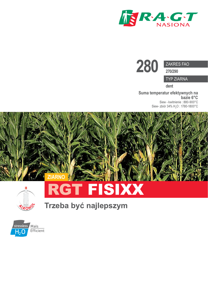 280 Zakres FAO 270/290 TYP ZIARNA dent Suma temperatur efektywnych na bazie 6°C Siew - kwitnienie : 880-900°C Siew- zbiór 34% H2O : 1780-1800°C ziarno L RGT fisixx O A LK O H Trzeba być najlepszym RGT fisixx ziarno Trzeba być najlepszym 270/290 L LK O H A profil odmiany - Bardzo wysoki potencjał plonowania na ziarno - Szybkie dojrzewanie w ostatniej fazie wegetacji O 280 Zakres FAO - Dobre oddawanie wody w okresie dojrzewania - Bardzo wysoka zdrowotność - Wysoka tolerancja na trudne warunki, szczególnie brak wody Rejestracja: 2011 EU Typ mieszańca: pojedynczy Typ ziarna: dent Morfologia Komponenty plonu Ilość rzędów Ilość ziarn. / rzęd. MTZ 16,0 28-32 340-360 g Kryteria agronomiczne - Dobry wigor początkowy (w grupie późnej) - Bardzo regularne kolby - Tolerancja na warunki stresowe - Wysoka masa ziarna Kukurydza na ziarno. Doświadczenia PDO CCA 2012 r. Grupa średniopóźna Plon ziarna (dt z ha) przy 14% wilgotności - Rośliny średniej wysokości mocno ulistnione - L iście wzniesione do góry z mocnym spadkiem - Kolby regularnie wypełnone do końca 145 140 RGT FISIXX 135 130 125 120 115 110 22 Dobrych Trudnych Zimnych gleb ++++ ++++ +++ zgs Zalecana gęstość siewu (nasion/ha) Ziarno 85-90 000 w w w . r a g t . p l RAGT Semences POLSKA Sp. z o.o. • ul. Sadowa 10A • 87-148 Łysomice • Tél. 566783207 • Tél/fax. 5667879 25 26 27 28 29 Średnia wzorca Pozostałe badane odmiany Kukurydza na ziarno. Doświadczenia PDO CCA 2012-2013 Grupa średniopóźna. Plon ziarna (dt z ha) przy 14% wilgotności. 140 135 130 Plon ziarna (dt z ha) adaptacja do warunków 24 Wilgotność ziarna [%] Kryteria bezpieczeństwa - Wysoka zdrowotność rośliny - Mała wrażliwość na choroby łodyg i liści - Mała wrażliwość na choroby kolb - Zdrowa, sztywna łodyga 23 RGT FISIXX 125 Średnia wzorca 120 Średnia badanych odmian 115 110 105 100 2012 2013 Wszyskie prezentowane dane techniczne zostały opracowane na podstawie wyników uzyskanych w oficjalnych badaniach COBORU oraz testów prowadzonych w sieci doświaczalnej RAGT Semences. Odzwierciedlają aktualny stan naszej wiedzy opartej na licznych, dokładnych badaniach i obserwacjach prowadzonych w wielu powtórzeniach i różnorodnych warunkach z uwzględnieniem trwałości poszczególnych gatunków. Prezentowane dane zmieniają się w zależności od warunków agroklimatycznych oraz stosowanej technologii uprawy. Wykorzystane zdjęcia pochodzą ze zbioru RAGT Semences..
