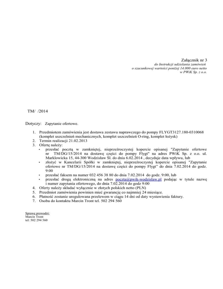 Załącznik nr 3 do Instrukcji udzielania zamówień o szacunkowej wartości poniżej 14.000 euro netto w PWiK Sp. z o.o. TM/ /2014 Dotyczy: Zapytanie ofertowe. 1. Przedmiotem zamówienia jest dostawa zestawu naprawczego do pompy FLYGT3127.180-0310068 (komplet uszczelnień mechanicznych, komplet uszczelnień O-ring, komplet łożysk) 2. Termin realizacji 21.02.2013 3. Ofertę należy: • przesłać pocztą w zamkniętej, nieprzeźroczystej kopercie opisanej "Zapytanie ofertowe nr TM/DG/15/2014 na dostawę części do pompy Flygt" na adres PWiK Sp. z o.o. ul. Marklowicka 15, 44-300 Wodzisław Śl. do dnia 6.02.2014 , decyduje data wpływu, lub • złożyć w Kancelarii Spółki w zamkniętej, nieprzeźroczystej kopercie opisanej "Zapytanie ofertowe nr TM/DG/15/2014 na dostawę części do pompy Flygt” do dnia 7.02.2014 do godz. 9:00 • przesłać faksem na numer 032 456 38 80 do dnia 7.02.2014 do godz. 9:00, lub • przesłać drogą elektroniczną na adres [email protected] podając w tytule nazwę i numer zapytania ofertowego, do dnia 7.02.2014 do godz 9:00 4. Oferty należy składać wyłącznie w złotych polskich netto (PLN) 5. Przedmiot zamówienia powinien mieć gwarancję co najmniej 24 miesiące. 6. Płatność zostanie uregulowana przelewem w ciągu 14 dni od daty wystawienia faktury. 7. Osoba do kontaktu Marcin Tront tel. 502 294 560 Sprawę prowadzi: Marcin Tront tel: 502 294 560