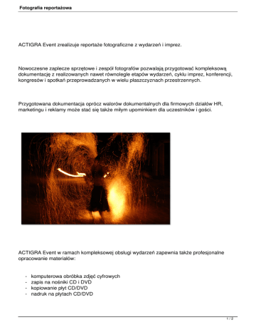 Fotografia reportażowa ACTIGRA Event zrealizuje reportaże fotograficzne z wydarzeń i imprez. Nowoczesne zaplecze sprzętowe i zespół fotografów pozwalają przygotować kompleksową dokumentację z realizowanych nawet równolegle etapów wydarzeń, cyklu imprez, konferencji, kongresów i spotkań przeprowadzanych w wielu płaszczyznach przestrzennych. Przygotowana dokumentacja oprócz walorów dokumentalnych dla firmowych działów HR, marketingu i reklamy może stać się także miłym upominkiem dla uczestników i gości. ACTIGRA Event w ramach kompleksowej obsługi wydarzeń zapewnia także profesjonalne opracowanie materiałów: - komputerowa obróbka zdjęć cyfrowych zapis na nośniki CD i DVD kopiowanie płyt CD/DVD nadruk na płytach CD/DVD 1/2 Fotografia reportażowa Na Państwa życzenie zrealizujemy także reportaże fotograficzne z innych, niż organizowanych w ramach ACTIGRA Group wydarzeń i eventów. 2/2