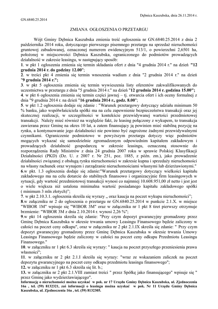 Dębnica Kaszubska, dnia 26.11.2014 r. GN.6840.25.2014 ZMIANA OGŁOSZENIA O PRZETARGU Wójt Gminy Dębnica Kaszubska zmienia treść ogłoszenia nr GN.6840.25.2014 z dnia 2 października 2014 roku, dotyczącego pierwszego pisemnego przetargu na sprzedaż nieruchomości gruntowej zabudowanej, oznaczonej numerem ewidencyjnym 513/1, o powierzchni 2,6501 ha, położonej w miejscowości Dębnica Kaszubska, ograniczonego do podmiotów prowadzących działalność w zakresie leasingu, w następujący sposób: 1. w pkt 1 ogłoszenia zmienia się termin składania ofert z dnia "4 grudnia 2014 r." na dzień "12 grudnia 2014 r. do godziny 12.00"; 2. w treści pkt 4 zmienia się termin wnoszenia wadium z dnia "2 grudnia 2014 r." na dzień "9 grudnia 2014 r."; 3. w pkt 5 ogłoszenia zmienia się termin wywieszenia listy oferentów zakwalifikowanych do uczestnictwa w przetargu z dnia "5 grudnia 2014 r." na dzień "12 grudnia 2014 r. godzina 15.00"; 4. w pkt 6 ogłoszenia zmienia się termin części jawnej – tj. otwarcia ofert i ich oceny formalnej z dnia "9 grudnia 2014 r. na dzień "16 grudnia 2014 r., godz. 8.00"; 5. w pkt 1.2 ogłoszenia dodaje się zdanie : "Warunek przetargowy dotyczący udziału minimum 50 % banku, jako współwłaściciela spółki ma na celu zapewnienie bezpieczeństwa transakcji oraz jej skutecznej realizacji, w szczególności w kontekście przewidywanej wartości przedmiotowej transakcji. Należy mieć również na względzie fakt, że leasing połączony z wykupem, to transakcja zawierana przez Gminę na okres 10 lat, a zatem finansujący ją powinien mieć stabilną pozycję na rynku, a kontynuowanie jego działalności nie powinno być zagrożone żadnymi przewidywalnymi czynnikami. Ograniczenie podmiotowe w powyższym przetargu dotyczy więc podmiotów mogących wykazać się samodzielnie zgromadzonym odpowiednim kapitałem zakładowym i prowadzących działalność gospodarczą w zakresie leasingu, oznaczoną stosownie do rozporządzenia Rady Ministrów z dnia 24 grudnia 2007 roku w sprawie Polskiej Klasyfikacji Działalności (PKD) (Dz. U. z 2007 r. Nr 251, poz. 1885, z późn. zm.), jako prowadzenie działalności związanej z obsługą rynku nieruchomości w zakresie kupna i sprzedaży nieruchomości na własny rachunek oraz wynajem i zarządzanie nieruchomościami własnymi lub dzierżawionymi." 6.w pkt. 1.3 ogłoszenia dodaje się zdanie:"Warunek przetargowy dotyczący wielkości kapitału zakładowego ma na celu dotarcie do stabilnych finansowo i organizacyjnie firm leasingowych w sytuacji, gdy wartość przedmiotowej transakcji wynosi co najmniej 10.608.951,00 zł netto i jest jest o wiele większa niż ustalona minimalna wartość posiadanego kapitału zakładowego spółki ( minimum 3 mln złotych)”; 7. w pkt 2.10.3.1. ogłoszenia skreśla się wyrazy „ oraz kaucja na poczet wykupu nieruchomości”; 8.w załączniku nr 2 do ogłoszenia o przetargu nr GN.6840.25.2014 w punkcie 2.1.X. w miejsce "WIBOR 1M" wpisuje się "WIBOR 3M" oraz w załączniku nr 1 pkt 8 tiret pierwszy otrzymuje brzmienie: "WIBOR 3M z dnia 2.10.2014 r. wynosi 2,26 %"; 9.w pkt 14 ogłoszenia skreśla się zdanie: "Przy czym depozyt gwarancyjny gromadzony przez Gminę Dębnica Kaszubska w okresie trwania umowy Leasingu Finansowego będzie zaliczony w całości na poczet ceny odkupu", oraz w załączniku nr 2 pkt 2.1.IX skreśla się zdanie: " Przy czym depozyt gwarancyjny gromadzony przez Gminę Dębnica Kaszubska w okresie trwania Umowy Leasingu Finansowego będzie zaliczony w całości na poczet ceny odkupu Przedmiotu Leasingu Finansowego." 10. w załączniku nr 1 pkt 6.3 skreśla się wyrazy: " kaucja na poczet przyszłego przeniesienia prawa własności"; 11. w załączniku nr 2 pkt 2.1.I skreśla się wyrazy: "wraz ze wskazaniem zaliczek na poczet depozytu gwarancyjnego na poczet ceny odkupu przedmiotu leasingu finansowego"; 12. w załączniku nr 1 pkt 6.3 skreśla się lit. b.; 13. w załączniku nr 2 pkt 2.1.VIII zamiast treści " przez Spółkę jako finansującego" wpisuje się " przez Gminę jako wydzierżawiającego". Informację o nieruchomości można uzyskać w pok. nr 17 Urzędu Gminy Dębnica Kaszubska, ul. Zjednoczenia 16a , tel. (59) 8132321, zaś informacji o leasingu można uzyskać w pok. Nr 11 Urzędu Gminy Dębnica Kaszubska, ul. Zjednoczenia 16a , tel. (59) 8132305.