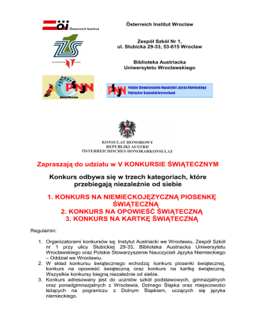 Österreich Institut Wroclaw Zespół Szkół Nr 1, ul. Słubicka 29-33, 53-615 Wrocław Biblioteka Austriacka Uniwersytetu Wrocławskiego Zapraszają do udziału w V KONKURSIE ŚWIĄTECZNYM Konkurs odbywa się w trzech kategoriach, które przebiegają niezależnie od siebie 1. KONKURS NA NIEMIECKOJĘZYCZNĄ PIOSENKĘ ŚWIĄTECZNĄ 2. KONKURS NA OPOWIEŚĆ ŚWIĄTECZNĄ 3. KONKURS NA KARTKĘ ŚWIĄTECZNĄ Regulamin: 1. Organizatorami konkursów są: Instytut Austriacki we Wrocławiu, Zespół Szkół nr 1 przy ulicy Słubickiej 29-33, Biblioteka Austriacka Uniwersytetu Wrocławskiego oraz Polskie Stowarzyszenie Nauczycieli Języka Niemieckiego – Oddział we Wrocławiu. 2. W skład konkursu świątecznego wchodzą: konkurs piosenki świątecznej, konkurs na opowieść świąteczną oraz konkurs na kartkę świąteczną. Wszystkie konkursy biegną niezależnie od siebie. 3. Konkurs adresowany jest do uczniów szkół podstawowych, gimnazjalnych oraz ponadgimnazjalnych z Wrocławia, Dolnego Śląska oraz miejscowości leżących na pograniczu z Dolnym Śląskiem, uczących się języka niemieckiego. 4. W konkursie może wziąć udział po jednym reprezentancie szkoły w przypadku konkursu na piosenkę świąteczną (solista, zespół lub duet) oraz dwóch reprezentantów ze szkoły w przypadku konkursów na kartkę oraz opowieść świąteczną. Konkurs piosenki świątecznej: - konkurs odbywa się w auli szkolnej Zespołu Szkół nr 1, przy ulicy Słubickiej 29-33 we Wrocławiu od godz. 9.00. Dla szkół podstawowych odbywa się on w dniu 10 grudnia, dla szkół gimnazjalnych oraz ponadgimnazjanych w dniu 9 grudnia 2013 r. - organizatorem i koordynatorem konkursu jest Österreich Institut Wrocław, [email protected] , tel. 71 344 71 13, fax. 71 344 71 14 - każda ze szkół może wystawić do konkursu maksymalnie jednego reprezentanta: jednego solistę, duet, lub zespół. - zgłoszenia do konkursu należy kierować drogą mailową do 3 grudnia 2013 do Instytutu Austriackiego we Wrocławiu: wrocł[email protected] lub przesyłając formularz zgłoszeniowy faxem na nr 71 344 71 14 - organizator konkursu zapewnia na miejscu sprzęt nagłaśniający, fortepian oraz sprzęt do odtwarzania muzyki. Prosimy przynosić podkłady z linią melodyczną na płycie CD. - jury, składające się z reprezentantów Instytutu Austriackiego we Wrocławiu, nauczyciela szkoły goszczącej oraz reprezentanta PSNJN oceniać będzie poziom artystyczny utworów, walory głosowe, interpretację, poprawność językową - nagrodą główną konkursu są 2-godzinne warsztaty językowe poprowadzone przez Instytut Austriacki we Wrocławiu w szkole zwycięzcy. Konkurs na opowieść świąteczną: - konkurs adresowany ponadgimnazjalnych. jest do uczniów szkół gimnazjalnych oraz - tematem konkursu jest opowieść świąteczna na temat: „Meine schönsten Weihnachten“. - długość tekstu to jedna standardowa strona A4. Tekst należy przesłać drogą mailową do koordynatora konkursu Małgorzaty Urlich-Kornackiej, [email protected], tel. 607 239 776. - wysyłając tekst, proszę w nagłówku umieścić dane ucznia, nazwę i adres szkoły, kategorię wiekową, imię i nazwisko nauczyciela/opiekuna oraz jego nr telefonu kontaktowego - w konkursie może wziąć udział po dwóch reprezentantów każdej ze szkół biorących udział w konkursie - jury oceniać będzie spójność tekstu, poprawność gramatyczną i językową, bogactwo stylistyczne i pomysł na opowieść. - dla uczestników przewidziane dyplomy oraz drobne upominki Konkurs na kartkę świąteczną: - konkurs adresowany jest do przedszkolaków oraz uczniów szkół podstawowych. - w konkursie może wziąć udział 2 reprezentantów każdej placówki. - praca w formacie strony A4 (całość, czyli kartka świąteczna po rozłożeniu) wykonana techniką dowolną powinna składać się z obrazka oraz tekstu z życzeniami w języku niemieckim. Jury oceniać będzie wykonanie, pomysł oraz wkład pracy własnej. - Prace należy przysłać pocztą listem zwykłym w sztywnej kopercie na adres: Małgorzata Urlich-Kornacka, ul. Budziszyńska 27a/26, 54-434 Wrocław. - wysyłając prace, proszę w nagłówku umieścić dane ucznia, nazwę i adres szkoły, kategorię wiekową, imię i nazwisko nauczyciela/opiekuna oraz jego nr telefonu kontaktowego - dla uczestników przewidziane dyplomy oraz drobne upominki. Zwycięskie prace zostaną pokazane podczas V Konkursu Niemieckojęzycznych Piosenek Świątecznych w auli szkolnej Zespołu Szkół nr 1 we Wrocławiu przy ulicy Słubickiej 29-33 w dniach 9-10 grudnia 2013 r. Wszystkie trzy konkursy zostały objęte PATONATEM KONSULATU HONOROWEGO REPUBLIKI AUSTRII. Zgłoszenia do 03 grudnia 2013 r. Zapraszamy serdecznie do udziału w konkursie! Joanna Röhr, dyrektorka Instytutu Austriackiego we Wrocławiu Nauczyciele Zespołu Szkół nr 1 Małgorzata Urlich-Kornacka, prezeska Oddziału Wrocławskiego PSNJN