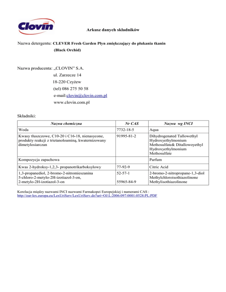 Arkusz danych składników Nazwa detergentu: CLEVER Fresh Garden Płyn zmiękczający do płukania tkanin (Black Orchid) Nazwa producenta: „CLOVIN” S.A. ul. Zarzecze 14 18-220 Czyżew (tel) 086 275 50 58 e-mail:[email protected] www.clovin.com.pl Składniki: Nazwa chemiczna Nr CAS Nazwa wg INCI Woda 7732-18-5 Aqua Kwasy tłuszczowe, C10-20 i C16-18, nienasycone, produkty reakcji z trietanoloaminą, kwaternizowany dimetylosiarczan 91995-81-2 Dihydrogenated Tallowethyl Hydroxyethylmonium Methosulfate& Ditallowoyethyl Hydroxyethylmonium Methosulfate Kompozycja zapachowa Parfum Kwas 2-hydroksy-1,2,3- propanotrikarboksylowy 77-92-9 Citric Acid 1,3-propanediol, 2-bromo-2-nitromieszanina 5-chloro-2-metylo-2H-izotiazol-3-on, 2-metylo-2H-izotiazol-3-on 52-57-1 2-bromo-2-nitropropane-1,3-diol Methylchloroisothiazolinone Methylisothiazolinone 55965-84-9 Korelacja między nazwami INCI nazwami Farmakopei Europejskiej i numerami CAS : http://eur-lex.europa.eu/LexUriServ/LexUriServ.do?uri=OJ:L:2006:097:0001:0528:PL:PDF