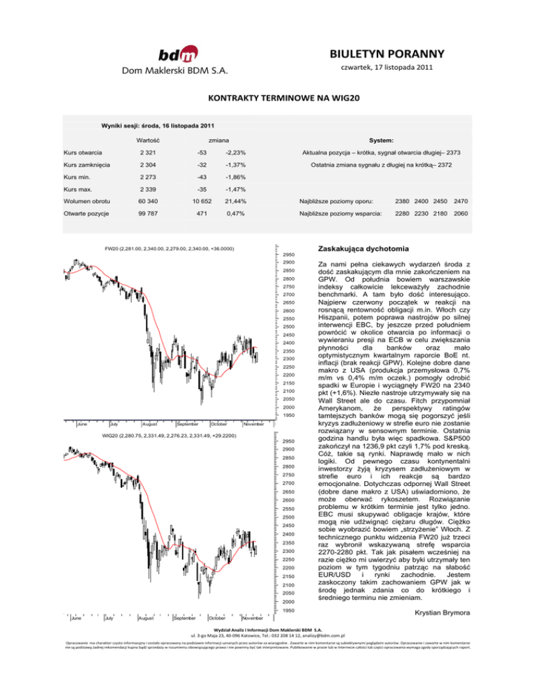 BIULETYN PORANNY czwartek, 17 listopada 2011 KONTRAKTY TERMINOWE NA WIG20 Wyniki sesji: środa, 16 listopada 2011 Wartość zmiana System: Kurs otwarcia 2 321 -53 -2,23% Aktualna pozycja – krótka, sygnał otwarcia długiej– 2373 Kurs zamknięcia 2 304 -32 -1,37% Ostatnia zmiana sygnału z długiej na krótką– 2372 Kurs min. 2 273 -43 -1,86% Kurs max. 2 339 -35 -1,47% Wolumen obrotu 60 340 10 652 21,44% Najbliższe poziomy oporu: 2380 2400 2450 2470 Otwarte pozycje 99 787 471 0,47% Najbliższe poziomy wsparcia: 2280 2230 2180 2060 FW20 (2,281.00, 2,340.00, 2,279.00, 2,340.00, +36.0000) 2950 2900 2850 2800 2750 2700 2650 2600 2550 2500 2450 2400 2350 2300 2250 2200 2150 2100 2050 2000 1950 June July August September October November D WIG20 (2,280.75, 2,331.49, 2,276.23, 2,331.49, +29.2200) 2950 2900 2850 2800 2750 2700 2650 2600 2550 2500 2450 2400 2350 2300 2250 2200 2150 2100 2050 2000 Zaskakująca dychotomia Za nami pełna ciekawych wydarzeń środa z dość zaskakującym dla mnie zakończeniem na GPW. Od południa bowiem warszawskie indeksy całkowicie lekceważyły zachodnie benchmarki. A tam było dość interesująco. Najpierw czerwony początek w reakcji na rosnącą rentowność obligacji m.in. Włoch czy Hiszpanii, potem poprawa nastrojów po silnej interwencji EBC, by jeszcze przed południem powrócić w okolice otwarcia po informacji o wywieraniu presji na ECB w celu zwiększania płynności dla banków oraz mało optymistycznym kwartalnym raporcie BoE nt. inflacji (brak reakcji GPW). Kolejne dobre dane makro z USA (produkcja przemysłowa 0,7% m/m vs 0,4% m/m oczek.) pomogły odrobić spadki w Europie i wyciągnęły FW20 na 2340 pkt (+1,6%). Niezłe nastroje utrzymywały się na Wall Street ale do czasu. Fitch przypomniał Amerykanom, że perspektywy ratingów tamtejszych banków mogą się pogorszyć jeśli kryzys zadłużeniowy w strefie euro nie zostanie rozwiązany w sensownym terminie. Ostatnia godzina handlu była więc spadkowa. S&P500 zakończył na 1236,9 pkt czyli 1,7% pod kreską. Cóż, takie są rynki. Naprawdę mało w nich logiki. Od pewnego czasu kontynentalni inwestorzy żyją kryzysem zadłużeniowym w strefie euro i ich reakcje są bardzo emocjonalne. Dotychczas odpornej Wall Street (dobre dane makro z USA) uświadomiono, że może oberwać rykoszetem. Rozwiązanie problemu w krótkim terminie jest tylko jedno. EBC musi skupywać obligacje krajów, które mogą nie udźwignąć ciężaru długów. Ciężko sobie wyobrazić bowiem „strzyżenie” Włoch. Z technicznego punktu widzenia FW20 już trzeci raz wybronił wskazywaną strefę wsparcia 2270-2280 pkt. Tak jak pisałem wcześniej na razie ciężko mi uwierzyć aby byki utrzymały ten poziom w tym tygodniu patrząc na słabość EUR/USD i rynki zachodnie. Jestem zaskoczony takim zachowaniem GPW jak w środę jednak zdania co do krótkiego i średniego terminu nie zmieniam. 1950 June July August September October November Krystian Brymora Wydział Analiz i Informacji Dom Maklerski BDM S.A. ul. 3‐go Maja 23, 40‐096 Katowice, Tel.: 032 208 14 12, [email protected] Opracowanie ma charakter czysto informacyjny i zostało opracowany na podstawie informacji uznanych przez autorów za wiarygodne . Zawarte w nim komentarze są subiektywnymi poglądami autorów. Opracowanie i zawarte w nim komentarze nie są podstawą żadnej rekomendacji kupna bądź sprzedaży w rozumieniu obowiązującego prawa i nie powinny być tak interpretowane. Publikowanie w prasie lub w Internecie całości lub części opracowania wymaga zgody sporządzających raport. BIULETYN PORANNY czwartek, 17 listopada 2011 RYNEK AKCJI Wyniki sesji: środa, 16 listopada 2011. Zmiana [%] Kurs min. Kurs max. Zakres wahań Wartość obrotów [mln PLN] 52 tygodnie Indeks Kurs otwarcia Kurs zamknięcia Kurs max. Kurs min. WIG20 2 942,4 2 019,0 2 280,75 2 331,49 1,27% 2 276,23 2 331,49 55,3 654,7 sWIG80 12 936,5 8 282,0 8 999,14 9 047,74 -0,03% 8 983,89 9 047,74 63,9 71,7 mWIG40 2 993,2 2 054,5 2 262,01 2 253,29 -0,52% 2 234,44 2 265,36 30,9 86,4 WIG PL 49 765,2 35 670,7 39 864,43 40 031,43 0,81% 39 753,45 40 031,43 278,0 - WIG 50 501,8 35 349,0 39 767,91 40 364,29 0,80% 39 699,81 40 364,29 664,5 832,5 Spółka Cena [PLN] ASSECOPOL zmiana % Mkt Cap [mln PLN] zmiana % względem WIG20 dzienna 1M 3M 6M dzienna 1M 3M 6M 1,0% 3,0% 21,6% -2,4% -0,3% 1,0% 24,0% 14,5% 47,90 3 715 BANK HANDLOWY 66,80 8 728 0,4% 2,5% -1,8% -31,0% -0,9% 0,5% 0,6% -14,1% BOGDANKA 111,60 3 796 -1,5% 7,6% 16,2% 2,9% -2,8% 5,6% 18,5% 19,8% BRE 263,00 11 073 0,4% 0,6% -4,0% -21,7% -0,9% -1,4% -1,7% -4,8% 7,74 5 666 2,2% -7,1% -13,5% -43,5% 1,0% -9,1% -11,2% -26,6% -30,6% GETIN GTC 9,25 2 029 6,3% -22,6% -29,1% -47,5% 5,1% -24,6% -26,7% JSW 90,35 10 770 1,0% -4,9% -15,5% - -0,3% -6,9% -13,1% - KERNEL 63,50 5 060 2,8% -3,8% -0,9% -13,8% 1,5% -5,8% 1,5% 3,1% KGHM 170,90 34 180 0,0% 17,5% 4,1% -3,4% -1,3% 15,5% 6,4% 13,5% LOTOS 28,56 3 709 2,0% 9,4% -17,2% -37,2% 0,7% 7,4% -14,9% -20,3% PBG 83,00 1 186 -3,9% 3,6% -16,2% -38,9% -5,2% 1,6% -13,9% -22,0% PEKAO 140,60 36 889 1,0% -0,3% 3,4% -17,3% -0,3% -2,3% 5,7% -0,4% PGE 19,58 36 610 3,1% -1,2% -6,5% -18,4% 1,8% -3,2% -4,2% -1,5% PGNIG 4,03 23 777 1,5% 2,8% 4,4% -2,7% 0,2% 0,8% 6,7% 14,2% PKNORLEN 39,25 16 788 2,0% 0,6% 0,6% -22,4% 0,7% -1,4% 3,0% -5,5% PKOBP 33,51 41 888 1,5% -4,1% -10,4% -23,6% 0,3% -6,1% -8,0% -6,7% PZU 324,00 27 978 2,5% 3,2% -7,2% -15,4% 1,3% 1,2% -4,8% 1,5% TAURON 5,38 9 429 0,9% 0,9% -0,4% -14,7% -0,3% -1,1% 2,0% 2,2% TPSA 17,65 23 574 -0,1% 6,1% 8,2% -1,9% -1,4% 4,1% 10,6% 15,0% TVN 9,90 3 403 0,5% -29,5% -19,9% -40,0% -0,8% -31,5% -17,6% -23,1% Komentarz po sesji Komentarz przed sesją: Relatywna siła przy ograniczonych obrotach Rynek patrzy na dług Środa na naszym parkiecie upływała pod znakiem dość mocno zaznaczonego optymizmu. Co ważne, miał on charakter wewnętrzny. Na starcie pojawiło się małe ułatwienie w postaci niższego otwarcia w pobliżu okolic krótkoterminowego wsparcia (mi