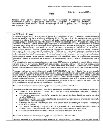 Aneks do Prospektu Emisyjnego ELEKTROBUDOWY Spółka Akcyjna Katowice, 11 grudnia 2007 r. ANEKS Niniejszy aneks zawiera zmiany, które zostały wprowadzone do Prospektu Emisyjnego Elektrobudowy Spółka Akcyjna (dalej, odpowiednio, „Prospekt”, „Spółka” lub „Emitent”), zatwierdzonego przez Komisję Nadzoru Finansowego w dniu 5 grudnia 2007 r., decyzją nr DEM/410/215/14/07 1 str.94-95, pkt 13.1 było: W zakresie monitorowania bieżącej sytuacji ekonomiczno-finansowej w Spółce prowadzona jest comiesięczna prognoza wyników – zarówno w zakresie oddziałów, jak i spółki jako całości. Po każdym miesiącu na bazie wykonania wyników finansowych i informacji od służb marketingowych tworzona jest trzymiesięczna, krocząca prognoza obejmująca przewidywane wyniki finansowe przedsiębiorstwa. Prognozowanie odbywa się cyklicznie, co miesiąc i jest to weryfikacja zakładanych w budżecie celów i zadań do wykonania. W ramach comiesięcznego przeglądu działalności gospodarczej analizowane są wszelkie aspekty sytuacji marketingowohandlowej pozyskiwanych zamówień, a także możliwości pozyskiwania zamówień w przyszłości. Comiesięcznej analizie podlega również portfel pozyskanych zamówień pod kontem czasu realizacji, zapewnienie do tego odpowiednich środków itp.. Podobnie we wszystkich aspektach analizowane są przychody i koszty przedsiębiorstwa. Spółka posiada wysoko rozwinięty system rachunku kosztów, obejmujący możliwość rozliczania zarówno kontraktów budowlano-montażowych, jak i zleceń produkcyjnych. Prowadzona wielostopniowa analiza marż pozwala zidentyfikować we wszystkich aspektach zagadnienia dotyczące rentowności dużego przedsiębiorstwa. Wyliczenia te odzwierciedlają najlepszą wiedzę, przewidywania i plany Zarządu. Przy sporządzaniu prognozy roku założono, że do końca 2007 roku nie zmienią się w sposób istotny obecne warunki rynkowe prowadzenia działalności gospodarczej, sytuacja walutowa jak również uregulowania prawne, podatkowe i administracyjne. Przyjęto także, iż nie będą miały miejsca wydarzenia, które w sposób istotny mogłyby ograniczyć popyt na produkty i usługi oferowane przez Emitenta oraz jego Grupę Kapitałową. Prognoza, zarówno w części dotyczącej spółki ELEKTROBUDOWA SA, jak i Kruelta Sp. z o.o. została przygotowana przy uwzględnieniu zasad rachunkowości, które Emitent stosuje w sprawozdaniach finansowych za lata ubiegłe – zgodnie z Międzynarodowymi Standardami Sprawozdawczości Finansowej (MSSF), wydanymi przez Radę Międzynarodowych Standardów Rachunkowości (IASB), zatwierdzonymi przez Unię Europejską. Istotną zmianą w stosunku do lat ubiegłych jest zmiana metodologii konsolidacji wyników finansowych w ramach Grupy Kapitałowej – w związku ze zmniejszeniem udziałów Emitenta w Kruelta Sp. zo.o. z 51% do 49%, metoda pełna została zastąpiona metodą praw własności. Założenia do prognozowanych informacji finansowych niezależne od Emitenta Czynnikami niezależnymi od Emitenta i jego Grupy Kapitałowej, uwzględnianymi w przygotowaniu prognoz są: • pozyskanie przez Emitenta z emisji Akcji serii D środków planowanej wielkości i zgodnie z założeniami harmonogramu; • brak istotnego wzrostu cen materiałów i surowców jak również płac bezpośrednich w okresie wrzesień – grudzień 2007 roku; • brak zmian warunków prowadzenia działalności gospodarczej, w szczególności uregulowań prawnych, podatkowych i administracyjnych; • stabilność na rynkach walutowych oraz brak zmian stóp procentowych kredytów udzielonych ELEKTROBUDOWA SA; • brak zdarzeń wynikających z sytuacji lub decyzji dostawców i odbiorców o znacznym udziale w obrotach spółek Grupy Kapitałowej, które mogłyby mieć istotny wpływ na wynik netto; • brak zdarzeń nadzwyczajnych, które mogłyby mieć istotny wpływ na wynik netto. Założenia do prognozowanych informacji finansowych zależne od Emitenta Założenia przyjęte przy przygotowywaniu prognozy, na które Emitent ma wpływ lub częściowy wpływ, Aneks do Prospektu Emisyjnego ELEKTROBUDOWY Spółka Akcyjna obejmują: • dane rzeczywiste ELEKTROBUDOWA SA za 8 miesięcy 2007 roku (za okres styczeń – sierpień 2007 roku), obejmujące zafakturowane przychody ze sprzedaży w wysokości 363,1 mln zł jak również portfel zamówień wielkości 561,0 mln zł, z czego 283,3 mln zł przeznaczone do realizacji w 2007 roku; • pozyskanie w okresie wrzesień – grudzień 2007 roku przez ELEKTROBUDOWA SA zamówień bieżących, do realizacji i zafakturowania w bieżącym okresie, w wysokości około 11 mln zł; • znaczące zwiększenie udziału podwykonawców w wykonywaniu robót budowlano – montażowych. Wzrost kosztów podwykonawców o 89,3% w stosunku do 2006 roku. • zmniejszenie kosztów sprzedaży i ogólnego zarządu w wyniku programu oszczędnościowego – spadek o 2,4% w stosunku do 2006 roku; • osiągnięcie marży zysku ze sprzedaży na poziomie 5,75%, czyli 1,54 punktu procentowego więcej niż w 2006 roku; • spłata zobowiązań z tytułu kredytów i pożyczek zgodnie z wcześniej przyjętymi harmonogramami; • osiągnięcie marży brutto w wysokości 5,48%, czyli 1,43 punktu procentowego więcej niż w 2006 roku; • efektywna stopa podatkowa w wysokości 20,7%, na poziomie podobnym do lat 2005 – 2006; • konsekwentna realizacja celów strategicznych Grupy Kapitałowej ELEKTROBUDOWA SA oraz zgodna z przyjętym planem realizacja celów emisji akcji. str.94-95, pkt 13.1 jest: W zakresie monitorowania bieżącej sytuacji ekonomiczno-finansowej w Spółce prowadzona jest comiesięczna prognoza wyników – zarówno w zakresie oddziałów, jak i spółki jako całości. Po każdym miesiącu na bazie wykonania wyników finansowych i informacji od służb marketingowych tworzona jest trzymiesięczna, krocząca prognoza obejmująca przewidywane wyniki finansowe przedsiębiorstwa. Progn