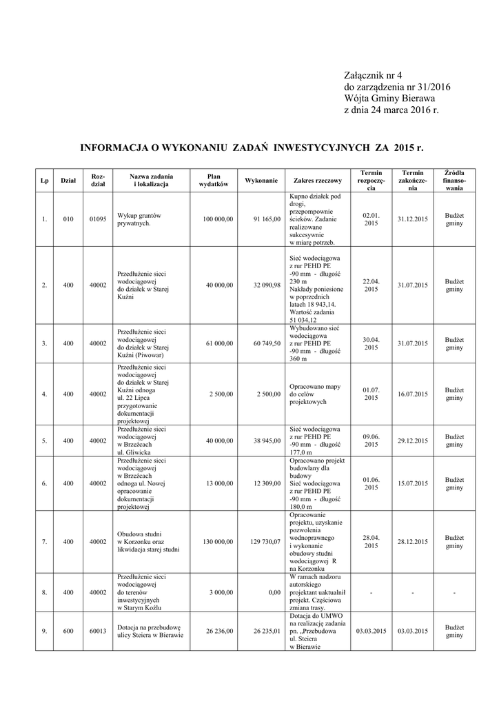 Załącznik nr 4 do zarządzenia nr 31/2016 Wójta Gminy Bierawa z dnia 24 marca 2016 r. INFORMACJA O WYKONANIU ZADAŃ INWESTYCYJNYCH ZA 2015 r. Lp 1. 2. 3. 4. Dział 010 400 400 400 Rozdział 01095 Nazwa zadania i lokalizacja Wykup gruntów prywatnych. Plan wydatków 100 000,00 Wykonanie 91 165,00 40002 Przedłużenie sieci wodociągowej do działek w Starej Kuźni 40 000,00 32 090,98 40002 Przedłużenie sieci wodociągowej do działek w Starej Kuźni (Piwowar) 61 000,00 60 749,50 2 500,00 2 500,00 40002 Przedłużenie sieci wodociągowej do działek w Starej Kuźni odnoga ul. 22 Lipca przygotowanie dokumentacji projektowej Przedłużenie sieci wodociągowej w Brzeźcach ul. Gliwicka Przedłużenie sieci wodociągowej w Brzeźcach odnoga ul. Nowej opracowanie dokumentacji projektowej 5. 400 40002 6. 400 40002 7. 400 40002 Obudowa studni w Korzonku oraz likwidacja starej studni 8. 400 40002 Przedłużenie sieci wodociągowej do terenów inwestycyjnych w Starym Koźlu 9. 600 60013 Dotacja na przebudowę ulicy Steiera w Bierawie 40 000,00 38 945,00 13 000,00 12 309,00 130 000,00 129 730,07 3 000,00 0,00 26 236,00 26 235,01 Zakres rzeczowy Kupno działek pod drogi, przepompownie ścieków. Zadanie realizowane sukcesywnie w miarę potrzeb. Sieć wodociągowa z rur PEHD PE -90 mm - długość 230 m Nakłady poniesione w poprzednich latach 18 943,14. Wartość zadania 51 034,12 Wybudowano sieć wodociągowa z rur PEHD PE -90 mm - długość 360 m Opracowano mapy do celów projektowych Sieć wodociągowa z rur PEHD PE -90 mm - długość 177,0 m Opracowano projekt budowlany dla budowy Sieć wodociągowa z rur PEHD PE -90 mm - długość 180,0 m Opracowanie projektu, uzyskanie pozwolenia wodnoprawnego i wykonanie obudowy studni wodociągowej R na Korzonku W ramach nadzoru autorskiego projektant uaktualnił projekt. Częściowa zmiana trasy. Dotacja do UMWO na realizację zadania pn. „Przebudowa ul. Steiera w Bierawie Termin rozpoczęcia Termin zakończenia Źródła finansowania 02.01. 2015 31.12.2015 Budżet gminy 22.04. 2015 31.07.2015 Budżet gminy 30.04. 2015 31.07.2015 Budżet gminy 01.07. 2015 16.07.2015 Budżet gminy 09.06. 2015 29.12.2015 Budżet gminy 01.06. 2015 15.07.2015 Budżet gminy 28.04. 2015 28.12.2015 Budżet gminy - - - 03.03.2015 03.03.2015 Budżet gminy 10. 600 60013 Dotacja na przygotowanie dokumentacji dot. budowy chodnika w miejscowości Lubieszów 11. 600 60014 Dotacja na przebudowę ul. Mickiewicza w Bierawie 20 000,00 20 000,00 12. 600 60016 Utwardzenie wjazdu na cmentarz - Fundusz Sołecki Stare Koźle 20 241,00 20 057,82 7 500,00 7 440,00 13. 14. 15. 600 600 600 60016 60016 Zakup wiat przystankowych do miejscowości Ortowice Przygotowanie dokumentacji do pozwolenia na budowę ul. Polna i ul. Leśna w Starym Koźlu 60016 Remont poprzez przebudowę nawierzchni jezdni i przebudowę chodnika na drodze gminnej - ul. Gliwickiej w Brzeźcach w celu poprawy bezpieczeństwa ruchu 30 000,00 27 060,00 30 000,00 30 000,00 719 000,00 700 222,08 7 000,00 6 150,00 16. 600 60016 Budowa chodnika ul. Nowe Osiedle w Bierawie przygotowanie dokumentacji 17. 600 60016 Budowa kanalizacji deszczowej ul. Kozielska w Dziergowicach 50 000,00 18 450,0 18. 600 60016 Przebudowa ul. Parkowej w Starej Kuźni 10 000,00 7 305,00 19. 600 60016 Przebudowa ul. Sosnowej w Dziergowicach 10 000,00 9 920,00 Dotacja do UMWO na opracowanie projektu budowlanego na zadanie pn. „Budowa chodnika przy drodze wojewódzkiej w Lubieszowie” Dotacja dla Satorostwa kędzierzyńskokozielskiego na realizację zadania pn. „Przebudowa ul. Mickiewicza w Bierawie” Utwardzono wjazd na cmentarz w Starym Koźlu. Powierzcnia wjazdu 129,0 m2 Zakupiono dwie wiaty przystankowe Opracowano podział działek na potrzeby budowy dróg gminnych ulica Polna i Leśna w Starym Koźlu. Wykonano przebudowę drogi ul. Gliwicka w Brzeźcach. Parametry drogi: długość-876,0 m szerokość 4,5-6,5 m Nakłady poniesione w poprzednich latach 7 995,00 Wartość całkowita 708 217,08 zł Opracowano projekt budowy chodnika przy drodze powiatowej ul. Nowe Osiedle w Bierawie. Parametry techniczne: długość - 816 m, szerokość 2,0-2,5 m Opracowano projekt odbudowy drogi i chodnika po budowie kanalizacji deszczowej ul.Kozielska w Dziergowicach Opracowano projekt przebudowy ul. Parkowej w Starej Kuźni. Parametry techniczne drogi: długość- 439,00 m, szerokość -3,5-5,0 m Opracowano projekt przebudowy ul. Sosnowej w Dziergowicach. Parametry techniczne drogi: długość- 427,00 m, szerokość -5,0 m 17.12.2015 03.03.2015 Budżet gminy 13.11.2015 13.11.2015 Budżet gminy 18.08.2015 24.08.2015 Budżet gminy 24.04.2015 05.05.2015 Budżet gminy 06.05.2015 20.12.2015 Budżet gminy 20.08.2015 16.11.2015 Budżet gminy 369 477,16 Budżet Państwa 330 744,92 01.07.2015 27.10.2015 Budżet gminy 14.12.2015 28.12.2015 Budżet gminy 20.10.2015 18.12.2015 Budżet gminy 01.09.2015 18.12.2015 Budżet gminy 20. 600 60016 Przebudowa ul. Dworcowej w Dziergowicach 201 000,00 200 611,71 12 000,00 8 535,00 21. 600 60017 Przebudowa drogi transportu rolnego w Dziergowicach (od ul. Kozielskiej do ul. Odrzańskiej) 22. 600 60017 Przebudowa drogi transportu rolnego Lubieszów - Bierawa 190 000,00 185 216,93 23. 600 60017 Przebudowa drogi do gruntów rolnych Bierawa - Stare Koźle 12 000,00 12 000,00 24. 750 75023 Zakup sprzętu komputerowego do Urzędu Gminy i GOPS 104 000,00 103 990,10 25. 750 75023 Rozbudowa parkingu przy Urzędzie Gminy 40 000,00 16 440,01 26. 750 75023 Montaż klimatyzacji w budynku Urzędu Gminy 110 000,00 106 579,50 27. 750 75023 Zakup centrali telefonicznej - sekretariat Urzędu Gminy 11 000,00 10 880,63 28. 750 75095 270 000,00 242 000,00 Zakup autobusu 29. 754 75412 Zakup samochodu pożarniczego typu lekkiego dla OSP Kotlarnia 30. 801 80101 Budowa boisk szkolnych - wykonanie dokumentacji 110 000,00 110 000,00 14 000,00 13 530,00 Opracowano projekt przebudowy ul. Dworcowej w Dziergowicach. Parametry techniczne drogi: długość - 361,00 m, sz