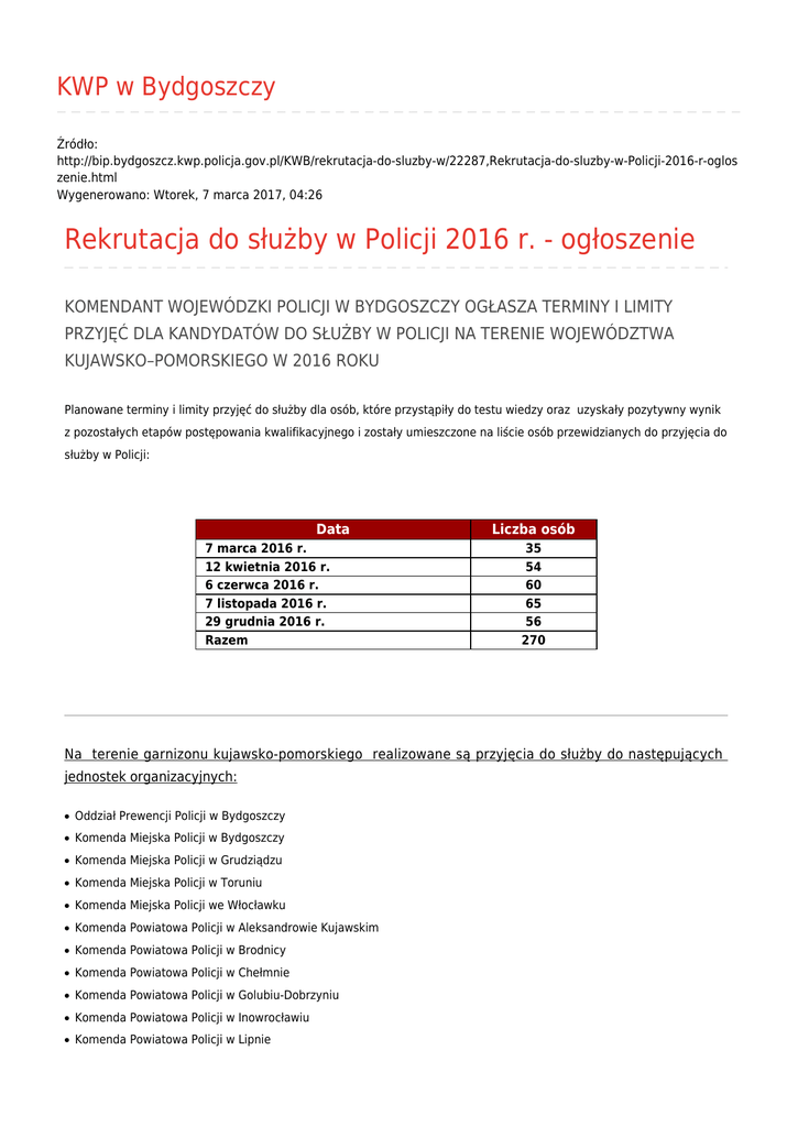 KWP w Bydgoszczy Źródło: http://bip.bydgoszcz.kwp.policja.gov.pl/KWB/rekrutacja-do-sluzby-w/22287,Rekrutacja-do-sluzby-w-Policji-2016-r-oglos zenie.html Wygenerowano: Wtorek, 7 marca 2017, 04:26 Rekrutacja do służby w Policji 2016 r. - ogłoszenie KOMENDANT WOJEWÓDZKI POLICJI W BYDGOSZCZY OGŁASZA TERMINY I LIMITY PRZYJĘĆ DLA KANDYDATÓW DO SŁUŻBY W POLICJI NA TERENIE WOJEWÓDZTWA KUJAWSKO–POMORSKIEGO W 2016 ROKU Planowane terminy i limity przyjęć do służby dla osób, które przystąpiły do testu wiedzy oraz uzyskały pozytywny wynik z pozostałych etapów postępowania kwalifikacyjnego i zostały umieszczone na liście osób przewidzianych do przyjęcia do służby w Policji: Data 7 marca 2016 r. 12 kwietnia 2016 r. 6 czerwca 2016 r. 7 listopada 2016 r. 29 grudnia 2016 r. Razem Liczba osób 35 54 60 65 56 270 Na terenie garnizonu kujawsko-pomorskiego realizowane są przyjęcia do służby do następujących jednostek organizacyjnych: ● Oddział Prewencji Policji w Bydgoszczy ● Komenda Miejska Policji w Bydgoszczy ● Komenda Miejska Policji w Grudziądzu ● Komenda Miejska Policji w Toruniu ● Komenda Miejska Policji we Włocławku ● Komenda Powiatowa Policji w Aleksandrowie Kujawskim ● Komenda Powiatowa Policji w Brodnicy ● Komenda Powiatowa Policji w Chełmnie ● Komenda Powiatowa Policji w Golubiu-Dobrzyniu ● Komenda Powiatowa Policji w Inowrocławiu ● Komenda Powiatowa Policji w Lipnie ● Komenda Powiatowa Policji w Mogilnie ● Komenda Powiatowa Policji w Nakle nad Notecią ● Komenda Powiatowa Policji w Radziejowie ● Komenda Powiatowa Policji w Rypinie ● Komenda Powiatowa Policji w Sępólnie Krajeńskim ● Komenda Powiatowa Policji w Świeciu ● Komenda Powiatowa Policji w Tucholi ● Komenda Powiatowa Policji w Wąbrzeźnie ● Komenda Powiatowa Policji w Żninie SŁUŻBĘ W POLICJI MOŻE PEŁNIĆ: ● obywatel polski o nieposzlakowanej opinii, który nie był skazany prawomocnym wyrokiem sądu za przestępstwo lub przestępstwo skarbowe, ● korzystający z pełni praw publicznych, ● posiadający co najmniej średnie wykształcenie, ● posiadający zdolność fizyczną i psychiczną do służby w formacjach uzbrojonych, podległych szczególnej dyscyplinie służbowej, której gotów jest się podporządkować, ● dający rękojmię zachowania tajemnicy stosownie do wymogów określonych w przepisach o ochronie informacji niejawnych. Ponadto mężczyźni powinni posiadać uregulowany stosunek do służby wojskowej, tj. odbyli zasadniczą służbę wojskową lub zostali przeniesieni do rezerwy. Metryczka Data wytworzenia 21.12.2015 Data publikacji 22.12.2015 Data modyfikacji 19.08.2016 Rejestr zmian Podmiot udostępniający informację: Biuletyn Informacji Publicznej Osoba wytwarzająca/odpowiadająca za informację: Komendant Wojewódzki Policji w Bydgoszczy nadinsp. Krzysztof Zgłobicki Osoba udostępniająca informację: Piotr Pawlaczyk Wydział Komunikacji Społecznej KWP w Bydgoszczy Osoba modyfikująca informację: Piotr Pawlaczyk