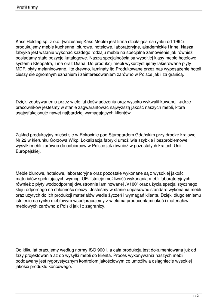 Profil firmy Kass Holding sp. z o.o. (wcześniej Kass Meble) jest firma działającą na rynku od 1994r. produkujemy meble kuchenne ,biurowe, hotelowe, laboratoryjne, akademickie i inne. Nasza fabryka jest wstanie wykonać każdego rodzaju meble na specjalne zamówienie jak również posiadamy stałe pozycje katalogowe. Nasza specjalnością są wysokiej klasy meble hotelowe systemu Kleopatra, Tina oraz Diana. Do produkcji mebli wykorzystujemy lakierowane płyty MDF, płyty melaninowane, lite drewno, laminaty itd.Produkowane przez nas wyposażenie hoteli cieszy sie ogromnym uznaniem i zainteresowaniem zarówno w Polsce jak i za granicą. Dzięki zdobywanemu przez wiele lat doświadczeniu oraz wysoko wykwalifikowanej kadrze pracowników jesteśmy w stanie zagwarantować najwyższą jakość naszych mebli, która usatysfakcjonuje nawet najbardziej wymagających klientów. Zakład produkcyjny mieści sie w Rokocinie pod Starogardem Gdańskim przy drodze krajowej Nr 22 w kierunku Gorzowa Wlkp. Lokalizacja fabryki umożliwia szybkie i bezproblemowe wysyłki mebli zarówno do odbiorców w Polsce jak również w pozostałych krajach Unii Europejskiej. Meble biurowe, hotelowe, laboratoryjne oraz pozostałe wykonane są z wysokiej jakości materiałów spełniających wymogi UE. Istnieje możliwość wykonania mebli laboratoryjnych również z płyty wodoodpornej dwustronnie laminowanej „V100” oraz użycia specjalistycznego kleju odpornego na chłonność cieczy. Jesteśmy w stanie dopasować standard wykonania mebli oraz użytych do ich produkcji materiałów wedle życzeń i wymagań klienta. Dzięki długoletniemu istnieniu na rynku meblowym współpracujemy z wieloma producentami okuć i materiałów meblowych zarówno z Polski jak i z zagranicy. Od kilku lat pracujemy według normy ISO 9001, a cała produkcja jest dokumentowana już od fazy projektowania az do wysyłki mebli do klienta. Proces wykonywania naszych mebli poddawany jest rygorystycznym kontrolom jakościowym co umożliwia osiągniecie wysokiej jakości produktu końcowego. 1/2 Profil firmy Przez wiele lat zdobyliśmy doświadczenie w produkcji i zaufanie wielu klientów, dzięki czemu dzisiaj jesteśmy w stanie konkurować nasza jakością, precyzja wykonania oraz satysfakcjonująca klienta cena. Oferujemy usługi na centrum obróbczym IMA !!!!! ZAPRASZAMY DO WSPÓŁPRACY !!! 2/2
