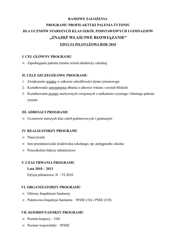 RAMOWE ZAŁOŻENIA PROGRAMU PROFILAKTYKI PALENIA TYTONIU DLA UCZNIÓW STARSZYCH KLAS SZKÓŁ PODSTAWOWYCH I GIMNAZJÓW „ZNAJDŹ WŁAŚCIWE ROZWIĄZANIE” EDYCJA PILOTAŻOWA ROK 2010 I. CEL GŁÓWNY PROGRAMU • Zapobieganie paleniu tytoniu wśród młodzieży szkolnej II. CELE SZCZEGÓŁOWE PROGRAMU 1. Zwiększenie wiedzy w zakresie szkodliwości dymu tytoniowego 2. Kształtowanie umiejętności dbania o zdrowie własne i swoich bliskich 3. Kształtowanie postaw asertywnych związanych z unikaniem czynnego i biernego palenia tytoniu III. ADRESACI PROGRAMU • Uczniowie starszych klas szkół podstawowych i gimnazjów IV. REALIZATORZY PROGRAMU • Nauczyciele • Inni przedstawiciele środowiska szkolnego, np. pielęgniarki szkolne • Przeszkoleni liderzy młodzieżowi V. CZAS TRWANIA PROGRAMU Lata 2010 – 2013 Edycja pilotażowa: II – VI.2010 VI. ORGANIZATORZY PROGRAMU • Główny Inspektorat Sanitarny • Państwowa Inspekcja Sanitarna – WSSE (16) i PSSE (318) VII. KOORDYNATORZY PROGRAMU • Poziom krajowy – GIS • Poziom wojewódzki – WSSE • Poziom lokalny – PSSE • Poziom szkolny – wytypowani koordynatorzy w szkołach VIII. PARTNERZY PROGRAMU • Ministerstwo Edukacji Narodowej • Stowarzyszenie na Rzecz Dzieciństwa Wolnego od Tytoniu • Inni (na poziomie wojewódzkim, powiatowym i lokalnym) IX. METODYKA REALIZACJI PROGRAMU • Przedstawienie oferty programowej dyrektorom szkół podstawowych w kraju: Edycja pilotażowa – liczba szkół na terenie PSSE wg wskazań z WSSE • Przeszkolenie i przygotowanie koordynatorów programu: - wojewódzkich Wykonawcy: GIS/WSSE Warszawa Termin realizacji: 4 – 6.XI.2009 - powiatowych Wykonawcy: WSSE Termin realizacji: I.2010 - szkolnych Wykonawcy: PSSE Termin realizacji: I-II.2010 X. DYSTRYBUCJA MATERIAŁÓW PROGRAMOWYCH - poziom krajowy - dystrybucja poradników, plakatów, ulotek do WSSE Wykonawcy: GIS/WSSE Olsztyn/WSSE Rzeszów Termin realizacji: XII.2009 - poziom wojewódzki – dystrybucja do PSSE Wykonawcy: WSSE Termin realizacji: XII.2009 – I.2010 - poziom lokalny – dystrybucja do szkół: Wykonawcy: PSSE Termin realizacji: I– II.2010 XI. REALIZACJA PROGRAMU W SZKOŁACH • Poinformowanie pracowników szkół o sposobie realizacji programu w placówce: Wykonawcy: szkolny koordynator programu Termin realizacji: I-II.2010 • Poinformowanie rodziców uczniów o o sposobie przeprowadzenia programu w szkołach i współdziałanie z rodzicami: - spotkanie z rodzicami - list do rodziców - inne formy wg możliwości Wykonawcy: dyrektorzy szkół i nauczyciele Termin realizacji: II.2010 • Poinformowanie uczniów o sposobie realizacji programu w szkołach oraz przeszkolenie i przygotowanie liderów młodzieżowych do współrealizacji programu. Wykonawcy: dyrektorzy szkół i nauczyciele Termin realizacji: II.2010 • Przeprowadzenie zajęć warsztatowych z uczniami wg zaproponowanych scenariuszy zajęć: - Zajęcia 1. Poznajmy się bliżej - Zajęcia 2. Laboratorium ciała - Zajęcia 3. Naucz się mówić „nie” - Zajęcia 4. Znajdź właściwe rozwiązanie - Zajęcia 5. Uwierz w siebie Wykonawcy: szkolni koordynatorzy programu; inni przedstawiciele środowiska szkolnego; specjaliści zaproszeni z zewnątrz; Termin realizacji: II – VI.2010 • Realizacja zajęć z rodzicami i opiekunami uczniów według autorskich projektów w szkołach Wykonawcy: szkolni koordynatorzy; inni przedstawiciele środowiska szkolnego; specjaliści zaproszeni z zewnątrz; Termin realizacji: II – VI.2010 XII. NADZOROWANIE I MONITOROWANIE REALIZACJI PROGRAMU Wykonawcy: WSSE/PSSE Termin realizacji: II – VI.2010 XIII. PODSUMOWANIE I OCENA REALIZACJI EDYCJI PILOTAŻOWEJ PROGRAMU Dokonanie podsumowania i oceny z uwzględnieniem następujących wskaźników: • liczby szkół, które wprowadziły program • liczby uczniów, którzy uczestniczyli w programie • liczby szkół, które powiadomiły rodziców o realizacji programu • liczby rodziców, którzy uczestniczyli w programie • liczby realizatorów programu w szkołach (z podaniem stanowiska/zawodu realizatora, np.: dyrektorzy szkół, pedagodzy, nauczyciele zajęć przedmiotowych, lekarze, pielęgniarki, psychologowie) • liczby przeszkolonych osób: - na poziomie wojewódzkim - na poziomie powiatowym • wydanie dodatkowych materiałów oświatowo-zdrowotnych i pomocy dydaktycznych integralnie związanych z programem • zaobserwowanych efektów w zmianie postaw i zachowań uczniów i ich rodziców • pozyskanie lokalnych partnerów, sojuszników, darczyńców na rzecz realizacji działań programowych (rodzaj udzielonego wsparcia) • liczba i rodzaj informacji na tema realizacji programu w środkach masowego przekazu Wykonawcy: WSSE/PSSE/szkoły Termin realizacji: II – VI.2010 XIV. OPRACOWANIE SPRAWOZDANIA Z REALIZACJI PROGRAMU Wykonawcy: WSSE/PSSE/szkoły Termin realizacji: do 31.VII.2010 XV. PRZYGOTOWANIE I UDOSKONALENIE I EDYCJI PROGRAMU (ROK SZKOLNY 2010/2011) Wykonawcy: GIS Termin realizacji: 1-31.VIII.2010
