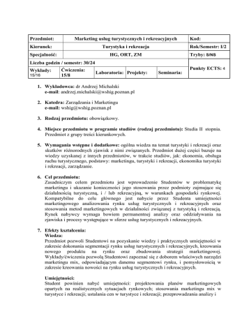 Przedmiot: Marketing usług turystycznych i rekreacyjnych Kierunek: Turystyka i rekreacja Specjalność: Kod: Rok/Semestr: I/2 HG, ORT, ZM Tryby: S/NS Liczba godzin / semestr: 30/24 Wykłady: 15/16 Ćwiczenia: 15/8 Punkty ECTS: 4 Laboratoria: Projekty: Seminaria: 1. Wykładowca: dr Andrzej Michalski e-mail: [email protected] 2. Katedra: Zarządzania i Marketingu e-mail: [email protected] 3. Rodzaj przedmiotu: obowiązkowy. 4. Miejsce przedmiotu w programie studiów (rodzaj przedmiotu): Studia II stopnia. Przedmiot z grupy treści kierunkowych. 5. Wymagania wstępne i dodatkowe: ogólna wiedza na temat turystyki i rekreacji oraz skutków róŜnorodnych zjawisk z nimi związanych. Przedmiot duŜej części bazuje na wiedzy uzyskanej z innych przedmiotów, w trakcie studiów, jak: ekonomia, obsługa ruchu turystycznego, podstawy: marketingu, turystyki i rekreacji, ekonomika turystyki i rekreacji, zarządzanie. 6. Cel przedmiotu: Zasadniczym celem przedmiotu jest wprowadzenie Studentów w problematykę marketingu i ukazanie konieczności jego stosowania przez podmioty zajmujące się działalnością turystyczną, i / lub rekreacyjną, w warunkach gospodarki rynkowej. Kompatybilne do celu głównego jest nabycie przez Studenta umiejętności marketingowego analizowania rynku usług turystycznych i rekreacyjnych oraz stosowania metod marketingowych w działalności związanej z turystyką i rekreacją. Rynek nabywcy wymaga bowiem permanentnej analizy oraz oddziaływania na zjawiska i procesy występujące w sferze usług turystycznych i rekreacyjnych. 7. Efekty kształcenia: Wiedza: Przedmiot pozwoli Studentowi na pozyskanie wiedzy i praktycznych umiejętności w zakresie dokonania segmentacji rynku usług turystycznych i rekreacyjnych, kreowania nowego produktu na rynku oraz zbudowania strategii marketingowej. Wykłady/ćwiczenia pozwolą Studentowi zapoznać się z doborem właściwych narzędzi marketingu mix, odpowiadającym danemu segmentowi rynku, i pomysłowością w zakresie kreowania nowości na rynku usług turystycznych i rekreacyjnych. Umiejętności: Student powinien nabyć umiejętności: projektowania planów marketingowych opartych na realistycznych sytuacjach rynkowych; stosowania marketingu mix w turystyce i rekreacji; ustalania cen w turystyce i rekreacji; przeprowadzania analizy i oceny sytuacji na rynku usług turystycznych i rekreacyjnych; przeprowadzenia badań marketingowych w turystyce i rekreacji; budowania strategii rynkowych określających obszary i kierunków rozwoju turystyki i rekreacji. Inne kompetencje (personalne i społeczne) – Motywacja do przyjęcia postawy prokonsumenckiej w świadczeniu usług turystycznych i rekreacyjnych. – Stosowanie metod marketingowych w działalności turystycznej i rekreacyjnej. – Sprawność w marketingowej analizie rynku usług turystycznych i rekreacyjnych. – Otwartość na modele konsumpcji w turystyce i rekreacji – tendencje zmian. 8. Metody dydaktyczne: – Ćwiczenia aktywizujące w małych grupach. – Krytyczna dyskusja w grupie na temat problematyki marketingu usług w turystyce i rekreacji. – Analiza przypadku, studium przypadku. – Wykłady z prezentacjami multimedialnymi. 9. Forma i warunki zaliczenia przedmiotu, w tym zasady dopuszczenia do egzaminu, zaliczenia z przedmiotu, a takŜe formę i warunki zaliczenia poszczególnych form zajęć wchodzących w zakres danego przedmiotu: zaliczenie pisemne z treści przekazanych na wykładzie i z literatury obowiązkowej, praca tematyczna lub prezentacja, frekwencja, aktywność – zatem; a) Student w trakcie semestru zobowiązany jest do: – napisania jednej pracy tematycznej lub przygotowania prezentacji. – zaprezentowania – w ramach ćwiczeń – praktycznego zastosowania zdobytej wiedzy, – uczęszczania na zajęcia i aktywnego w nich uczestnictwa. b) Podstawą zaliczenia wykładów, ćwiczeń, pracy tematycznej lub prezentacji, jest uzyskanie minimum oceny dostatecznej. c) W przypadku nieobecności, usprawiedliwionej, Student zobowiązany jest do zaliczenia ćwiczeń, pracy tematycznej oraz materiału z wykładanego przedmiotu, w ustalonym czasie i w uzgodnieniu z prowadzącym zajęcia. Wykładowca udzieli Studentowi wszelkich wskazówek, w zakresie np. przyswojenia partii materiału, dostępnej literatury oraz konsultacji, w czasie pełnionych dyŜurów. 10. Elementy składowe oceny końcowej: dla wykładów: zaliczenie pisemne, lub po uzgodnieniu z Wykładowcą ustne, 100%, dla ćwiczeń: praca tematyczna lub prezentacja, aktywne uczestnictwo i obecność. Oceny uzaleŜnione będą od zaprezentowania wiedzy i oryginalności opracowania, wykazanego zaangaŜowania i kreatywności, a ocena końcowa będzie stanowiła średnią. 11. Całkowity nakład pracy studenta potrzebny do osiągnięcia efektów w godzinach: – Czas na lektury i przygotowanie się do wykładów / ćwiczeń, 20 godz. – Czas na przygotowanie pracy tematycznej/prezentacji, 10 godz. – Czas na przygotowanie się do egzaminu, 20 godz. Razem 50 godzin. 12. Treści merytoryczne przedmiotu: 1. Istota, pojęcie i cele marketingu. Koncepcje marketingu usług. 2. Podmioty rynku usług turystycznych i rekreacyjnych. 3. Procedury segmentacji rynku. 4. Marketing miejscowości turystycznych. Zastosowanie marketingu mix w turystyce i rekreacji. 5. Istota produktu turystycznego - jego konceptualizacja, strukturyzacja, komercjalizacja i realizacja. Cykl Ŝycia produktu. 6. Marketingowa polityka cen usług turystycznych i rekreacyjnych. 7. Kanały dystrybucji usług turystycznych i rekreacyjnych. 8. Promocja w turystyce i rekreacji. 9. Personel i jego rola w realizacji wyznaczonych celów marketingowych. 10. Badania marketingowe - metody analizy otoczenia konkurencyjnego. 11. Podstawowe rodzaje strategii marketingowych w turystyce i rekreacji i ich implementacja. 12. Wykaz literatury podstawowej i uzupełniającej, obowiązującej do zaliczenia danego przedmiotu: Literatura obowiązkowa: 1. Al