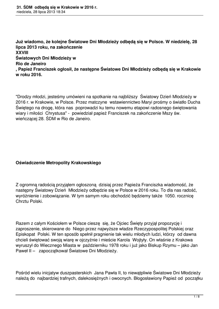 31. ŚDM odbędą się w Krakowie w 2016 r. niedziela, 28 lipca 2013 18:34 Już wiadomo, że kolejne Światowe Dni Młodzieży odbędą się w Polsce. W niedzielę, 28 lipca 2013 roku, na zakończenie XXVIII Światowych Dni Młodzieży w Rio de Janeiro , Papież Franciszek ogłosił, że następne Światowe Dni Młodzieży odbędą się w Krakowie w roku 2016. "Drodzy młodzi, jesteśmy umówieni na spotkanie na najbliższy Światowy Dzień Młodzieży w 2016 r. w Krakowie, w Polsce. Przez matczyne wstawiennictwo Maryi prośmy o światło Ducha Świętego na drogę, która nas poprowadzi ku temu nowemu etapowi radosnego świętowania wiary i miłości Chrystusa" - powiedział papież Franciszek na zakończenie Mszy św. wieńczącej 28. ŚDM w Rio de Janeiro. Oświadczenie Metropolity Krakowskiego Z ogromną radością przyjąłem ogłoszoną dzisiaj przez Papieża Franciszka wiadomość, że następny Światowy Dzień Młodzieży odbędzie się w Polsce w 2016 roku. To dla nas radość, wyróżnienie i zobowiązanie. W tym samym roku obchodzić będziemy także 1050. rocznicę Chrztu Polski. Razem z całym Kościołem w Polsce cieszę się, że Ojciec Święty przyjął propozycję i zaproszenie, skierowane do Niego przez najwyższe władze Rzeczypospolitej Polskiej oraz Episkopat Polski. W ten sposób spełnił pragnienie tak wielu młodych ludzi, którzy od dawna chcieli świętować swoją wiarę w ojczyźnie i mieście Karola Wojtyły. On właśnie z Krakowa wyruszył do Wiecznego Miasta w październiku 1978 roku i już jako Biskup Rzymu – jako Jan Paweł II – zapoczątkował Światowe Dni Młodzieży. Pośród wielu inicjatyw duszpasterskich Jana Pawła II, to niewątpliwie Światowe Dni Młodzieży należą do najbardziej trafnych, dalekosiężnych i owocnych. Błogosławiony Papież od początku 1/8 31. ŚDM odbędą się w Krakowie w 2016 r. niedziela, 28 lipca 2013 18:34 widział w młodych „«stróżów poranka» (por. Iz 21, 11-12), czuwających o świcie trzeciego tysiąclecia” (Tor Vergata, 19 VIII 2000). Już dzisiaj Polska i Kraków otwierają na oścież serca, by za trzy lata przyjąć młodych pielgrzymów z Papieżem Franciszkiem na czele. Wyrażamy wdzięczność Ojcu Świętemu za jego decyzję odwiedzenia ojczyzny błogosławionego, a wkrótce świętego Jana Pawła II, i przeżycia ze „stróżami poranka” ich święta w Krakowie. Ojcze Święty Franciszku, czekamy na Ciebie oraz na Twoich i naszych młodych przyjaciół z całego świata. Stanisław kardynał Dziwisz Arcybiskup Metropolita Krakowski Rio de Janeiro, 28 lipca 2013 *** Kraków – miasto Błogosławionego Jana Pawła II – przyjaciela młodzieży 2/8 31. ŚDM odbędą się w Krakowie w 2016 r. niedziela, 28 lipca 2013 18:34 Kraków i Małopolska to rodzinne strony Karola Wojtyły - Papieża Jana Pawła II. Stąd ruszył do Rzymu na konklawe, tu też najchętniej powracał we wspomnieniach i podczas pielgrzymek do Ojczyzny: „Tu, na tej ziemi się urodziłem. Tutaj, w Krakowie, spędziłem większość lat mojego życia (...) Tutaj też doznałem łaski powołania kapłańskiego (...). Tutaj też, w Katedrze Wawelskiej, otrzymałem konsekrację biskupią” – wspominał. Papież Jan Paweł II pochodził z Małopolski, tu dorastał, uczył się, tu także pełnił posługę kapłańską i biskupią aż do wyboru na papieża w dniu 16 października 1978 r. Wadowice, Niegowić, Kraków, Kalwaria Zebrzydowska, Zakopane - to miejsca, w których dorastał, stawał się człowiekiem, artystą i wreszcie wyjątkowym duszpasterzem. Karol Wojtyła urodził się w Wadowicach 18 maja 1920. Tu uczęszczał do gimnazjum, a w 1938 r. przeniósł się z ojcem do Krakowa, gdzie rozpoczął studia polonistyczne na Uniwersytecie Jagiellońskim. W 1942 r. wstąpił do tajnego Metropolitalnego Seminarium Duchownego w Krakowie, a święcenia kapłańskie uzyskał 1 listopada 1946 r. Następnie udał się do Rzymu, gdzie kontynuował studia do 1948 r. W tym samym roku, po powrocie do kraju, został na siedem miesięcy skierowany do niewielkiej parafii w Niegowici pod Krakowem. Potem był jednym z pionierów duszpasterstwa „turystycznego” młodzieży w parafii św. Floriana w Krakowie; wędrował z młodymi po górach, pływał na kajakach. Osobowość ks. Karola Wojtyły, umiejętność rozmawiania z młodymi, jego kazania przyciągały wielu. Szybko utworzyła się grupa osób, która nie tylko wspólnie uczestniczyła w liturgii (o godz. 6 rano!), ale także świętowała imieniny i chodziła na wycieczki. Zawsze towarzyszył im Wujek, jak nazwano ks. Karola. Z czasem wycieczki poza miasto przerodziły się w wyprawy w Bieszczady czy na kajaki na Mazury. Te wyprawy były w owych czasach zupełnie pionierskie. „Chodzi o to, ażeby umieć rozmawiać o wszystkim, o filmach, o książkach, o pracy zawodowej, o badaniach naukowych i o jazz-bandzie w sposób właściwy" – tłumaczył ks. Wojtyła. W kolejnych latach kontynuował studia teologiczne. W 1958 r. został mianowany biskupem. Wkrótce potem aktywnie uczestniczył w pracach przygotowawczych do Soboru Watykańskiego II oraz w samym soborze. Po śmierci arcybiskupa Eugeniusza Baziaka w 1963 r. został metropolitą krakowskim, a cztery lata później papież Paweł VI uczynił go kardynałem. Szybko stał się znanym nie tylko w Polsce autorytetem Kościoła, filozofem, myślicielem i teologiem. Karol Wojtyła, już jako metropolita krakowski, docenił znaczenie założonego przez ks. Franciszka Blachnickiego w 1969 roku młodzieżowego Ruchu „Światło i Życie”. Religijna 3/8 31. ŚDM odbędą się w Krakowie w 2016 r. niedziela, 28 lipca 2013 18:34 formacja zdobywana przez młodzież na letnich obozach zwanych oazami wzbudziła zaniepokojenie władz komunistycznych. Zaczęły się szykany i prześladowania. Wielu biskupów, by nie narażać Kościoła, z dystansem odnosiło się do ruchu ks. Blachnickiego. Dopiero oficjalne włączenie oaz p
