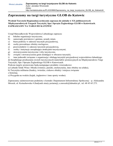 Zapraszamy na targi turystyczne GLOB do Katowic Autor: Jarosław Wnorowski Adres: http://wrotalubuskie.eu/PL/433/969/Zapraszamy_na_targi_turystyczne_GLOB_do_Katowic/k/ Zapraszamy na targi turystyczne GLOB do Katowic Wydział Turystyki Regionalnej serdecznie zaprasza do udziału w XX jubileuszowych Międzynarodowych Targach Turystyki, Spa i Sprzętu Żeglarskiego GLOB w Katowicach. ZAPRASZAMY NA TARGI DO KATOWIC Urząd Marszałkowski Województwa Lubuskiego zaprasza: a) lokalne organizacje turystyczne, b) samorządy powiatowe i gminne, urzędy miast, c) biura podróży w zakresie turystyki przyjazdowej, d) osoby prowadzące obiekty noclegowe, e) przewoźników w zakresie turystyki przyjazdowej, f) osoby i instytucje zarządzające atrakcjami turystycznymi, g) stowarzyszenia turystyczne i izby turystyczne, h) związki i stowarzyszenia gmin działające w obszarze turystyki, i) inne jednostki związane z organizacją i obsługą turystyki przyjazdowej województwa lubuskiego do bezpłatnego przekazania swoich turystycznych materiałów promocyjnych na Międzynarodowe Targi Turystyki, Spa i Sprzętu Żeglarskiego GLOB w Katowicach. Podczas targów promowane będą następujące produkty wizerunkowe: a) Lubuski Szlak Wina i Miodu (winnice, pasieki, enoturystyka, inne obiekty na szlaku), b) Turystyka militarna (bunkry, twierdze, ciekawe obiekty i miejsca związane z historią), c) Przygoda na wodzie (kajak, żeglarstwo i inne sporty wodne). Zapraszamy zainteresowane podmioty o kontakt: Departament Infrastruktury Społecznej – p. Aleksandra Mrozek, ul. Kożuchowska 4 (budynek straży pożarnej), [email protected] , tel. 68 45 65 273. strona 1 / 1 Powered by TCPDF (www.tcpdf.org)