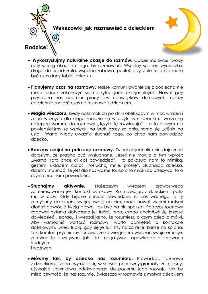 Wskazówki jak rozmawiać z dzieckiem Rodzice! Wykorzystujmy naturalne okazje do rozmów. Codzienne życie tworzy cały szereg okazji do tego, by rozmawiać. Wspólny spacer, wycieczka, droga do przedszkola, wspólna zabawa, posiłek przy stole to także może być czas dany tobie i dziecku. Planujemy czas na rozmowy. Nasze komunikowanie się z pociechą nie może jednak zakończyć się na sytuacjach okazjonalnych. Nawet gdy przytłacza nas nadmiar pracy czy obowiązków domowych, należy codziennie znaleźć czas na rozmowę z dzieckiem. Magia wieczoru. Kiedy nasz maluch po dniu obfitującym w moc wrażeń i zajęć ważnych dla niego znajdzie się w przytulnym łóżeczku, tworzą się najlepsze warunki do rozmowy „Języki się rozwiązują” – a to o czym nie powiedzieliśmy ze względu na brak czasy za dnia, samo się „ciśnie na usta”. Warto wtedy uważnie słuchać tego, co chce nam powiedzieć dziecko. Bądźmy czujni na potrzebę rozmowy. Dzieci niejednokrotnie dają znać dorosłym, że pragną być wysłuchane. Jeżeli nie mówią o tym wprost: „Mamo, tato chcę ci coś powiedzieć”, to pokazują nam to mimiką, gestem, układem ciała: „Posłuchaj mnie, proszę”. Słuchając dziecka, dajemy mu znać, że jest dla nas ważne to, co ono myśli i co przezywa, to o czym chce nam powiedzieć. Słuchajmy aktywnie. Najlepszym wyrazem prawdziwego zainteresowania jest kontakt wzrokowy. Rozmawiając z dzieckiem, patrz mu w oczy. Gdy będzie chciało powiedzieć ci coś ważnego, a ty zamyślony nie skupisz swojej uwagi na nim, może nawet swoimi małymi dłońmi odwrócić twoją głowę, tak być na nie spojrzał. Podczas rozmowy zadawaj pytania dotyczące jej treści, tego, czego chciałbyś się jeszcze dowiedzieć , potakuj i wyrażaj jasno, że rozumiesz, o czym dziecko mówi. Aby wzmocnić wartość rozmowy, warto pamiętać o kontakcie dotykowym. Dzieci lubią, gdy się je tuli, trzyma za rękę, bierze na kolana. Taki komfort psychiczny sprawia, że łatwiej jest im wyrażać swoje emocje, zarówno te pozytywne, jak i te negatywne, opowiadać o sprawach trudnych i ważnych. Mówmy tak, by dziecko nas rozumiało. Prowadząc rozmowę z dzieckiem, trzeba wyrażać się w sposób poprawny gramatycznie, jasny, używając słownictwa adekwatnego do poziomu jego rozwoju, tak by mieć pewność, że nas rozumie. Zwłaszcza w rozmowie z małym dzieckiem należy unikać moralizowania, długich, nużących wypowiedzi. Jest niemal pewne, że pociecha szybko się wtedy znudzi, a swoje zainteresowanie skieruje na inną czynność. Rozmawiając, wyrażajmy swoje uczucia. Rozmowa to czas, który warto wykorzystać na wyrażanie dziecku za pomocą słów tego, co do niego czujemy, pokazanie mu jak jest dla nas ważne. Nie bójmy się mówić: „kocham cię, słucham cię, lubię, gdy do mnie mówisz”. W rozmowie szukajmy rozwiązań ważnych sytuacji wychowawczych. Warto wykorzystać czas rozmowy na poruszenie trapiących nas problemów. Na przykład z pomocą bohaterów ciekawych książeczek, bajek możemy omówić to, co dziecko przeżywa, z czym ma problem. Możemy mu przekazać wtedy właściwe wzory postępowania i powiedzieć, czego od niego oczekujemy. Zabawa słowem. Nie ma lepszego wzorca do naśladowania jak mowa rodziców, wychowawców. Dbajmy o to, by dzieci prawidłowo artykułowały wyrazy, poprawnie budowały swoje wypowiedzi, wykorzystując do tego różnego rodzaju zabawy słowne, rymowanki, zagadki, wierszyki. Zobaczycie, ile radości sprawi nie tylko dzieciom.