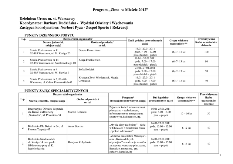 Program „Zima w Mieście 2012” Dzielnica: Ursus m. st. Warszawy Koordynator: Barbara Dudzińska - Wydział Oświaty i Wychowania Zastępca koordynatora: Norbert Pyza - Zespół Sportu i Rekreacji PUNKTY DZIENNEGO POBYTU L.p. Bezpośredni organizator Nazwa jednostki, Osoba odpowiedz./ miejsce zajęć nr tel. 1 Szkoła Podstawowa nr 11; 02-495 Warszawa, ul. M. Keniga 20 Dorota Porzezińska 2 Szkoła Podstawowa nr 14 02-495 Warszawa, ul. Sosnkowskiego 10 Kinga Frankiewicz, 3 Szkoła Podstawowa nr 4 02-495 Warszawa, ul. W. Sławka 9 Zofia Kościak 4 Szkoła Podstawowa nr 2, 02-496 Warszawa, ul. Orłów Piastowskich 47 Krystyna Zych Włodarczyk, Magda Grześczyk Dni i godziny prowadzonych zajęć Grupy wiekowe uczestników** Przewidywana liczba uczestników dziennie (6) 7- 13 lat 100 (6) 7- 13 lat 80 (6) 7- 13 lat 50 (6) 7- 13 lat 40 16.01-27.01.2011 godz. 7. 00 – 17.00 poniedziałek - piątek 16.01.- 20.01.2011 godz. 7.00 – 17.00 poniedziałek - piątek 23.01.-27.01.2011 godz. 7.00 – 17.00 poniedziałek - piątek 16.01-27.01.2011 godz. 7.00 – 17.00 poniedziałek - piątek PUNKTY ZAJĘĆ SPECJALISTYCZNYCH Grupy wiekowe uczestników** Przewidywana liczba uczestników dziennie 10 – 16 lat 30 6-12 lat 40 6-14 lat 40 Bezpośredni organizator L.p. 1 Nazwa jednostki, miejsce zajęć Integracyjny Ośrodek Wsparcia dla Dzieci i Młodzieży „Stokrotka”, ul. Prawnicza 54 2 Biblioteka Dla Dzieci nr 64 ; ul. Plutonu Torpedy 47 3 Biblioteka Niedzwiadek ul. Keniga 14 oraz punkt biblioteczny przy ul K. Jagiellończyka Osoba odpowiedz./ nr tel. Marcin Redzicki Anna Sieczka Gracjana Kobylińska Program* Dni i godziny (rodzaj proponowanych zajęć) prowadzonych zajęć Zajęcia w kolach zainteresowań plastyczno – technicznym, informatycznym, muzycznym, sportowym, kulinarnym, itp. „My się zimy nie boimy” – ferie w bibliotece z bohaterami filmu „Epoka Lodowcowa” „Zimowe szaleństwa Mikołaja”– oraz „Kraina dobrych obyczajów” – realizacja tematów za poprzez warsztaty plastyczne, literackie, muzyczne, gry, zabawy, karaoke, itp 16.01-27.01.2011 godz. 8.00- 16.00 pon. – piątek 16.01-27.01.2011 godz. 10.00 – 13.00 pon. – piątek 16.01-27.01.2011 godz. 10.00 – 13.00 pon. – piątek 1 „Czary mary z Harym Potterem” – projekcja filmu, czytanie fragmentów książki, magiczne zabawy 4 Biblioteka Skorosze ul. Dzieci Warszawy 27 A Barbara Haponiuk 5 Dom Kultury MIŚ ul. Zagłoby 17 Krystyna Kaczmarczyk Dom Kultury MIŚ ul. Zagłoby 17 Dom Kultury KOLOROWA ul. Sosnkowskiego 16 Dom Kultury KOLOROWA ul. Sosnkowskiego 16 Szkoła Podstawowa nr 11; 02-495 Warszawa, ul. M. Keniga 20 Szkoła Podstawowa nr 14 02-495 Warszawa, ul. Sosnkowskiego 10 Szkoła Podstawowa nr 4 02-495 Warszawa, ul. W. Sławka 9 Gimnazjum 131 02-495 Warszawa, ul.Drzymały 1 Gimnazjum 133 02-495 Warszawa, ul. Warszawska 63 Środowiskowe Ogniska Wychowawcze w Ursusie ul. Sosnkowskiego ul. Zagłoby Krzysztof Majkowski Rekreacja, ruch, sport: tenis stołowy Katarzyna Ludwiczak Warsztaty plastyczne Kinga Strzelecka Warsztaty rozwijające kreatywność 6 7 8 9 10 11 12 13 14 16.01-27.01.2011 godz. 10.00 – 13.00 pon. – piątek 6 - 12 lat 40 6-12 15 7-12 20 7-12 15 17;24;.01.2011 11-13.00 20 Zajęcia sportowe 16.01-27.01.2011 9.00-15.00 7-15 60 Zajęcia sportowe na sali gimnastycznej i lodowisku 16.01-27.01.2011 8.00-15.00 7-15 70 Dorota Miazga Zajęcia sportowe na sali gimnastycznej 16.01. – 20.01.2012 9.00-15.00 7-15 40 Michał Taras Zajęcia sportowe na hali gimnastycznej 16.01. – 27.01.2012 9.00 – 15.00 13 - 16 30 Mariusz Dłużniewski Zajęcia sportowe na hali sportowej 16.01. – 20.01.2012 9.00 – 15.00 13 - 16 20 Zajęcia plastyczne, Zajęcia kreatywne Gry i zabawy świetlicowe, quizy oraz konkursy `16.01-27.01.2012 11.00-16.00 13 - 16 30 Warsztaty plastyczne – w kręgu sztuki plastycznej Elżbieta Górka Agata Łopuszyńska Robert Faliszewski 23,24,26.01.2011 Godz. 10.00-11.00 11.00-12.00 16.01-27.01.2011 10.00 – 13.00 16;19;23;26.01.2011 godz. 11.00-13.00 OŚRODEK SPORTU I REKREACJI Obiekt (adres, telefon, L.p. osoba odpowiedzialna) Program dla uczestników indywidualnych (rodzaj proponowanych zajęć) Rodzaj zajęć Terminy zajęć i przedziały wiekowe Sposób rezerwacji lub rejestracji Zajęcia dla zorganizowanych grup z punktów dziennego pobytu Rodzaj zajęć Terminy zajęć dla grup zorganizowanych Przewidywana liczba uczestników Sposób rezerwacji lub dziennie rejestracji 2 Pływanie rekreacyjne, skoki do wody, piłka wodna, nurkowanie, gry i zabawy w wodzie Pływanie Pływalnia rekreacyjne, skoki Albatros, ul. Orląt do wody, piłka Lwowskich 1, wodna, nurkowanie, gry i zabawy w wodzie Pływalnia Skalar, ul. Sosnkowskiego 3, 1 2 w godz. 8.00 – 12.00 (ostatnie wejście o 11.00) Bez rezerwacji, rejestracja na listach w kasie Pływanie rekreacyjne, skoki do wody, piłka wodna, nurkowanie, gry i zabawy w wodzie Bez rezerwacji, rejestracja na listach w kasie Pływanie rekreacyjne, skoki do wody, piłka wodna, nurkowanie, gry i zabawy w wodzie w godz. 8.00 – 12.00 (ostatnie wejście o 11.00) 6 - 18 lat Rezerwacja telefoniczna 150 6 - 18 lat w godz. 8.00 – 12.00 (ostatnie wejście o 11.00) 6 - 18 lat w godz. 8.00 – 12.00 (ostatnie wejście o 11.00) 6 - 18 lat Rezerwacja telefoniczna 100 PUNKTY PROWADZĄCE DOŻYWIANIE L.p. 1 2 3 4 Bezpośredni organizator Nazwa i adres punktu Osoba odpowiedz./ nr tel. Szkoła Podstawowa nr 11; 02-495 Warszawa, ul. M. Dorota Porzezińska Keniga 20 Szkoła Podstawowa nr 14 02-495 Warszawa, ul. Kinga Frankiewicz Sosnkowskiego 10 Szkoła Podstawowa nr 4 02-495 Warszawa, ul. W. Zofia Kościak Sławka 9 Szkoła Podstawowa nr 2, 02496 Warszawa, ul. Orłów Krystyna Zych Włodarczyk Piastowskich 47 Okres działania punktu Rodzaj wydawanych posiłków 16.01-27.01.2011 posiłek obiadowy + podwieczorek Przewidywana liczba wydanych posiłków dziennie 100 posiłek obiadowy + podwieczorek 16.01-20.01.2011 80 posiłek obiadowy + podwieczorek 23.01-27.0