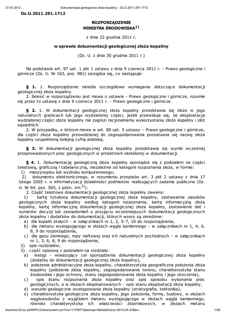 27.04.2012 Dokumentacja geologiczna złoża kopaliny. - Dz.U.2011.291.1712 Dz.U.2011.291.1712 ROZPORZĄDZENIE MINISTRA ŚRODOWISKA1) z dnia 22 grudnia 2011 r. w sprawie dokumentacji geologicznej złoża kopaliny (Dz. U. z dnia 30 grudnia 2011 r.) Na podstawie art. 97 ust. 1 pkt 1 ustawy z dnia 9 czerwca 2011 r. - Prawo geologiczne i górnicze (Dz. U. Nr 163, poz. 981) zarządza się, co następuje: § 1. 1. Rozporządzenie określa szczegółowe wymagania dotyczące dokumentacji geologicznej złoża kopaliny. 2. Ilekroć w rozporządzeniu jest mowa o ustawie - Prawo geologiczne i górnicze, rozumie się przez to ustawę z dnia 9 czerwca 2011 r. - Prawo geologiczne i górnicze. § 2. 1. W dokumentacji geologicznej złoża kopaliny przedstawia się złoże w jego naturalnych granicach lub jego wydzielonej części, jeżeli przewiduje się, że eksploatacja wydzielonej części złoża kopaliny nie zagrozi racjonalnemu wykorzystaniu złoża kopaliny i złóż sąsiednich. 2. W przypadku, o którym mowa w art. 89 ust. 5 ustawy - Prawo geologiczne i górnicze, dla części złoża kopaliny przewidzianej do zagospodarowania pozostawia się nazwę złoża kopaliny uzupełnioną kolejną cyfrą arabską. § 3. W dokumentacji geologicznej złoża kopaliny przedstawia się wyniki wcześniej przeprowadzonych prac geologicznych w przestrzeni określonej w dokumentacji. § 4. 1. Dokumentację geologiczną złoża kopaliny sporządza się z podziałem na części tekstową, graficzną i tabelaryczną, niezależnie od kategorii rozpoznania złoża, w formie: 1) maszynopisu lub wydruku komputerowego; 2) dokumentu elektronicznego, w rozumieniu przepisów art. 3 pkt 2 ustawy z dnia 17 lutego 2005 r. o informatyzacji działalności podmiotów realizujących zadania publiczne (Dz. U. Nr 64, poz. 565, z późn. zm.2)). 2. Część tekstowa dokumentacji geologicznej złoża kopaliny zawiera: 1) kartę tytułową dokumentacji geologicznej złoża kopaliny, zestawienie zasobów geologicznych złoża kopaliny według kategorii rozpoznania, kartę informacyjną złoża kopaliny, kartę informacyjną dokumentacji geologicznej złoża kopaliny, zestawienie dat i numerów decyzji lub zawiadomień o przyjęciu wcześniejszych dokumentacji geologicznych złoża kopaliny i dodatków do dokumentacji, których wzory są określone: a) dla kopalin stałych - w załącznikach nr 1, 2, 5-7, 10 do rozporządzenia, b) dla metanu występującego w złożach węgla kamiennego - w załącznikach nr 1, 4, 6, 8, 9 do rozporządzenia, c) dla gazu ziemnego, ropy naftowej oraz ich naturalnych pochodnych - w załącznikach nr 1, 3, 6, 8, 9 do rozporządzenia; 2) spis rozdziałów; 3) część opisową z podziałem na rozdziały: a) wstęp - wskazujący cel sporządzenia dokumentacji geologicznej złoża kopaliny (dodatku do dokumentacji geologicznej złoża kopaliny), b) położenie administracyjne złoża kopaliny, charakterystyka geograficzna położenia złoża kopaliny (położenie złoża kopaliny, zagospodarowanie terenu, charakterystyka stanu środowiska i jego ochrony, stanu zagospodarowania złoża kopaliny i jego otoczenia), c) opis stanu rozpoznania złoża kopaliny oraz opis sposobu wykonania prac geologicznych, a w złożach eksploatowanych - opis stanu eksploatacji złoża kopaliny, d) warunki geologiczne występowania złoża kopaliny (stratygrafia, tektonika), e) charakterystyka geologiczna złoża kopaliny, jego położenia, formy, budowy, w złożach węglowodorów z wyjątkiem metanu występującego w złożach węgla kamiennego, również charakterystyka ich właściwości zbiornikowych, w złożach metanu lexonline-02.lex.pl/WKPLOnline/content.rpc?nro=17759772&wersja=0&dataOceny=2012-04-27&tkn… 1/28 27.04.2012 Dokumentacja geologiczna złoża kopaliny. - Dz.U.2011.291.1712 występującego w złożach węgla kamiennego - charakterystyka metanonośności węgla i serii węglonośnej, f) charakterystyka rodzaju i jakości kopaliny głównej, kopalin towarzyszących, współwystępujących użytecznych pierwiastków śladowych i kopaliny współwystępującej wydobytej ze złoża węglowodorów, własności technologiczne kopalin oraz określenie możliwych kierunków ich wykorzystania, g) wyniki badań i charakterystyka warunków geologiczno-górniczych złoża kopaliny, w szczególności hydrogeologicznych, geologiczno-inżynierskich, gazowych i geotermicznych w zakresie niezbędnym do projektowania, prowadzenia i zakończenia eksploatacji oraz wykorzystania terenu po zakończeniu działalności górniczej i jego rekultywacji, a w złożach przewidzianych do podziemnego bezzbiornikowego magazynowania substancji i podziemnego składowania odpadów - w zakresie niezbędnym do projektowania takiej działalności, h) przedstawienie danych dotyczących budowy złoża kopaliny, warunków jego występowania, jakości kopaliny i właściwości skał otaczających, które powinny być uwzględnione przy ocenie wpływu eksploatacji na środowisko, występujących w złożu kopaliny substancji szkodliwych dla środowiska, oraz charakterystykę właściwości rekultywacyjnych skał płonnych, których wydobycie może być przewidywane, i) sposób określenia granic złoża kopaliny i jego parametrów przyjętych do obliczenia zasobów, uzasadnienie wyboru metody obliczenia zasobów oraz przyjęty sposób ich klasyfikacji z uwagi na stopień rozpoznania złoża kopaliny, j) przedstawienie zasobów złoża kopaliny głównej z podziałem na zasoby spełniające graniczne wartości parametrów definiujących złoże - bilansowe - i niespełniające pozabilansowe (w przypadku ich dokumentowania) - oraz kopalin towarzyszących, kopaliny współwystępującej wydobytej ze złoża węglowodorów, współwystępujących użytecznych pierwiastków śladowych, wraz z oceną dokładności ich oszacowania, k) rozliczenie zasobów złoża kopaliny w stosunku do zasobów wcześniej dokumentowanych i objaśnienie stwierdzonych różnic, l) 