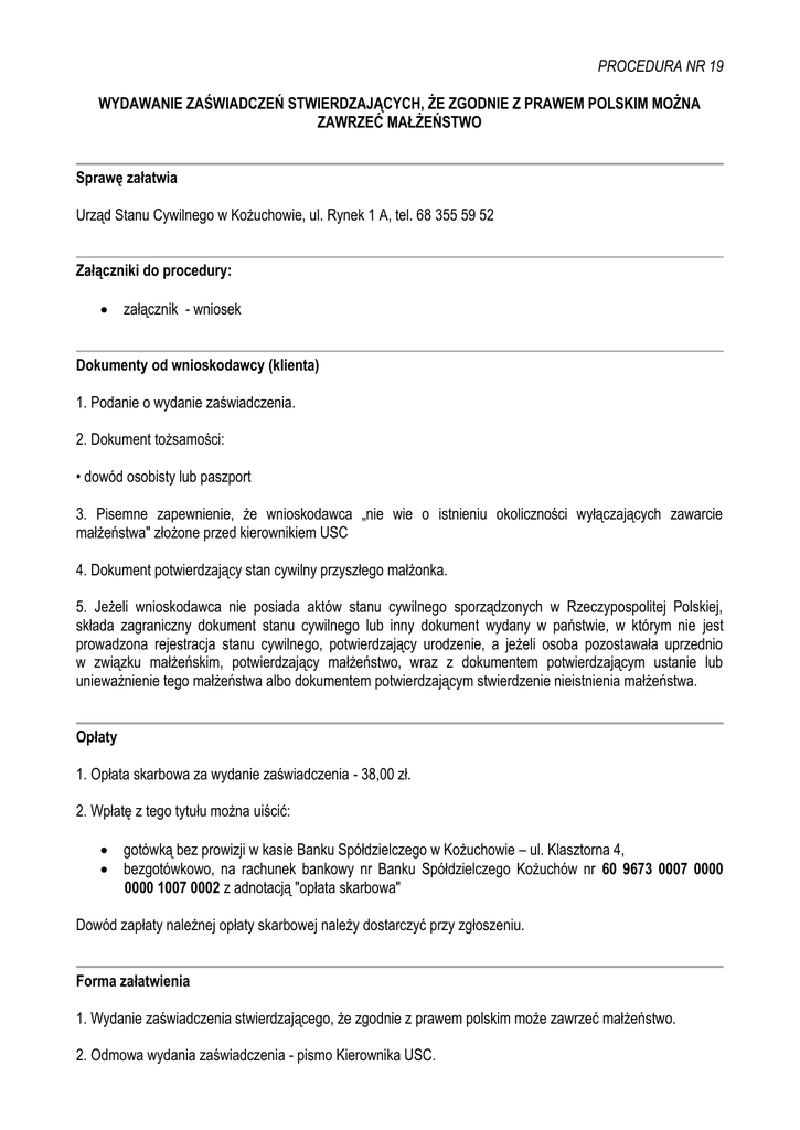 PROCEDURA NR 19 WYDAWANIE ZAŚWIADCZEŃ STWIERDZAJĄCYCH, ŻE ZGODNIE Z PRAWEM POLSKIM MOŻNA ZAWRZEĆ MAŁŻEŃSTWO Sprawę załatwia Urząd Stanu Cywilnego w Kożuchowie, ul. Rynek 1 A, tel. 68 355 59 52 Załączniki do procedury: załącznik - wniosek Dokumenty od wnioskodawcy (klienta) 1. Podanie o wydanie zaświadczenia. 2. Dokument tożsamości: • dowód osobisty lub paszport 3. Pisemne zapewnienie, że wnioskodawca „nie wie o istnieniu okoliczności wyłączających zawarcie małżeństwa" złożone przed kierownikiem USC 4. Dokument potwierdzający stan cywilny przyszłego małżonka. 5. Jeżeli wnioskodawca nie posiada aktów stanu cywilnego sporządzonych w Rzeczypospolitej Polskiej, składa zagraniczny dokument stanu cywilnego lub inny dokument wydany w państwie, w którym nie jest prowadzona rejestracja stanu cywilnego, potwierdzający urodzenie, a jeżeli osoba pozostawała uprzednio w związku małżeńskim, potwierdzający małżeństwo, wraz z dokumentem potwierdzającym ustanie lub unieważnienie tego małżeństwa albo dokumentem potwierdzającym stwierdzenie nieistnienia małżeństwa. Opłaty 1. Opłata skarbowa za wydanie zaświadczenia - 38,00 zł. 2. Wpłatę z tego tytułu można uiścić: gotówką bez prowizji w kasie Banku Spółdzielczego w Kożuchowie – ul. Klasztorna 4, bezgotówkowo, na rachunek bankowy nr Banku Spółdzielczego Kożuchów nr 60 9673 0007 0000 0000 1007 0002 z adnotacją "opłata skarbowa" Dowód zapłaty należnej opłaty skarbowej należy dostarczyć przy zgłoszeniu. Forma załatwienia 1. Wydanie zaświadczenia stwierdzającego, że zgodnie z prawem polskim może zawrzeć małżeństwo. 2. Odmowa wydania zaświadczenia - pismo Kierownika USC. Termin załatwienia 1. Do 7 dni. 2. Do miesiąca, a w sprawach skomplikowanych do dwóch miesięcy. Dokumenty uzyskiwane w postępowaniu Nie dotyczy. Tryb odwoławczy Osoba zainteresowana w terminie 14 dni od dnia doręczenia jej pisma o odmowie wydania zaświadczenia może wystąpić z wnioskiem do sądu rejonowego właściwego ze względu na siedzibę Urzędu Stanu Cywilnego o rozstrzygnięcie. Prawomocne postanowienie sądu wiąże kierownika USC. Podstawa prawna 1. Art. 22, 31-32, 83, 89 ustawy z dnia 28 listopada 2014 r. Prawo o aktach stanu cywilnego (Dz. U. z 2014 r. poz.1741 ze zm.) 2. Ustawa z dnia 16 listopada 2006 r. o opłacie skarbowej (tj. Dz. U. z 2015 r., poz. 783). 3. Rozporządzenie Ministra Finansów z dnia 28 września 2007 r. w sprawie zapłaty opłaty skarbowej (Dz.U. Nr 187 poz. 1330). 4. Art. 4 i art. 5 ustawy z dnia 7 października 1999 r. o języku polskim (tekst jednolity Dz. U. z 2011 r., Nr 43, poz. 224 ze zm.) 5. Art. 35 ustawy z dnia 14 czerwca 1960 r. Kodeks postępowania administracyjnego (tekst jednolity Dz.U. z 2013 r. poz. 267 ze zm.). Informacje dodatkowe dla klienta 1. Jeżeli małżeństwo ma być zawarte poza granicami Rzeczypospolitej Polskiej przez obywatela polskiego lub cudzoziemca, którego, zgodnie z przepisami ustawy z dnia 4 lutego 2011 r. – Prawo prywatne międzynarodowe, możność zawarcia małżeństwa jest oceniana na podstawie prawa polskiego, mogą oni otrzymać zaświadczenie stwierdzające, że zgodnie z prawem polskim mogą zawrzeć małżeństwo. 2. Zaświadczenie zachowuje ważność przez 6 miesięcy od daty wydania. 3. Zaświadczenie wydaje kierownik USC wybrany przez wnioskodawcę. 4. W przypadku niemożności porozumienia się ze stroną składającą oświadczenie mające wpływ na stan cywilny osoby, z powodu nieznajomości języka polskiego, na tej osobie spoczywa obowiązek zapewnienia udziału biegłego lub tłumacza języka, którym ta osoba się posługuje. 5. Akty stanu cywilnego, ich odpisy i inne dokumenty wystawione w języku obcym, składane kierownikowi urzędu stanu cywilnego w związku z dokonywaniem czynności z zakresu rejestracji stanu cywilnego powinny być składane wraz z ich urzędowym tłumaczeniem na język polski, dokonanym przez: 1) tłumacza przysięgłego wpisanego na listę prowadzoną przez Ministra Sprawiedliwości; 2) tłumacza przysięgłego uprawnionego do dokonywania takich tłumaczeń w państwach członkowskich Unii Europejskiej lub Europejskiego Obszaru Gospodarczego (EOG); 3) konsula. Za dokumenty przetłumaczone przez konsula uznaje się również: 1) dokumenty w języku obcym przetłumaczone na język polski przez tłumacza w państwie przyjmującym i poświadczone przez konsula; 2) dokumenty przetłumaczone z języka rzadko występującego na język znany konsulowi, a następnie przetłumaczone przez konsula na język polski. W przypadku braku tłumacza przysięgłego języka obcego na terytorium Rzeczypospolitej Polskiej dokument zagraniczny potwierdzający stan cywilny w języku obcym może zostać przetłumaczony przez konsula lub uprawnionego pracownika przedstawicielstwa dyplomatycznego państwa obcego na terytorium Rzeczypospolitej Polskiej. Nie podlegają tłumaczeniu odpisy aktów stanu cywilnego wydane na druku wielojęzycznym sporządzone zgodnie z Konwencją Wiedeńską z dnia 8 września 1976 r.