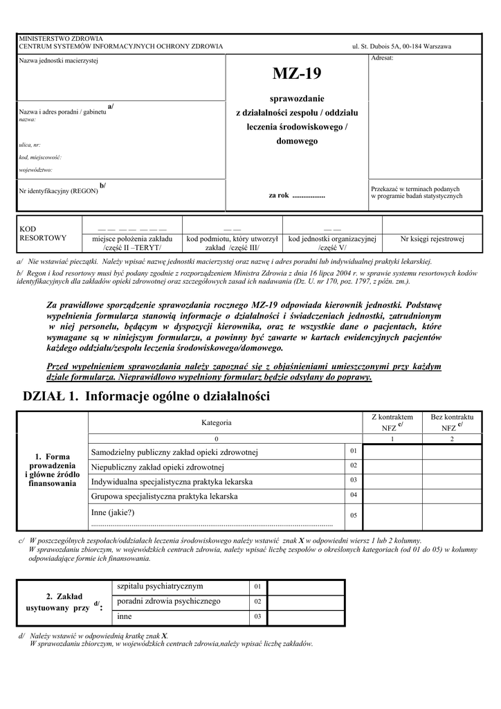 MINISTERSTWO ZDROWIA CENTRUM SYSTEMÓW INFORMACYJNYCH OCHRONY ZDROWIA ul. St. Dubois 5A, 00-184 Warszawa Adresat: Nazwa jednostki macierzystej MZ-19 Nazwa i adres poradni / gabinetu sprawozdanie a/ z działalności zespołu / oddziału nazwa: leczenia środowiskowego / domowego ulica, nr: kod, miejscowość: województwo: Nr identyfikacyjny (REGON) KOD RESORTOWY b/ Przekazać w terminach podanych w programie badań statystycznych za rok .................. —— —— ——— miejsce położenia zakładu /część II –TERYT/ —— kod podmiotu, który utworzył zakład /część III/ —— kod jednostki organizacyjnej /część V/ Nr księgi rejestrowej a/ Nie wstawiać pieczątki. Należy wpisać nazwę jednostki macierzystej oraz nazwę i adres poradni lub indywidualnej praktyki lekarskiej. b/ Regon i kod resortowy musi być podany zgodnie z rozporządzeniem Ministra Zdrowia z dnia 16 lipca 2004 r. w sprawie systemu resortowych kodów identyfikacyjnych dla zakładów opieki zdrowotnej oraz szczegółowych zasad ich nadawania (Dz. U. nr 170, poz. 1797, z późn. zm.). Za prawidłowe sporządzenie sprawozdania rocznego MZ-19 odpowiada kierownik jednostki. Podstawę wypełnienia formularza stanowią informacje o działalności i świadczeniach jednostki, zatrudnionym w niej personelu, będącym w dyspozycji kierownika, oraz te wszystkie dane o pacjentach, które wymagane są w niniejszym formularzu, a powinny być zawarte w kartach ewidencyjnych pacjentów każdego oddziału/zespołu leczenia środowiskowego/domowego. Przed wypełnieniem sprawozdania należy zapoznać się z objaśnieniami umieszczonymi przy każdym dziale formularza. Nieprawidłowo wypełniony formularz będzie odsyłany do poprawy. DZIAŁ 1. Informacje ogólne o działalności Z kontraktem Kategoria NFZ 0 1. Forma prowadzenia i główne źródło finansowania 1 Samodzielny publiczny zakład opieki zdrowotnej 01 Niepubliczny zakład opieki zdrowotnej 02 Indywidualna specjalistyczna praktyka lekarska 03 Grupowa specjalistyczna praktyka lekarska 04 Inne (jakie?) 05 c/ Bez kontraktu NFZ c/ 2 .............................................................................................................................. c/ W poszczególnych zespołach/oddziałach leczenia środowiskowego należy wstawić znak X w odpowiedni wiersz 1 lub 2 kolumny. W sprawozdaniu zbiorczym, w wojewódzkich centrach zdrowia, należy wpisać liczbę zespołów o określonych kategoriach (od 01 do 05) w kolumny odpowiadające formie ich finansowania. 2. Zakład usytuowany przy d/ : szpitalu psychiatrycznym 01 poradni zdrowia psychicznego 02 inne 03 d/ Należy wstawić w odpowiednią kratkę znak X. W sprawozdaniu zbiorczym, w wojewódzkich centrach zdrowia,należy wpisać liczbę zakładów. DZIAŁ 2. Personel działalności podstawowej e/ Zatrudnieni na podstawie stosunku pracy Wyszczególnienie ogółem (w osobach) 0 1 w tym pełnozatrudnieni stan w dniu 31.12. w tym: Lekarze ogółem (łącznie z rezydentami, bez konsultantów) 02 psychiatrzy II st. i specjaliści psychiatrzy (w nowym systemie jednostopniowym) 03 Pielęgniarki 04 Psycholodzy 05 Specjaliści terapii uzależnień 06 Instruktorzy terapii uzależnień 07 Terapeuci zajęciowi 08 Pracownicy socjalni 09 ..................................................................... liczba opłaconych godzin pełnoi niepełnozatrudnionych w ciągu roku 3 Pracujący w ramach umów cywilnoprawnych ogółem (w osobach) w tym w wymiarze nie mniejszym niż 35 godzin tygodniowo stan w dniu 31.12. 4 5 01 psychiatrzy I st. Inni terapeuci (jacy?) 2 f/ 10 e/ Dotyczy personelu pracującego w bezpośrednim kontakcie z pacjentem. Bez osób przebywających na urlopach wychowawczych, bezpłatnych oraz powołanych do zasadniczej lub okresowej służby wojskowej. Zatrudnieni na podstawie stosunku pracy (kolumna 1, 2, 3) - dotyczy osób zatrudnionych zarówno na pełnych jak i niepełnych etatach, z określoną liczbą godzin pracy. Pracujący w ramach umowy cywilno-prawnej (kolumna 4, 5) - dotyczy osób zatrudnionych na umowach-zleceniach oraz umowach ryczałtowych. We wszystkich wierszach (od 01 do 10) kolumny 3 należy wpisać opłacone godziny osób wpisanych w kolumnę 1. f/ Zatrudnieni na podstawie: umowy o pracę, powołania, wyboru, mianowania (zgodnie z ustawą z dnia 26 czerwca 1974 r. Kodeks Pracy(Dz. U. z 1998 r. Nr 21, poz. 94, z późn. zm.)). DZIAŁ 3. Działalność zespołu Wyszczególnienie Liczba wizyt w środowisku chorego (dom, praca, szkoła itp.) Liczba wizyt w zespole Liczba wizyt ogółem (1+2) 0 1 2 3 Lekarze 01 Pielęgniarki 02 Psycholodzy 03 Inni terapeuci 04 Pracownicy socjalni 05 DZIAŁ 4. Leczeni W dziale 4 liczba osób leczonych w roku bieżącym składa się z chorych objętych opieką oddziału/zespołu po raz pierwszy w roku oraz tych z lat poprzednich, którzy w danym roku również znajdowali się pod opieką oddziału/zespołu. Chorego wlicza się do ewidencji jeden raz niezależnie od liczby wizyt, udzielonych mu świadczeń czy rozpoznań postawionych w ciągu roku (obowiązujące jest rozpoznanie z ostatniej porady). Pacjenci pierwszorazowi (dział 4 kolumny 7-12) to tacy, którzy w opiece środowiskowej podjęli leczenie po raz pierwszy w życiu. Wyszczególnienie ogółem 0 Ogółem z zaburzeniami psychicznymi (suma wierszy 04 - 12) Z wiersza 01 1 01 mężczyźni 02 osoby zamieszkałe na wsi 03 organiczne zaburzenia psychiczne włącznie z zespołami objawowymi (F00-F09) 04 zaburzenia spowodowane używaniem alkoholu (F10) 05 zaburzenia spowodowane używaniem substancji psychoaktywnych (F11-F19) 06 schizofrenia (F20) 07 inne zaburzenia psychotyczne i urojeniowe /bez afektywnych i schizofrenii/ (F21-F29) 08 zaburzenia nastroju /afektywne/ (F30-F39) 09 zaburzenia nerwicowe związane ze stresem i somatoformiczne (F40-F48) zespoły behawioralne związane z zaburzeniami fizjologicznymi i czynnikami fizycznymi (F50-F59) inne W tym: leczeni ogółem w wieku lat Leczeni 10 