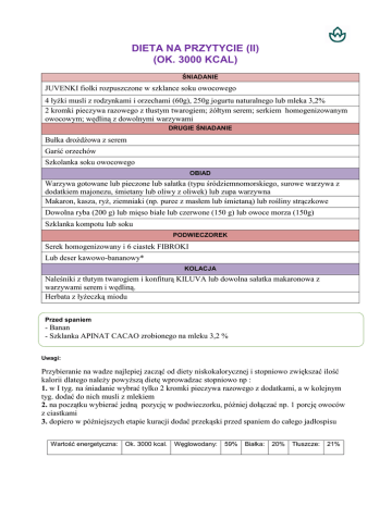 DIETA NA PRZYTYCIE (II) (OK. 3000 KCAL) ŚNIADANIE JUVENKI fiolki rozpuszczone w szklance soku owocowego 4 łyżki musli z rodzynkami i orzechami (60g), 250g jogurtu naturalnego lub mleka 3,2% 2 kromki pieczywa razowego z tłustym twarogiem; żółtym serem; serkiem homogenizowanym owocowym; wędliną z dowolnymi warzywami DRUGIE ŚNIADANIE Bułka drożdżowa z serem Garść orzechów Szkolanka soku owocowego OBIAD Warzywa gotowane lub pieczone lub sałatka (typu śródziemnomorskiego, surowe warzywa z dodatkiem majonezu, śmietany lub oliwy z oliwek) lub zupa warzywna Makaron, kasza, ryż, ziemniaki (np. puree z masłem lub śmietaną) lub rośliny strączkowe Dowolna ryba (200 g) lub mięso białe lub czerwone (150 g) lub owoce morza (150g) Szklanka kompotu lub soku PODWIECZOREK Serek homogenizowany i 6 ciastek FIBROKI Lub deser kawowo-bananowy* KOLACJA Naleśniki z tłutym twarogiem i konfiturą KILUVA lub dowolna sałatka makaronowa z warzywami serem i wędliną. Herbata z łyżeczką miodu Przed spaniem - Banan - Szklanka APINAT CACAO zrobionego na mleku 3,2 % Uwagi: Przybieranie na wadze najlepiej zacząć od diety niskokalorycznej i stopniowo zwiększać ilość kalorii dlatego należy powyższą dietę wprowadzac stopniowo np : 1. w I tyg. na śniadanie wybrać tylko 2 kromki pieczywa razowego z dodatkami, a w kolejnym tyg. dodać do nich musli z mlekiem 2. na początku wybierać jedną pozycję w podwieczorku, później dołączać np. 1 porcję owoców z ciastkami 3. dopiero w późniejszych etapie kuracji dodać przekąski przed spaniem do całego jadłospisu Wartość energetyczna: Ok. 3000 kcal. Węglowodany: 59% Białka: 20% Tłuszcze: 21%