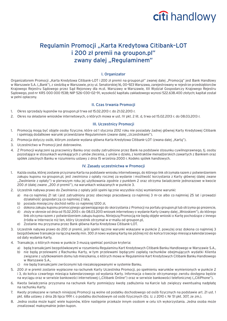 Regulamin Promocji „Karta Kredytowa Citibank–LOT i 200 zł premii na groupon.pl” zwany dalej „Regulaminem” I. Organizator Organizatorem Promocji „Karta Kredytowa Citibank–LOT i 200 zł premii na groupon.pl” zwanej dalej „Promocją” jest Bank Handlowy w Warszawie S.A. („Bank”), z siedzibą w Warszawie, przy ul. Senatorskiej 16, 00–923 Warszawa, zarejestrowany w rejestrze przedsiębiorców Krajowego Rejestru Sądowego przez Sąd Rejonowy dla m.st. Warszawy w Warszawie, XII Wydział Gospodarczy Krajowego Rejestru Sądowego, pod nr KRS 000 000 1538; NIP 526–030–02–91, wysokość kapitału zakładowego wynosi 522.638.400 złotych; kapitał został w pełni opłacony. II. Czas trwania Promocji 1. Okres sprzedaży kuponów na groupon.pl trwa od 15.02.2013 r. do 21.02.2013 r. 2. Okres na składanie wniosków internetowych, o których mowa w ust. IV pkt. 2 lit. d, trwa od 15.02.2013 r. do 08.03.2013 r. III. Uczestnicy Promocji 1. Promocją mogą być objęte osoby fizyczne, które od 1 stycznia 2012 roku nie posiadały żadnej głównej Karty Kredytowej Citibank i spełniają dodatkowe warunki przewidziane Regulaminem (zwane dalej „Uczestnikami”). 2. Promocja dotyczy osób, którym zostanie wydana główna Karta Kredytowa Citibank–LOT (zwana dalej „Kartą”). 3. Uczestnictwo w Promocji jest dobrowolne. 4. Z Promocji wyłączeni są pracownicy Banku oraz osoby zatrudnione przez Bank na podstawie stosunku cywilnoprawnego, tj. osoby pozostające w stosunkach wynikających z umów zlecenia, z umów o dzieło, z kontraktów menadżerskich zawartych z Bankiem oraz spółek zależnych Banku w rozumieniu ustawy z dnia 15 września 2000 r. Kodeks spółek handlowych. IV. Zasady uczestnictwa w Promocji 1. Każda osoba, której zostanie przyznana Karta na podstawie wniosku internetowego, do którego link otrzymała razem z potwierdzeniem zakupu kuponu na groupon.pl, jest zwolniona z opłaty rocznej za wydanie i możliwość korzystania z Karty głównej (dalej zwane „Zwolnienie z opłaty”) w pierwszym roku jej użytkowania zgodnie z punktem 2 oraz otrzyma świadczenie jednorazowe w kwocie 200 zł (dalej zwane „200 zł premii”), na warunkach wskazanych w punkcie 3. 2. Uczestnik nabywa prawo do Zwolnienia z opłaty jeśli spełni łącznie wszystkie niżej wymienione warunki: a) ma co najmniej 21 lat i jest zatrudniony przez obecnego pracodawcę co najmniej 3 m–ce albo co najmniej 25 lat i prowadzi działalność gospodarczą co najmniej 2 lata, b) posiada miesięczny dochód netto co najmniej 1200 zł, c) dokona zakupu kuponu promocyjnego uprawniającego do skorzystania z Promocji na portalu groupon.pl lub otrzyma go prezencie, d) złoży w okresie od dnia od 15.02.2013 r. do 08.03.2013 wniosek internetowy o wydanie Karty (zwany dalej „Wnioskiem”), do którego link otrzyma razem z potwierdzeniem zakupu kuponu. Niniejszą Promocją nie będą objęte wnioski o Kartę pochodzące z innego źródła w Internecie niż ten, który Uczestnik otrzymał w e–mailu od groupon.pl, e) Zostanie mu przyznana przez Bank główna Karta Kredytowa Citibank–LOT. 3. Uczestnik nabywa prawo do 200 zł premii, jeśli spełni łącznie warunki wskazane w punkcie 2. powyżej oraz dokona co najmniej 3 bezgotówkowe transakcje na łączną kwotę min. 300 zł nowo wydaną Kartą nie później niż do końca trzeciego miesiąca kalendarzowego od daty wydania Karty. 4. Transakcje, o których mowa w punkcie 3 muszą spełniać poniższe kryteria: a) będą transakcjami bezgotówkowymi w rozumieniu Regulaminu Kart Kredytowych Citibank Banku Handlowego w Warszawie S.A., b) nie będą przelewami z Rachunku Karty, w tym przelewami będącymi zapłatą rachunków obejmujących wydatki Klienta związane z użytkowaniem domu lub mieszkania, o których mowa w Regulaminie Kart Kredytowych Citibank Banku Handlowego w Warszawie S.A., c) nie będą transakcjami zwróconymi lub niezaksięgowanymi w systemie Banku. 5. 200 zł w premii zostanie wypłacone na rachunek Karty Uczestnika Promocji, po spełnieniu warunków wymienionych w punkcie 2 i 3, do końca czwartego miesiąca kalendarzowego od wydania Karty. Informacja o kwocie otrzymanego zwrotu dostępna będzie na wyciągu oraz w serwisie bankowości internetowej („Citibank Online”) oraz w serwisie bankowości telefonicznej („CitiPhone”). 6. Kwota świadczenia przyznana na rachunek Karty pomniejszy kwotę zadłużenia na Karcie lub zwiększy ewentualną nadpłatę na rachunku Karty. 7. Kwoty przekazane w ramach niniejszej Promocji są wolne od podatku dochodowego od osób fizycznych na podstawie art. 21 ust. 1 pkt. 68a ustawy z dnia 26 lipca 1991 r. o podatku dochodowym od osób fizycznych (Dz. U. z 2010 r. Nr 51 pkt. 307, ze zm.). 8. Jedna osoba może kupić wiele kuponów, które następnie przekaże innym osobom w celu ich wykorzystania. Jedna osoba może zrealizować maksymalnie jeden kupon. 9. W przypadku niespełnienia warunków z pkt. IV 2 i 3 oraz nieprzyznania karty na podstawie Wniosku, Doradca Banku może zaproponować zainteresowanemu nabycie dowolnego produktu oferowanego przez Bank na standardowych warunkach, gdzie nie przysługuje prawo do 200 zł premii oraz zwolnienie z opłaty. 10. Osoby, które złożyły Wniosek, o którym mowa w pkt. 2 lit d powyżej, ale nie została im przyznana przez Bank Karta Kredytowa Citibank– LOT, mają prawo do zwrotu poniesionej opłaty za kupon. Osoby takie otrzymają wiadomość potwierdzającą niewykorzystanie kuponu na adres e–mail podany we Wniosku. Aby uzyskać zwrot opłaty za kupon osoba, która nabyła kupon, który nie został wykorzystany ze względu na negatywną decyzję kredytową, powinna powiadomić groupon.pl drogą mailową ([email protected]) lub telefoniczną (+48 22 496 08 88) o chęci uzyskania zwrotu. V. Postanowienia końcowe 1. W kwestiach nieuregulowanych niniejszym Regulaminem mają zastosowanie postanowienia „Regulaminu Kart Kredytowych Citibank Banku