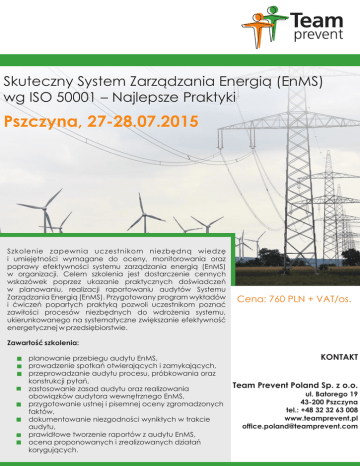 Skuteczny System Zarz¹dzania Energi¹ (EnMS) wg ISO 50001 – Najlepsze Praktyki Pszczyna, 27-28.07.2015 Szkolenie zapewnia uczestnikom niezbêdn¹ wiedzê i umiejêtnoœci wymagane do oceny, monitorowania oraz poprawy efektywnoœci systemu zarz¹dzania energi¹ (EnMS) w organizacji. Celem szkolenia jest dostarczenie cennych wskazówek poprzez ukazanie praktycznych doœwiadczeñ w planowaniu, realizacji raportowaniu audytów Systemu Zarz¹dzania Energi¹ (EnMS). Przygotowany program wyk³adów i æwiczeñ popartych praktyk¹ pozwoli uczestnikom poznaæ zawi³oœci procesów niezbêdnych do wdro¿enia systemu, ukierunkowanego na systematyczne zwiêkszanie efektywnoœæ energetycznej w przedsiêbiorstwie. Cena: 760 PLN + VAT/os. Zawartoœæ szkolenia: planowanie przebiegu audytu EnMS, prowadzenie spotkañ otwieraj¹cych i zamykaj¹cych, przeprowadzanie audytu procesu, próbkowania oraz konstrukcji pytañ, zastosowanie zasad audytu oraz realizowania obowi¹zków audytora wewnêtrznego EnMS, przygotowanie ustnej i pisemnej oceny zgromadzonych faktów, dokumentowanie niezgodnoœci wynik³ych w trakcie audytu, prawid³owe tworzenie raportów z audytu EnMS, ocena proponowanych i zrealizowanych dzia³añ koryguj¹cych. KONTAKT Team Prevent Poland Sp. z o.o. ul. Batorego 19 43-200 Pszczyna tel.: +48 32 32 63 008 www.teamprevent.pl [email protected]