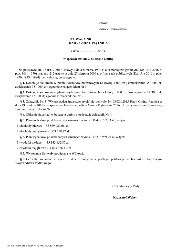 Projekt z dnia 21 grudnia 2016 r. UCHWAŁA NR .................... RADY GMINY PIĄTNICA z dnia .................... 2016 r. w sprawie zmian w budżecie Gminy Na podstawie art. 18 ust. 2 pkt 4 ustawy z dnia 8 marca 1990 r. o samorządzie gminnym (Dz. U. z 2016 r. poz. 446 i 1579) oraz art. 212 ustawy z dnia 27 sierpnia 2009 r. o finansach publicznych (Dz. U. z 2016 r. poz. 1870, 1948 i 1984) uchwala się, co następuje: § 1. Dokonuje się zmian w planie dochodów budżetowych na kwotę 1 000 zł ( zmniejszenie 350 000 zł, zwiększenie 351 000 zł) zgodnie z załącznikiem Nr 1. § 2. Dokonuje się zmian w planie wydatków budżetowych na kwotę 1 000 zł (zmniejszenie 12 300 zł, zwiększenie 13 300 zł) zgodnie z załącznikiem Nr 2. § 3. Załącznik Nr 3 "Wykaz zadań inwestycyjnych" do uchwały Nr 63/XII/2015 Rady Gminy Piątnica z dnia 29 grudnia 2015 r. w sprawie uchwalenia budżetu Gminy Piątnica na 2016 rok otrzymuje nowe brzmienie, zgodnie z załącznikiem Nr 3. § 4. Objaśnienia zmian w budżecie gminy przedstawia załącznik Nr 4. § 5. Plan dochodów po dokonanych zmianach wynosi 36 428 787,83 zł , w tym: 1) dochody bieżące - 35 869 029,06 zł, 2) dochody majątkowe - 559 758,77 zł. § 6. Plan wydatków po dokonanych zmianach wynosi 39 236 969,20 zł, w tym: 1) wydatki bieżące - 35 143 652,87 zł, 2) wydatki majątkowe - 4 093 316,33 zł. § 7. Wykonanie Uchwały powierza się Wójtowi. § 8. Uchwała wchodzi w życie z dniem podjęcia i podlega publikacji w Dzienniku Urzędowym Województwa Podlaskiego. Przewodniczący Rady Krzysztof Weber Id: F09740FB-25B2-420D-A862-7F627E2C527F. Projekt Zmiany w planie dochodów budżetowych Rodzaj zadania: Rozdział § Nazwa 1 2 3 4 bieżące razem: Plan przed zmianą Zmniejszenie Zwiększenie 5 6 7 bieżące w tym z tytułu dotacji i środków na finansowanie wydatków na realizację zadań finansowanych z udziałem środków, o których mowa w art. 5 ust. 1 pkt 2 i 3 Rodzaj zadania: Plan po zmianach (5+6+7) 8 5 732,00 0,00 0,00 5 732,00 0,00 0,00 0,00 0,00 Własne Dział Rozdział § Nazwa 1 2 3 4 801 Plan przed zmianą Zmniejszenie Zwiększenie 5 6 7 bieżące Oświata i wychowanie 1 000,00 1 085 567,00 0,00 0,00 0,00 0,00 44 741,00 0,00 1 000,00 45 741,00 0,00 0,00 0,00 0,00 0,00 0,00 1 000,00 1 000,00 26 977 316,63 0,00 1 000,00 26 978 316,63 11 291,39 0,00 0,00 11 291,39 350 000,00 -350 000,00 0,00 0,00 0,00 0,00 0,00 0,00 350 000,00 -350 000,00 0,00 0,00 w tym z tytułu dotacji i środków na finansowanie wydatków na realizację zadań finansowanych z udziałem środków, o których mowa w art. 5 ust. 1 pkt 2 i 3 Wpływy z otrzymanych spadków, zapisów i darowizn w postaci pieniężnej bieżące razem: w tym z tytułu dotacji i środków na finansowanie wydatków na realizację zadań finansowanych z udziałem środków, o których mowa w art. 5 ust. 1 pkt 2 i 3 Oświata i wychowanie w tym z tytułu dotacji i środków na finansowanie wydatków na realizację zadań finansowanych z udziałem środków, o których mowa w art. 5 ust. 1 pkt 2 i 3 Pozostała działalność Id: F09740FB-25B2-420D-A862-7F627E2C527F. Projekt 8 0,00 Szkoły podstawowe 0960 Plan po zmianach (5+6+7) 1 084 567,00 w tym z tytułu dotacji i środków na finansowanie wydatków na realizację zadań finansowanych z udziałem środków, o których mowa w art. 5 ust. 1 pkt 2 i 3 80101 80195 w złotych Poroz. z JST Dział 801 zał. Nr 1 majątkowe Strona 1 z 2 w tym z tytułu dotacji i środków na finansowanie wydatków na realizację zadań finansowanych z udziałem środków, o których mowa w art. 5 ust. 1 pkt 2 i 3 6260 926 Dotacje otrzymane z państwowych funduszy celowych na finansowanie lub dofinansowanie kosztów realizacji inwestycji i zakupów inwestycyjnych jednostek sektora finansów publicznych 0,00 0,00 0,00 0,00 350 000,00 -350 000,00 0,00 0,00 0,00 0,00 350 000,00 350 000,00 0,00 0,00 0,00 0,00 0,00 0,00 350 000,00 350 000,00 0,00 0,00 0,00 0,00 0,00 0,00 350 000,00 350 000,00 559 758,77 -350 000,00 350 000,00 559 758,77 17 958,77 0,00 0,00 17 958,77 Kultura fizyczna w tym z tytułu dotacji i środków na finansowanie wydatków na realizację zadań finansowanych z udziałem środków, o których mowa w art. 5 ust. 1 pkt 2 i 3 92695 Pozostała działalność w tym z tytułu dotacji i środków na finansowanie wydatków na realizację zadań finansowanych z udziałem środków, o których mowa w art. 5 ust. 1 pkt 2 i 3 6260 Dotacje otrzymane z państwowych funduszy celowych na finansowanie lub dofinansowanie kosztów realizacji inwestycji i zakupów inwestycyjnych jednostek sektora finansów publicznych majątkowe razem: w tym z tytułu dotacji i środków na finansowanie wydatków na realizację zadań finansowanych z udziałem środków, o których mowa w art. 5 ust. 1 pkt 2 i 3 Rodzaj zadania: Zlecone Dział Rozdział § Nazwa 1 2 3 4 bieżące razem: w tym z tytułu dotacji i środków na finansowanie wydatków na realizację zadań finansowanych z udziałem środków, o których mowa w art. 5 ust. 1 pkt 2 i 3 Ogółem: (* kol 2 do wykorzystania fakultatywnego) w tym z tytułu dotacji i środków na finansowanie wydatków na realizację zadań finansowanych z udziałem środków, o których mowa w art. 5 ust. 1 pkt 2 i 3 Plan przed zmianą Zmniejszenie Zwiększenie 5 6 7 bieżące 10 884 980,43 Plan po zmianach (5+6+7) 8 0,00 0,00 0,00 0,00 38 427 787,83 -350 000,00 351 000,00 38 428 787,83 29 250,16 0,00 0,00 29 250,16 0,00 10 884 980,43 0,00 Strona 2 z 2 Id: F09740FB-25B2-420D-A862-7F627E2C527F. Projekt Zmiany w planie wydatków budżetowych Rodzaj zadania: zał. Nr 2 Poroz. z JST Z tego z tego: z tego: Dział 1 Rozdział 2 § Nazwa 3 Plan 4 Wydatki razem: Rodzaj zadania: Wydatki bieżące 5 wydatki jednostek budżetowych, 6 7 wydatki na z tego: programy finansowane z świadczenia na wypłaty z tytułu wydatki związane dotacje na udziałem wynagrodzenia i rzecz osób poręczeń i z realizacją ich zadania bieżące środków, o skł