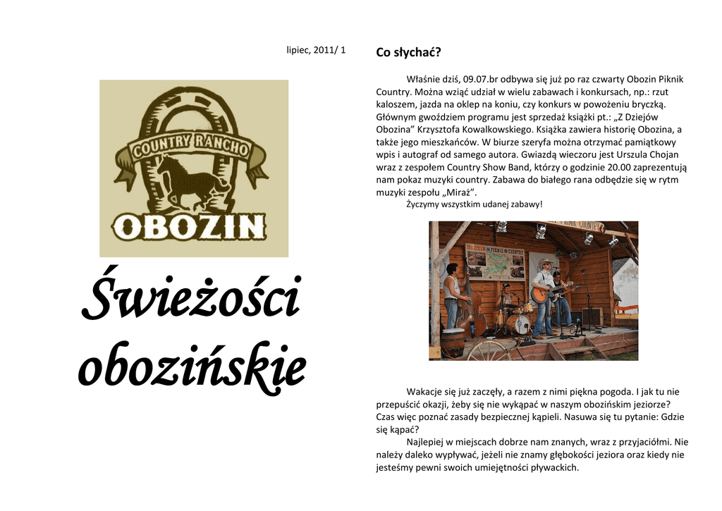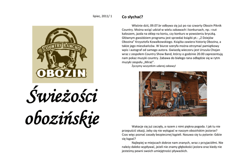 lipiec, 2011/ 1 Co słychać? Właśnie dziś, 09.07.br odbywa się już po raz czwarty Obozin Piknik Country. Można wziąd udział w wielu zabawach i konkursach, np.: rzut kaloszem, jazda na oklep na koniu, czy konkurs w powożeniu bryczką. Głównym gwoździem programu jest sprzedaż książki pt.: „Z Dziejów Obozina” Krzysztofa Kowalkowskiego. Książka zawiera historię Obozina, a także jego mieszkaoców. W biurze szeryfa można otrzymad pamiątkowy wpis i autograf od samego autora. Gwiazdą wieczoru jest Urszula Chojan wraz z zespołem Country Show Band, którzy o godzinie 20.00 zaprezentują nam pokaz muzyki country. Zabawa do białego rana odbędzie się w rytm muzyki zespołu „Miraż”. Życzymy wszystkim udanej zabawy! Świeżości obozińskie Wakacje się już zaczęły, a razem z nimi piękna pogoda. I jak tu nie przepuścid okazji, żeby się nie wykąpad w naszym obozioskim jeziorze? Czas więc poznad zasady bezpiecznej kąpieli. Nasuwa się tu pytanie: Gdzie się kąpad? Najlepiej w miejscach dobrze nam znanych, wraz z przyjaciółmi. Nie należy daleko wypływad, jeżeli nie znamy głębokości jeziora oraz kiedy nie jesteśmy pewni swoich umiejętności pływackich. Najlepsza temperatura do kąpieli to 21-26˚C. Należy unikad wchodzenia do wody w godzinach 12-16, gdyż wtedy najwyżej góruje słooce. I pamiętaj! Nie pływaj nigdy z pełnym lub zupełnie pustym brzuchem. Pytania i odpowiedzi. 1.Pyt: Ostatnio dużo dzieje się na stronie Obozina. Jak często należy tam zaglądad, żeby byd na bieżąco, a jednoczenie nie oglądad tego samego? Zatroskana Rozrywka. Dowcip miesiąca: Kuzyn z miasta odwiedza bardzo zaniedbane gospodarstwo rolne Antka. - Nic na tej ziemi nie rośnie? - A no nic - wzdycha Antek. - A jakby tak zasiać kukurydzę? - Aaa... jakby zasiać, to by urosła. Rolnik pyta rolnika jąkałę: - Dużo masz królików? Trzy...trzy...trzysta... -Nie żartuj! Aż trzysta? -Nnie... Trzy sta...stare i dwwa młode! Odp: Tak to prawda. Postanowiliśmy ruszyd stronę www.obozin.pl. Już nawet dzieo po wydarzeniu staramy się zamieszczad nowe wieści. Chcemy również gorąco zachęcid do komentowania wpisów. Redakcja 2.Pyt: Wiem, że w Obozinie jest piękne jezioro. Czy każdy może z niej korzystad? Skarszewianka Odp: Jest to plaża prywatna, lecz można swobodnie wypocząd pod warunkiem, że zachowa się wysoką kulturę osobistą. !!! Konkurs dla najmłodszych pt.: „Co czyha w wodzie?”. Prosimy o dostarczanie własnoręcznych prac do Sołtysa Grzegorza Miszewskiego. Nagrodą będzie umieszczenie zwycięskiej pracy w kolejnym wydaniu „Świeżości obozioskich”. Ogłoszenia: Zespół muzyczny PRESTO. Wesela, jubileusze, urodziny, bankiety, imprezy okolicznościowe. Tel: 694-546-922 Amatorskie sesje zdjęciowe. Strona internetowa: WWW.maxmodels.pl/suchydeszcz.html tel: 515-506-485, gg:1926307 Oddam małego kotka w dobre ręce. Tel: 516736367 Kontakt: Pytania, uwagi i wszelkie ogłoszenia kierujcie na maila [email protected] lub do Sołtysa Grzegorza Miszewskiego. Także zachęcamy do czynnego udziału na stronie www.obozin.pl Gazetkę prowadzą: Kinga Kossobucka Martyna Kossobucka Monika Drosdowska