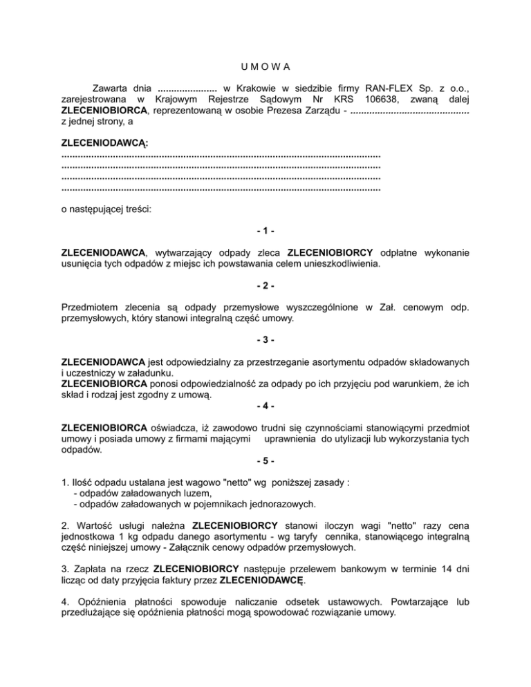 UMOWA Zawarta dnia ...................... w Krakowie w siedzibie firmy RAN-FLEX Sp. z o.o., zarejestrowana w Krajowym Rejestrze Sądowym Nr KRS 106638, zwaną dalej ZLECENIOBIORCA, reprezentowaną w osobie Prezesa Zarządu - ............................................ z jednej strony, a ZLECENIODAWCĄ: ...................................................................................................................... ...................................................................................................................... ...................................................................................................................... ...................................................................................................................... o następującej treści: -1ZLECENIODAWCA, wytwarzający odpady zleca ZLECENIOBIORCY odpłatne wykonanie usunięcia tych odpadów z miejsc ich powstawania celem unieszkodliwienia. -2Przedmiotem zlecenia są odpady przemysłowe wyszczególnione w Zał. cenowym odp. przemysłowych, który stanowi integralną część umowy. -3ZLECENIODAWCA jest odpowiedzialny za przestrzeganie asortymentu odpadów składowanych i uczestniczy w załadunku. ZLECENIOBIORCA ponosi odpowiedzialność za odpady po ich przyjęciu pod warunkiem, że ich skład i rodzaj jest zgodny z umową. -4ZLECENIOBIORCA oświadcza, iż zawodowo trudni się czynnościami stanowiącymi przedmiot umowy i posiada umowy z firmami mającymi uprawnienia do utylizacji lub wykorzystania tych odpadów. -51. Ilość odpadu ustalana jest wagowo "netto" wg poniższej zasady : - odpadów załadowanych luzem, - odpadów załadowanych w pojemnikach jednorazowych. 2. Wartość usługi należna ZLECENIOBIORCY stanowi iloczyn wagi "netto" razy cena jednostkowa 1 kg odpadu danego asortymentu - wg taryfy cennika, stanowiącego integralną część niniejszej umowy - Załącznik cenowy odpadów przemysłowych. 3. Zapłata na rzecz ZLECENIOBIORCY następuje przelewem bankowym w terminie 14 dni licząc od daty przyjęcia faktury przez ZLECENIODAWCĘ. 4. Opóźnienia płatności spowoduje naliczanie odsetek ustawowych. Powtarzające lub przedłużające się opóźnienia płatności mogą spowodować rozwiązanie umowy. 5. ZLECENIODAWCA oświadcza, że jest płatnikiem podatku ZLECENIOBIORCĘ do wystawienia faktury VAT bez swojego podpisu. VAT i upoważnia 6. ZLECENIOBIORCA zobowiązuje się powiadomić ZLECENIODAWCĘ o każdej zmianie warunków odbioru odpadów. -6Wszelkie zmiany postanowień umowy są dozwolone za zgodą stron w formie pisemnego aneksu pod rygorem nieważności. -7Odbiór odpadów będzie następował na każde żądanie ZLECENIODAWCY np. zgłoszone telefonicznie, w momencie pozyskania stosownej ilości do pojemnika. -8Strony przewidują możliwość rozwiązania umowy w każdym czasie za zgodą stron lub za trzymiesięcznym wypowiedzeniem z przyczyn zawinionych przez każdą ze stron, a wymienionych w pkt. 9, ze skutkiem na koniec miesiąca kalendarzowego. -9Przyczyny zawinienia leżące po stronie ZLECENIOBIORCY tj. - nie odebranie w terminie odpadów przemysłowych - utrata uprawnień niezbędnych do wykonania usługi. Przyczyny zawinienia leżące po stronie ZLECENIODAWCY to: - trzykrotne opóźnienie w zapłacie należności. - 10 Umowa zostaje zawarta na czas nieokreślony. - 11 W sprawach nieuregulowanych niniejszą umową mają zastosowanie przepisy Kodeksu Cywilnego oraz Ustawa o odpadach z dnia 27 kwietnia 2001 r. (D.U. Nr. 62 z 2001r. poz. 628 Art. 28 Ust.4 pkt.1 do 6). Rozporządzenie Ministra Środowiska Nr.1206 z dnia 27 września 2001 r. w sprawie katalogu odpadów Dz.U.Nr.112. Ewentualne spory powstałe pomiędzy stronami rozstrzygane będą przez właściwy Sąd w Krakowie. - 12 Umowę sporządzono w dwóch jednobrzmiących egzemplarzach, po jednym dla każdej ze stron. ZLECENIOBIORCA ZLECENIODAWCA