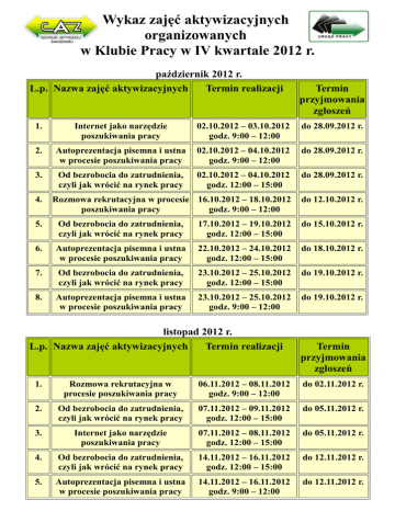 Wykaz zajęć aktywizacyjnych organizowanych w Klubie Pracy w IV kwartale 2012 r. październik 2012 r. L.p. Nazwa zajęć aktywizacyjnych Termin realizacji Termin przyjmowania zgłoszeń 1. Internet jako narzędzie poszukiwania pracy 02.10.2012 – 03.10.2012 godz. 9:00 – 12:00 do 28.09.2012 r. 2. Autoprezentacja pisemna i ustna w procesie poszukiwania pracy 02.10.2012 – 04.10.2012 godz. 9:00 – 12:00 do 28.09.2012 r. 3. Od bezrobocia do zatrudnienia, czyli jak wrócić na rynek pracy 02.10.2012 – 04.10.2012 godz. 12:00 – 15:00 do 28.09.2012 r. Rozmowa rekrutacyjna w procesie 16.10.2012 – 18.10.2012 poszukiwania pracy godz. 9:00 – 12:00 do 12.10.2012 r. 4. 5. Od bezrobocia do zatrudnienia, czyli jak wrócić na rynek pracy 17.10.2012 – 19.10.2012 godz. 12:00 – 15:00 do 15.10.2012 r. 6. Autoprezentacja pisemna i ustna w procesie poszukiwania pracy 22.10.2012 – 24.10.2012 godz. 12:00 – 15:00 do 18.10.2012 r. 7. Od bezrobocia do zatrudnienia, czyli jak wrócić na rynek pracy 23.10.2012 – 25.10.2012 godz. 12:00 – 15:00 do 19.10.2012 r. 8. Autoprezentacja pisemna i ustna w procesie poszukiwania pracy 23.10.2012 – 25.10.2012 godz. 9:00 – 12:00 do 19.10.2012 r. listopad 2012 r. L.p. Nazwa zajęć aktywizacyjnych Termin realizacji Termin przyjmowania zgłoszeń 1. Rozmowa rekrutacyjna w procesie poszukiwania pracy 06.11.2012 – 08.11.2012 godz. 9:00 – 12:00 do 02.11.2012 r. 2. Od bezrobocia do zatrudnienia, czyli jak wrócić na rynek pracy 07.11.2012 – 09.11.2012 godz. 12:00 – 15:00 do 05.11.2012 r. 3. Internet jako narzędzie poszukiwania pracy 07.11.2012 – 08.11.2012 godz. 12:00 – 15:00 do 05.11.2012 r. 4. Od bezrobocia do zatrudnienia, czyli jak wrócić na rynek pracy 14.11.2012 – 16.11.2012 godz. 12:00 – 15:00 do 12.11.2012 r. 5. Autoprezentacja pisemna i ustna w procesie poszukiwania pracy 14.11.2012 – 16.11.2012 godz. 9:00 – 12:00 do 12.11.2012 r. 6. Strategia poszukiwania pracy 13.11.2012 – 15.11.2012 godz. 9:00 – 12:00 do 12.11.2012 r. 7. Autoprezentacja pisemna i ustna w procesie poszukiwania pracy 20.11.2012 – 22.11.2012 godz. 12:00 – 15:00 do 19.11.2012 r. 8. Autoprezentacja pisemna i ustna w procesie poszukiwania pracy 26.11.2012 – 28.11.2012 godz. 12:00 – 15:00 do 22.11.2012 r. 9. Strategia poszukiwania pracy 27.11.2012 – 29.11.2012 godz. 9:00 – 12:00 do 23.11.2012 r. grudzień 2012 r. L.p. Temat zajęć aktywizacyjnych Termin realizacji Termin przyjmowania zgłoszeń 1. Internet jako narzędzie poszukiwania pracy 05.12.2012 – 06.12.2012 godz. 9:00 – 12:00 do 03.12.2012 r. 2. Autoprezentacja pisemna i ustna w procesie poszukiwania pracy 04.12.2012 – 06.12.2012 godz. 12:00 – 15:00 do 30.11.2012 r. 3. Rozmowa rekrutacyjna w procesie poszukiwania pracy 04.12.2012 – 06.12.2012 godz. 9:00 – 12:00 do 03.12.2012 r. 4. Autoprezentacja pisemna i ustna w procesie poszukiwania pracy 11.12.2012 – 13.12.2012 godz. 12:00 – 15:00 do 07.12.2012 r. 5. Od bezrobocia do zatrudnienia, czyli jak wrócić na rynek pracy 11.12.2012 – 13.12.2012 godz. 12:00 – 15:00 do 07.12.2012 r. 6. Od bezrobocia do zatrudnienia, czyli jak wrócić na rynek pracy 12.12.2012 – 14.12.2012 godz. 9:00 – 12:00 do 10.12.2012 r. Jednocześnie informujemy, że ostatniego dnia roboczego każdego miesiąca w godzinach od 9:00 do 14:00 istnieje możliwość szczegółowego zapoznania się z nowatorską formą poszukiwania pracy jaką jest Video CV (miejsce zgłoszenia: Centrum Aktywizacji Zawodowej, pokój nr 9 I piętro). Zapisy prowadzone są w siedzibie Powiatowego Urzędu Pracy w Katowicach w pokojach nr 1, 2, 3, 4, 9 (I piętro)