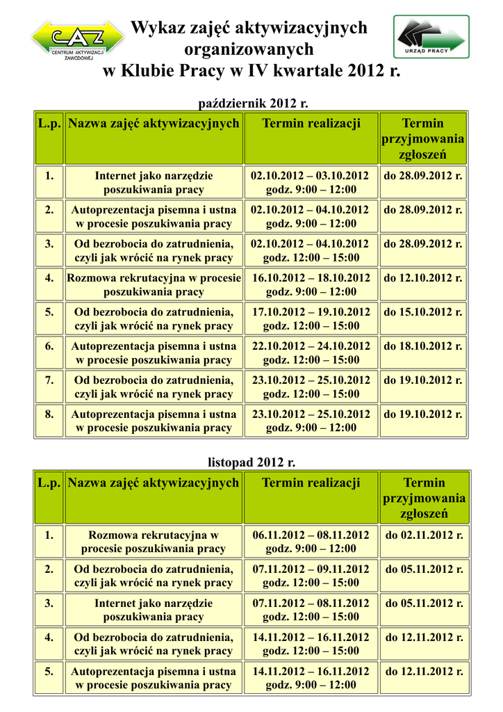 Wykaz zajęć aktywizacyjnych organizowanych w Klubie Pracy w IV