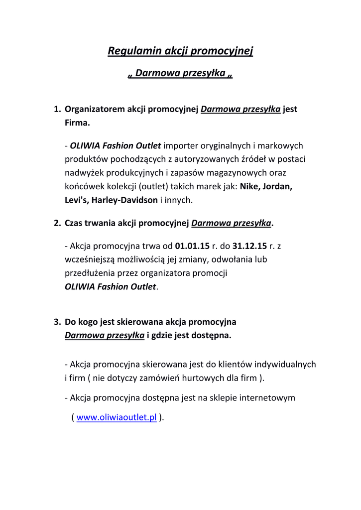 Regulamin akcji promocyjnej „ Darmowa przesyłka „ 1. Organizatorem akcji promocyjnej Darmowa przesyłka jest Firma. - OLIWIA Fashion Outlet importer oryginalnych i markowych produktów pochodzących z autoryzowanych źródeł w postaci nadwyżek produkcyjnych i zapasów magazynowych oraz końcówek kolekcji (outlet) takich marek jak: Nike, Jordan, Levi's, Harley-Davidson i innych. 2. Czas trwania akcji promocyjnej Darmowa przesyłka. - Akcja promocyjna trwa od 01.01.15 r. do 31.12.15 r. z wcześniejszą możliwością jej zmiany, odwołania lub przedłużenia przez organizatora promocji OLIWIA Fashion Outlet. 3. Do kogo jest skierowana akcja promocyjna Darmowa przesyłka i gdzie jest dostępna. - Akcja promocyjna skierowana jest do klientów indywidualnych i firm ( nie dotyczy zamówień hurtowych dla firm ). - Akcja promocyjna dostępna jest na sklepie internetowym ( www.oliwiaoutlet.pl ). 4. Zasady akcji promocyjnej Darmowa przesyłka. - Klient zainteresowany uczestnictwem w akcji promocyjnej Darmowa przesyłka, musi spełnić warunek którym jest wysokość zamówienia powyżej 250 zł. A także wybór promocji podczas składania zamówienia na produkty - ubrania na naszym sklepie internetowym ( www.oliwiaoutlet.pl ), otrzymując bezpłatną przesyłkę dla złożonego zamówienia. - Wymiana/zamiana produktów w promocji darmowa przesyłka przeprowadzana jest na koszt kupującego. - W sytuacji zwrotu zamówienia lub jego części i niespełnienia warunków promocji koszt darmowej przesyłki zostanie odliczony od wartości całego zamówienia a pozostała wartość zwrócona klientowi na wskazane konto bankowe. 5. Zasady łączenia ofert i akcji promocyjnych. - Akcja promocyjna Darmowa przesyłka nie łączy się z innymi ofertami lub akcjami promocyjnymi.