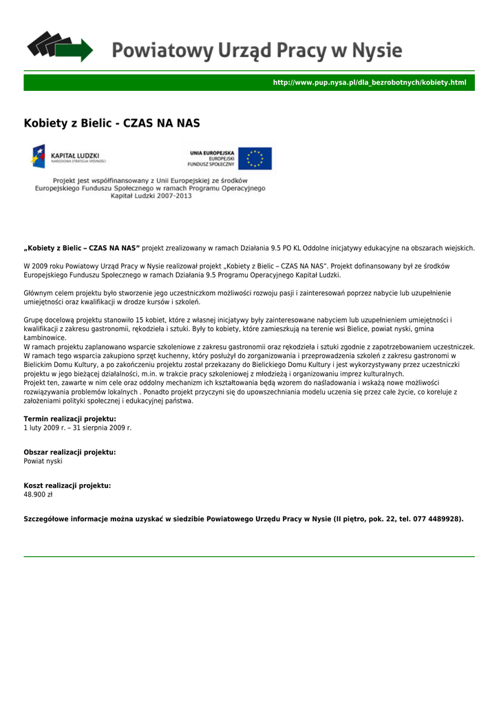 http://www.pup.nysa.pl/dla_bezrobotnych/kobiety.html Kobiety z Bielic - CZAS NA NAS „Kobiety z Bielic – CZAS NA NAS” projekt zrealizowany w ramach Działania 9.5 PO KL Oddolne inicjatywy edukacyjne na obszarach wiejskich. W 2009 roku Powiatowy Urząd Pracy w Nysie realizował projekt „Kobiety z Bielic – CZAS NA NAS”. Projekt dofinansowany był ze środków Europejskiego Funduszu Społecznego w ramach Działania 9.5 Programu Operacyjnego Kapitał Ludzki. Głównym celem projektu było stworzenie jego uczestniczkom możliwości rozwoju pasji i zainteresowań poprzez nabycie lub uzupełnienie umiejętności oraz kwalifikacji w drodze kursów i szkoleń. Grupę docelową projektu stanowiło 15 kobiet, które z własnej inicjatywy były zainteresowane nabyciem lub uzupełnieniem umiejętności i kwalifikacji z zakresu gastronomii, rękodzieła i sztuki. Były to kobiety, które zamieszkują na terenie wsi Bielice, powiat nyski, gmina Łambinowice. W ramach projektu zaplanowano wsparcie szkoleniowe z zakresu gastronomii oraz rękodzieła i sztuki zgodnie z zapotrzebowaniem uczestniczek. W ramach tego wsparcia zakupiono sprzęt kuchenny, który posłużył do zorganizowania i przeprowadzenia szkoleń z zakresu gastronomi w Bielickim Domu Kultury, a po zakończeniu projektu został przekazany do Bielickiego Domu Kultury i jest wykorzystywany przez uczestniczki projektu w jego bieżącej działalności, m.in. w trakcie pracy szkoleniowej z młodzieżą i organizowaniu imprez kulturalnych. Projekt ten, zawarte w nim cele oraz oddolny mechanizm ich kształtowania będą wzorem do naśladowania i wskażą nowe możliwości rozwiązywania problemów lokalnych . Ponadto projekt przyczyni się do upowszechniania modelu uczenia się przez całe życie, co koreluje z założeniami polityki społecznej i edukacyjnej państwa. Termin realizacji projektu: 1 luty 2009 r. – 31 sierpnia 2009 r. Obszar realizacji projektu: Powiat nyski Koszt realizacji projektu: 48.900 zł Szczegółowe informacje można uzyskać w siedzibie Powiatowego Urzędu Pracy w Nysie (II piętro, pok. 22, tel. 077 4489928).