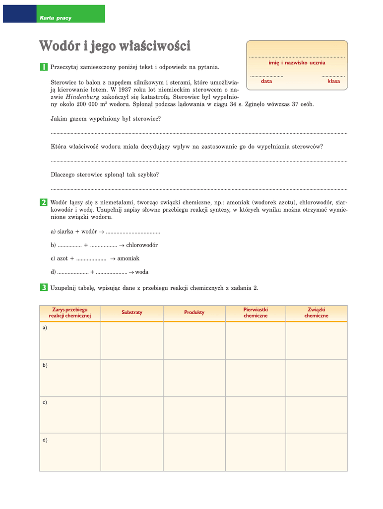 Karta pracy Wodór i jego właściwości Przeczytaj zamieszczony poniżej tekst i odpowiedz na pytania. .................................................................... imię i nazwisko ucznia ........................ data Sterowiec to balon z napędem silnikowym i sterami, które umożliwiają kierowanie lotem. W 1937 roku lot niemieckim sterowcem o nazwie Hindenburg zakończył się katastrofą. Sterowiec był wypełniony około 200 000 m3 wodoru. Spłonął podczas lądowania w ciągu 34 s. Zginęło wówczas 37 osób. ................. klasa Jakim gazem wypełniony był sterowiec? .................................................................................................................................................................................................................. Która właściwość wodoru miała decydujący wpływ na zastosowanie go do wypełniania sterowców? .................................................................................................................................................................................................................. Dlaczego sterowiec spłonął tak szybko? .................................................................................................................................................................................................................. Wodór łączy się z niemetalami, tworząc związki chemiczne, np.: amoniak (wodorek azotu), chlorowodór, siarkowodór i wodę. Uzupełnij zapisy słowne przebiegu reakcji syntezy, w których wyniku można otrzymać wymienione związki wodoru. a) siarka + wodór → .................................... b) ................ + .................. → chlorowodór c) azot + .................... → amoniak d) ..................... + ..................... → woda Uzupełnij tabelę, wpisując dane z przebiegu reakcji chemicznych z zadania 2. Zarys przebiegu reakcji chemicznej a) b) c) d) Substraty Produkty Pierwiastki chemiczne Związki chemiczne