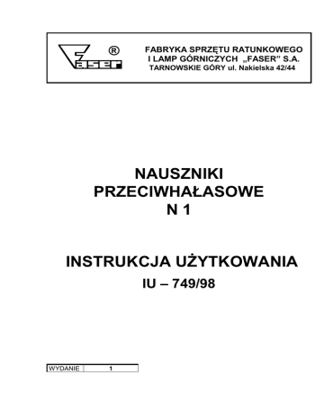 FABRYKA SPRZĘTU RATUNKOWEGO I LAMP GÓRNICZYCH „FASER” S.A. TARNOWSKIE GÓRY ul. Nakielska 42/44 NAUSZNIKI PRZECIWHAŁASOWE N1 INSTRUKCJA UŻYTKOWANIA IU – 749/98 WYDANIE 1 2 1. PRZEZNACZENIE Nauszniki przeciwhałasowe typu N 1 służą do zabezpieczenia narządu słuchu przed niepożądanymi skutkami działania hałasu. Spełniają wymagania normy PN-EN 352-1. Mogą być stosowane w podziemnych zakładach górniczych w polach niemetalowych i metanowych w pomieszczeniach zaliczonych do stopnia „a”, „b” i „c” niebezpieczeństwa wybuchu. 2. OPIS TECHNICZNY 2.1. Dane techniczne Masa nauszników Siła docisku Ciśnienie poduszek uszczelniających 240±5 g 11 N 3000 Pa Tłumienie dźwięku i odchylenie standardowe nauszników typu N 1 (wyznaczone wg. normy EN 24869) Częstotliwość środkowa [Hz] Średnia wartość tłumienia [dB] Odchylenie standardowe [dB] Minimalne tłumienie APV1 [dB] 63 11,4 3,1 8,3 125 14,4 2,5 11,9 250 20,0 2,7 17,3 500 28,5 2,4 26,1 1000 2000 4000 8000 30,2 25,4 31,0 33,2 2,6 2,8 3,2 5,3 27,6 22,5 27,7 27,9 H = 24,8 [dB] M = 24,6 [dB] L = 18,7 [dB] SNR = 25,9 [dB] 2.2. Konstrukcja (Rysunek A) Nauszniki przeciwhałasowe typu N 1 są tak zaprojektowane i wykonane aby zapewnić ochronę i komfort użytkownika. Składają się z dwóch czasz tłumiących 1 oraz sprężyny dociskowej 2, wykonanych z tworzywa sztucznego. Sprężyna dociskowa ma otwory do regulacji wysokości położenia czasz. Czasza składa się ze sztywnej skorupy 3, poduszki uszczelniającej 4 oraz wykładziny tłumiącej 5. Na środkową część sprężyny dociskowej nasunięta jest wykładzina sprężyny 6. 3 Rys.A 2.3. Działanie Nauszniki przeciwhałasowe N 1 tworzą dwie identyczne czasze tłumiące dociskane sprężyną z odpowiednią siłą do okołousznej powierzchni głowy zapewniając dobrą szczelność. Zadaniem czaszy tłumiącej jest jak najlepsze odcięcie ucha zewnętrznego od hałasu docierającego do niego z zewnątrz. 3.SPOSÓB UŻYTKOWANIA 3.1. Czynności przed użyciem Instrukcja zakładania 1. Sprężynę dociskową należy nastawić na wymaganą długość. 2. Następnie należy ją tak wyregulować aby czasze nauszników obejmowały małżowiny uszne i je zakrywały. Poduszki uszczelniające powinny przylegać do bocznej części głowy i do powierzchni wokół uszu. 3. Sprężyna dociskowa podczas użytkowania powinna być na szczycie głowy. Rys.B 4 Uwaga : W celu zwiększenia skuteczności nauszników przeciwhałasowych i lepszego przylegania poduszek uszczelniających należy włosy odsunąć do tyłu. Jeśli jednocześnie konieczne jest stosowanie okularów należy wybrać takie których zauszniki są cienkie i przylegające do głowy. 3.2. Czynności w czasie użycia Nauszniki powinny być stosowane przez cały czas przebywania w obszarze hałaśliwym. Powinny być odpowiednio dopasowane i wyregulowane przez użytkownika oraz użytkowane zgodnie z niniejszą instrukcją. 3.3. Czynności po użyciu Po każdorazowym użytkowaniu nauszników należy sprawdzić czy poszczególne części nie mają śladów pęknięć a następnie poddać je konserwacji. 4. KONSERWACJA I NAPRAWY 4.1. Konserwacja Po każdorazowym użytkowaniu nauszników , poduszki uszczelniające należy przetrzeć szmatką Nauszniki przeciwhałasowe typu N 1 należy czyścić wodą z dodatkiem mydła. Do czyszczenia nie należy używać rozpuszczalników ani ostrych szczotek, które mogłyby uszkodzić nauszniki. 4.2. Naprawy W przypadku wystąpienia uszkodzeń elementów oznaczonych „X” w wykazie części montażowych należy je wymienić na nowe. Poduszki uszczelniające należy wymienić po 3 miesiącach pracy ze względu na ich zużycie i utratę parametrów. 5. KONTROLA OKRESOWA 1. Nauszniki przeciwhałasowe należy poddawać regularnej kontroli odpowiednich służb ze względu na ich przydatność. (np. BHP) 2. Kontroluje się elastyczność sprężyny dociskowej sprawdzając jej powrót do normalnej postaci po niewielkim wygięciu, oraz sprawdza wizualnie czy zapewnia właściwe przyleganie czasz nauszników do głowy. 3. Nauszniki przeciwhałasowe , a szczególnie poduszki uszczelniające mogą się zużywać i powinny być często kontrolowane, czy np. nie uległy pęknięciu. 6. PAKOWANIE , PRZECHOWYWANIE I TRANSPORT 5 6.1. Pakowanie Nauszniki przeciwhałasowe N 1 wraz z instrukcją użycia i zaświadczeniem fabrycznym pakowane są do pudełka tekturowego, a następnie po 8 szt. do pudła kartonowego. 6.2. Przechowywanie Nauszniki przeciwhałasowe należy przechowywać w pomieszczeniach czystych, suchych i przewiewnych, nie zawierających substancji żrących i toksycznych. Do przechowywania nauszników przeciwhałasowych mogą być użyte torebki lub pudełka. Należy upewnić się, czy sprężyna nie jest napięta, a poduszki uszczelniające nie są zniekształcone. Nauszników nie należy przechowywać w temperaturze powyżej 50 0 C i w 0 temperaturze poniżej -20 C ponieważ mogą utracić swoje właściwości ochronne. 6.3. Transport Nauszniki w opakowaniu fabrycznym można przewozić dowolnymi środkami transportu pod warunkiem zabezpieczenia ich przed wpływami atmosferycznymi i uszkodzeniami mechanicznymi. 7. UWAGI DODATKOWE 7.1 Czas utrzymania właściwości ochronnych nauszników pod warunkiem prawidłowego ich stosowania wynosi 3 lata od daty produkcji. Jeżeli zalecenia niniejszej instrukcji nie będą przestrzegane to skuteczność działania nauszników będzie zmniejszona. Pewne substancje chemiczne mogą oddziaływać szkodliwie na produkt. Szczegółowych informacji na ten temat udziela producent. 7.2. Warunki gwarancji Producent udziela gwarancji na wady i usterki powstałe nie z winy użytkownika zgodnie z zaświadczeniem fabrycznym. Nie udziela się gwarancji na elementy zużywające się podczas normalnej eksploatacji jak poduszki uszczelniające, wykładziny tłumiące, wykładzinę sprężyny i łączniki. 7.3. Wykaz części montażowych obejmuje częśc