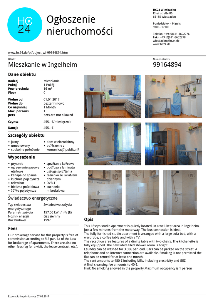 Ogłoszenie nieruchomości HC24 Wiesbaden Rheinstraße 86 65185 Wiesbaden Poniedziałek – Piątek: 9.00 – 17.00 Telefon: +49 (0)611-3602276 Faks: +49 (0)611-3602278 [email protected] www.hc24.de www.hc24.de/pl/object_wi-99164894.htm Obiekt Numer obiektu Mieszkanie w Ingelheim 99164894 Dane obiektu Rodzaj Pokój Powierzchnia Floor Mieszkania 1 Pokój 16 m² 0 Wolne od Wolne do Co najmniej Max. persons pets 01.04.2017 bezterminowo 1 Month 1 pets are not allowed Czynsz 455,- €/miesięcznie Kaucja 455,- € Szczegóły obiektu jasny umeblowany spokojne po?o?enie dom wielorodzinny po??czenie z komunikacj? publiczn? Wyposażenie prysznic ogrzewanie gazowe eta?owe kanapa do spania kuchnia pojedyncza telewizor bielizna po?cielowa ?ó?ko pojedyncze sprz?tanie ko?cowe pod?oga z laminatu us?uga sprz?tania ?azienka ze ?wiat?em dziennym DVB-T kuchenka mikrofalowa Świadectwo energetyczne Typ świadectwa energetycznego Parametr zużycia Nośnik energii Rok budowy Świadectwo zużycia 157,00 kWh/m²a (E) Gaz ziemny 1997 Fees Our brokerage service for this property is free of commission according to § 2 par. 1a of the Law for brokerage of apartments. There are also no other fees (eg for a visit, the lease contract, etc.). Exposição imprimida aos 07.03.2017 Powered by TCPDF (www.tcpdf.org) Opis This 16sqm studio apartment is quietly located, in a well-kept area in Ingelheim, just a few minutes from the motorway. The bus connection is ideal. The fully furnished studio apartment is arranged with a large sofa-bed, with a wardrobe, a coffee table and with a TV. The reception area features of a dining table with two chairs. The kitchenette is fully equipped. The new white tiled shower room is bright. Laundry can be washed for 3,50€ per load. Cars can be parked on the street. A telephone and an internet connection are available. Smoking is not permitted the flat can be rented for at least one month. The rent amounts to 450 € including bills, including electricity and GEZ. A final cleansing fee amounts to 40 €. Hint: No smoking allowed in the property.Maximum occupancy is 1 person