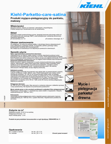 Kiehl-Parketto-care-satina Produkt myjąco-pielęgnacyjny do parkietu, matowy ⎯⎯⎯⎯⎯⎯⎯⎯⎯⎯⎯⎯⎯⎯⎯⎯⎯⎯⎯⎯⎯⎯⎯⎯⎯⎯⎯ Właściwości Wysycha matowo, odporny na ścieranie i zabrudzanie, antypoślizgowy. Produkt stosuje się w rozcieńczeniu lub nie rozcieńczony. Skład Niejonowe związki powierzchniowo-czynne, dyspersje tworzywa sztucznego wolne od soli metalicznych (nie zawierają TBEP), woski polietylenowe, substancje pomocnicze, substancje zapachowe. pH (koncentratu): ok. 7,5 pH (roztworu roboczego): ok. 7 Obszar zastosowania Do pielęgnacji i do pokrycia powłoką podłóg z naturalnego drewna zabezpieczonych przez parkieciarza i gotowego parkietu. W przypadku parkietu gotowego należy przeprowadzić wcześniej test na przyczepność. Nie nadaje się do woskowanych lub olejowanych powierzchni drewnianych. Sposób użycia Nakładanie powłok: Powłoka osiąga doskonałą przyczepność oraz optykę tylko na powierzchniach czystych, wolnych od tłuszczu, wosku, silikonu i pyłu. Przed rozpoczęciem prac należy mocno wstrząsnąć produktem. Ok. 250 ml nie rozcieńczonego środka wylać na podłogę i natychmiast rozprowadzić go cienką warstwą na powierzchni ok. 10 m² równomiernie zachodzącymi na siebie torami za pomocą baranka lub mopa. Pracować ruchem ciągłym (od mokrego toru do mokrego toru). Wymagane są w zależności od właściwości powierzchni 1-2 warstwy co ok. 90 min. Tylko suchy film tworzy warstwę pielęgnacyjną odporną na ścieranie. Pielęgnacja okresowa: Ok. 250 ml na 8 L zimnej wody. Mop zanurzyć w roztworze roboczym, dokładnie wycisnąć i zmyć powierzchnię. Nie dopuścić do przemoczenia powierzchni! Polerowanie: Wyschniętą warstwę pielęgnacyjną można utwardzić poprzez polerowanie maszyną szybkoobrotową (ok. 1000 obr./min.) i padem Multi-Disc. Wypolerowana powłoka nie jest śliska 07.04.2006 11.09.2007 Mycie metodą spray w celu usunięcia punktowych uszkodzeń filmu pielęgnacyjnego: Rozcieńczyć z zimną wodą 1:1, pracować przy użyciu butelki z rozpylaczem, maszyny szybkoobrotowej (ok. 1000 obr. /min.). Zużycie na m² Nakładanie powłok: 25-30 ml na warstwę Pielęgnacja okresowa: 1 ml Mycie metodą spray: 1,5 ml Produkt nie jest produktem konsumenckim w myśl dyrektywy 1999/44/WE Art. 1! Opakowanie 6/1 L butelek w kartonie 10 L kanister Art.-Nr. j 22 11 01 Art.-Nr. j 22 11 10 Chronić przed mrozem! Mycie i pielęgnacja parkietu/ drewna www.kiehl-zegarski.pl Nowo wyprodukowane powierzchnie drewniane: (Zabezpieczone na miejscu) należy czyścić w okresie utwardzania podanym przez producenta a jest to zazwyczaj 8-14 dni tylko na sucho. Przed zastosowaniem produktu Kiehl-Parketto-care-satina z powierzchni należy usunąć kurz wilgotną ściereczką. W przypadku brudu przylegającego, powierzchnię umyć na wilgotno Kiehl-Parketto-clean-Konzentrat. Zniszczone powierzchnie drewniane: Należy wyczyścić najpierw maszynowo na sucho (maszyną jednotarczową, aparatem ssącym, odkurzaczem, padem Kiehl-Legno-Pad). Maszynę należy prowadzić torem spiralnym aż do równomiernego wyczyszczenia powierzchni, usunięcia z porów powierzchniowo zalegającego brudu i uzyskania jednolitej optyki. Nie zebrany odkurzaczem mikropył należy usunąć wilgotną ściereczką.