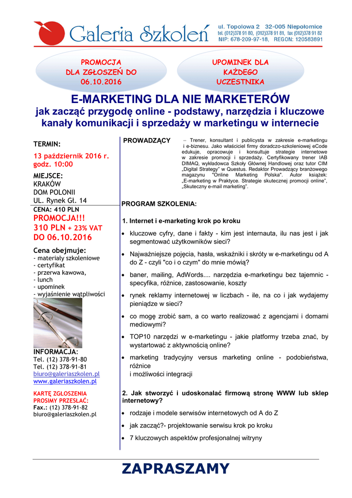 PROMOCJA DLA ZGŁOSZEŃ DO 06.10.2016 UPOMINEK DLA KAŻDEGO UCZESTNIKA E-MARKETING DLA NIE MARKETERÓW jak zacząć przygodę online - podstawy, narzędzia i kluczowe kanały komunikacji i sprzedaży w marketingu w internecie TERMIN: 13 październik 2016 r. godz. 10:00 MIEJSCE: KRAKÓW DOM POLONII UL. Rynek Gł. 14 CENA: 410 PLN PROMOCJA!!! 310 PLN + 23% VAT DO 06.10.2016 Cena obejmuje: - materiały szkoleniowe certyfikat przerwa kawowa, lunch upominek wyjaśnienie wątpliwości PROWADZĄCY – Trener, konsultant i publicysta w zakresie e-marketingu i e-biznesu. Jako właściciel firmy doradczo-szkoleniowej eCode edukuje, opracowuje i konsultuje strategie internetowe w zakresie promocji i sprzedaży. Certyfikowany trener IAB DIMAQ, wykładowca Szkoły Głównej Handlowej oraz tutor CIM „Digital Strategy” w Questus. Redaktor Prowadzący branżowego magazynu "Online Marketing Polska". Autor książek: „E-marketing w Praktyce. Strategie skutecznej promocji online”, „Skuteczny e-mail marketing”. PROGRAM SZKOLENIA: 1. Internet i e-marketing krok po kroku kluczowe cyfry, dane i fakty - kim jest internauta, ilu nas jest i jak segmentować użytkowników sieci? Najważniejsze pojęcia, hasła, wskaźniki i skróty w e-marketingu od A do Z - czyli "co i o czym" do mnie mówią? baner, mailing, AdWords.... narzędzia e-marketingu bez tajemnic specyfika, różnice, zastosowanie, koszty rynek reklamy internetowej w liczbach - ile, na co i jak wydajemy pieniądze w sieci? co mogę zrobić sam, a co warto realizować z agencjami i domami mediowymi? INFORMACJA: Tel. (12) 378-91-80 Tel. (12) 378-91-81 [email protected] www.galeriaszkolen.pl KARTĘ ZGŁOSZENIA PROSIMY PRZESŁAĆ: Fax.: (12) 378-91-82 [email protected] TOP10 narzędzi w e-marketingu - jakie platformy trzeba znać, by wystartować z aktywnością online? marketing tradycyjny versus marketing online - podobieństwa, różnice i możliwości integracji 2. Jak stworzyć i udoskonalać firmową stronę WWW lub sklep internetowy? rodzaje i modele serwisów internetowych od A do Z jak zacząć?- projektowanie serwisu krok po kroku 7 kluczowych aspektów profesjonalnej witryny ZAPRASZAMY jak przygotować treści, grafiki i mechanizmy do publikacji online? jak wybrać platformę do budowy serwisu internetowego? 5 kluczowych wariantów – od opcji bezpłatnych po komercyjne rozwiązania przypadek szczególny - projektowanie rozwiązań e-commerce i portali informacyjnych Ćwiczenie praktyczne - projektowanie WWW 3. Moja pierwsza kampania w internecie – jak zacząć? jak definiować realne cele działań reklamowych online? kto jest moją grupą docelową? – identyfikacja i sposoby skutecznego docierania do klientów w sieci jak wybrać narzędzia e-marketingu w zależności od celu kampanii i grupy odbiorców? – kiedy postawić na wyszukiwarki a kiedy wysłać mailing? w jaki sposób przygotować formaty i kreacje reklamowe? czym się kierować reklamową? i jak skutecznie dobierać powierzchnię praktyczne aspekty planowania budżetu i harmonogramu, czyli ile „to” kosztuje? Ćwiczenie praktyczne - planowanie kampanii reklamowej 4. Co i jak mierzyć w internecie? jak mierzyć i interpretować statystyki i ruch na WWW? popularne narzędzia do monitorowania ruchu – bezpłatne i płatne jak weryfikować skuteczności działań reklamowo-promocyjnych? co warto mierzyć i analizować najważniejsze wskaźniki efektywności działań – interpretacja danych i wartości rynkowe przykładowe raporty, badania 5. Odpowiedzi na pytania, konsultacje. ZAPRASZAMY i statystyki