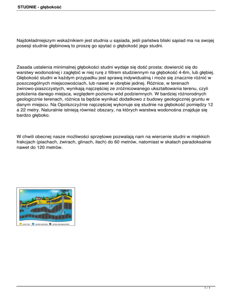 STUDNIE - głębokość Najdokładniejszym wskaźnikiem jest studnia u sąsiada, jeśli państwa bliski sąsiad ma na swojej posesji studnie głębinową to proszę go spytać o głębokość jego studni. Zasada ustalenia minimalnej głębokości studni wydaje się dość prosta: dowiercić się do warstwy wodonośnej i zagłębić w niej rurę z filtrem studziennym na głębokość 4-6m, lub głębiej. Głębokość studni w każdym przypadku jest sprawą indywidualną i może się znacznie różnić w poszczególnych miejscowościach, lub nawet w obrębie jednej. Różnice, w terenach żwirowo-piaszczystych, wynikają najczęściej ze zróżnicowanego ukształtowania terenu, czyli położenia danego miejsca, względem poziomu wód podziemnych. W bardziej różnorodnych geologicznie terenach, różnica ta będzie wynikać dodatkowo z budowy geologicznej gruntu w danym miejscu. Na Opolszczyźnie najczęściej wykonuje się studnie na głębokość pomiędzy 12 a 22 metry. Naturalnie istnieją również obszary, na których warstwa wodonośna znajduje się bardzo głęboko. W chwili obecnej nasze możliwości sprzętowe pozwalają nam na wiercenie studni w miękkich frakcjach (piachach, żwirach, glinach, iłach) do 60 metrów, natomiast w skałach paradoksalnie nawet do 120 metrów. 1/1