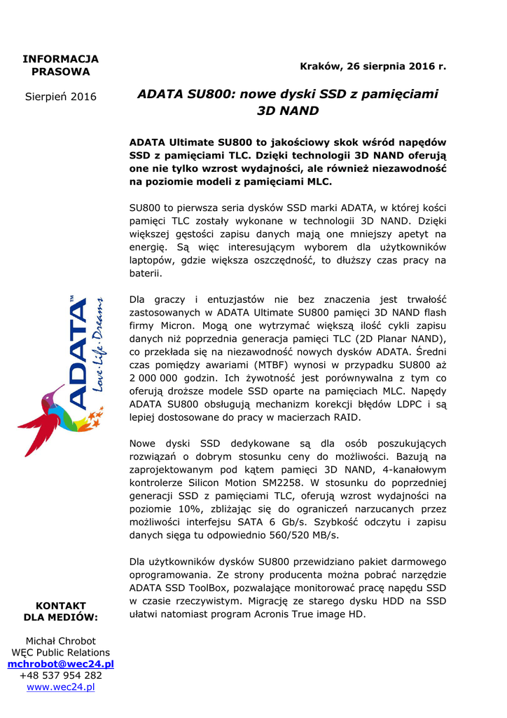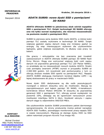 INFORMACJA PRASOWA Sierpień 2016 Kraków, 26 sierpnia 2016 r. ADATA SU800: nowe dyski SSD z pamięciami 3D NAND ADATA Ultimate SU800 to jakościowy skok wśród napędów SSD z pamięciami TLC. Dzięki technologii 3D NAND oferują one nie tylko wzrost wydajności, ale również niezawodność na poziomie modeli z pamięciami MLC. SU800 to pierwsza seria dysków SSD marki ADATA, w której kości pamięci TLC zostały wykonane w technologii 3D NAND. Dzięki większej gęstości zapisu danych mają one mniejszy apetyt na energię. Są więc interesującym wyborem dla użytkowników laptopów, gdzie większa oszczędność, to dłuższy czas pracy na baterii. Dla graczy i entuzjastów nie bez znaczenia jest trwałość zastosowanych w ADATA Ultimate SU800 pamięci 3D NAND flash firmy Micron. Mogą one wytrzymać większą ilość cykli zapisu danych niż poprzednia generacja pamięci TLC (2D Planar NAND), co przekłada się na niezawodność nowych dysków ADATA. Średni czas pomiędzy awariami (MTBF) wynosi w przypadku SU800 aż 2 000 000 godzin. Ich żywotność jest porównywalna z tym co oferują droższe modele SSD oparte na pamięciach MLC. Napędy ADATA SU800 obsługują mechanizm korekcji błędów LDPC i są lepiej dostosowane do pracy w macierzach RAID. Nowe dyski SSD dedykowane są dla osób poszukujących rozwiązań o dobrym stosunku ceny do możliwości. Bazują na zaprojektowanym pod kątem pamięci 3D NAND, 4-kanałowym kontrolerze Silicon Motion SM2258. W stosunku do poprzedniej generacji SSD z pamięciami TLC, oferują wzrost wydajności na poziomie 10%, zbliżając się do ograniczeń narzucanych przez możliwości interfejsu SATA 6 Gb/s. Szybkość odczytu i zapisu danych sięga tu odpowiednio 560/520 MB/s. KONTAKT DLA MEDIÓW: Michał Chrobot WĘC Public Relations [email protected] +48 537 954 282 www.wec24.pl Dla użytkowników dysków SU800 przewidziano pakiet darmowego oprogramowania. Ze strony producenta można pobrać narzędzie ADATA SSD ToolBox, pozwalające monitorować pracę napędu SSD w czasie rzeczywistym. Migrację ze starego dysku HDD na SSD ułatwi natomiast program Acronis True image HD. INFORMACJA PRASOWA Sierpień 2016 Dyski ADATA Ultimate SU800 pojawią się w polskich sklepach w połowie września. Można je będzie kupić w czterech wersjach pojemnościowych: 128, 256, 512 GB oraz 1 TB. Ich sugerowane ceny detaliczne to odpowiednio: 189, 299, 549 oraz 1099 złotych. Dyski objęte są 3-letnią gwarancją producenta. Tagi: ADATA, ADATA Ultimate SU800, ADATA SU800, dyski SSD, Solid State Drive, dyski półprzewodnikowe, dyski twarde, dyski SATA, modernizacja komputera, modernizacja laptopa, 3D NAND TLC, ADATA SSD ToolBox, dysk do laptopa, dysk dla gracza, Acronis True image HD, Micron, Silicon Motion, SM2258 Więcej informacji nt. ADATA Ultimate SU800 SATA 6Gb/s: # Strona WWW: http://www.adata.com/en/ssd/feature/410 # Darmowe oprogramowanie: http://bit.ly/2bpVyGr # Karta produktu (PDF): http://bit.ly/2c0YMmu # Galeria zdjęć HiRes i komplet materiałów: http://bit.ly/2bkvif9 O firmie ADATA ADATA™ Technology to jeden z największych na świecie producentów modułów DRAM, przenośnych pamięci masowych oraz kart microSD i SD. Firma została założona w 2001 roku. Od samego początku rozwija się w oparciu o filozofię tworzenia innowacyjnych oraz wyjątkowych produktów. Ten prosty przepis, realizowany przez ponad dekadę, pozwolił stopniowo rozszerzać ofertę marki ADATA i zdobyć zaufanie milionów klientów na całym świecie. ADATA kieruje się hasłem – Love, Life, Dreams. Więcej informacji: www.adata.com ADATA Polska na FB: www.facebook.com/ADATAPolska KONTAKT DLA MEDIÓW: Michał Chrobot WĘC Public Relations [email protected] +48 537 954 282 www.wec24.pl