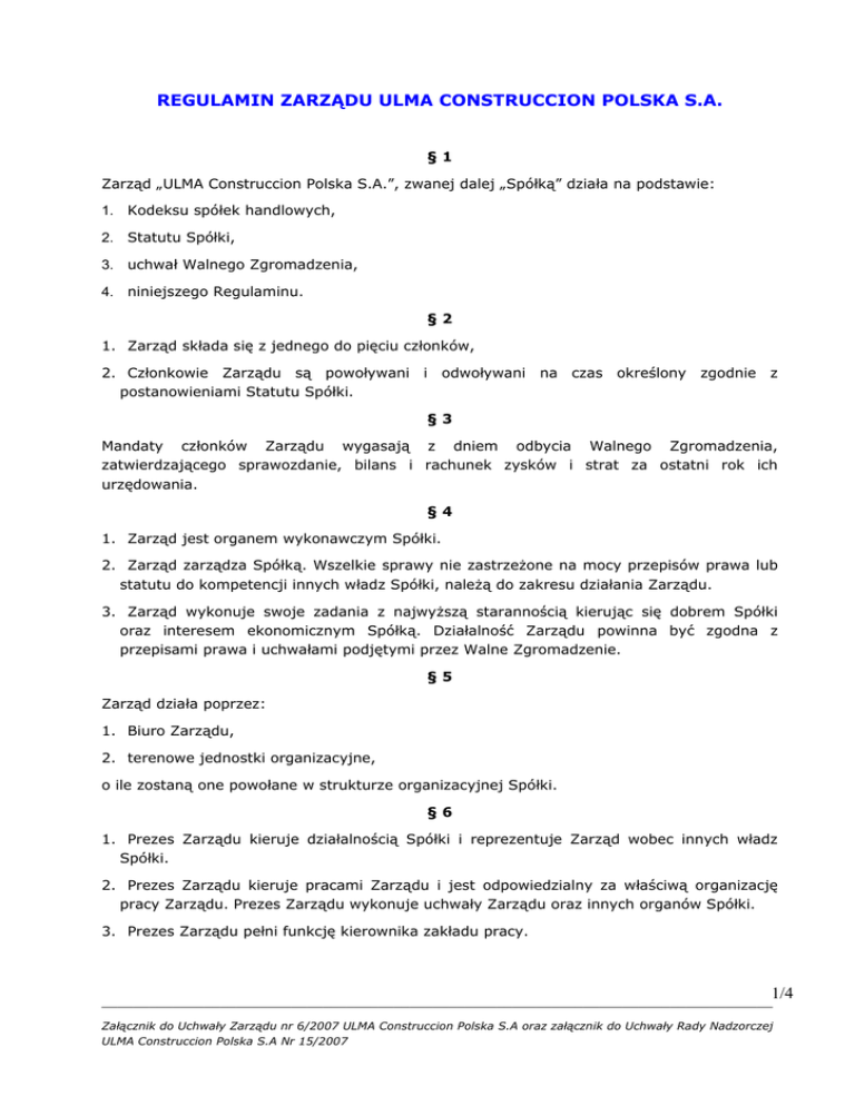 REGULAMIN ZARZĄDU ULMA CONSTRUCCION POLSKA S.A. §1 Zarząd „ULMA Construccion Polska S.A.”, zwanej dalej „Spółką” działa na podstawie: 1. Kodeksu spółek handlowych, 2. Statutu Spółki, 3. uchwał Walnego Zgromadzenia, 4. niniejszego Regulaminu. §2 1. Zarząd składa się z jednego do pięciu członków, 2. Członkowie Zarządu są powoływani i odwoływani na czas określony zgodnie z postanowieniami Statutu Spółki. §3 Mandaty członków Zarządu wygasają z dniem odbycia Walnego Zgromadzenia, zatwierdzającego sprawozdanie, bilans i rachunek zysków i strat za ostatni rok ich urzędowania. §4 1. Zarząd jest organem wykonawczym Spółki. 2. Zarząd zarządza Spółką. Wszelkie sprawy nie zastrzeżone na mocy przepisów prawa lub statutu do kompetencji innych władz Spółki, należą do zakresu działania Zarządu. 3. Zarząd wykonuje swoje zadania z najwyższą starannością kierując się dobrem Spółki oraz interesem ekonomicznym Spółką. Działalność Zarządu powinna być zgodna z przepisami prawa i uchwałami podjętymi przez Walne Zgromadzenie. §5 Zarząd działa poprzez: 1. Biuro Zarządu, 2. terenowe jednostki organizacyjne, o ile zostaną one powołane w strukturze organizacyjnej Spółki. §6 1. Prezes Zarządu kieruje działalnością Spółki i reprezentuje Zarząd wobec innych władz Spółki. 2. Prezes Zarządu kieruje pracami Zarządu i jest odpowiedzialny za właściwą organizację pracy Zarządu. Prezes Zarządu wykonuje uchwały Zarządu oraz innych organów Spółki. 3. Prezes Zarządu pełni funkcję kierownika zakładu pracy. _____________________________________________________________________________________1/4 Załącznik do Uchwały Zarządu nr 6/2007 ULMA Construccion Polska S.A oraz załącznik do Uchwały Rady Nadzorczej ULMA Construccion Polska S.A Nr 15/2007 4. W razie nieobecności Prezesa Zarządu jego funkcję pełni Wiceprezes Zarządu lub osoba stosownie upełnomocniona przez Prezesa Zarządu. §7 Zarząd podejmuje uchwały w sprawach przewidzianych prawem i Statutem Spółki, z zastrzeżeniem, że o ile podjęcie uchwały wymaga zgody Walnego Zgromadzenia Spółki lub Rady Nadzorczej Spółki, uchwała może być podjęta po uzyskaniu takiej zgody. Zarząd podejmuje uchwały w szczególności w sprawach dotyczących: 1. zwoływania Walnego Zgromadzenia Akcjonariuszy, 2. ustalania szczegółowej struktury organizacyjnej Spółki i regulaminów wewnętrznych, 3. udzielania i odwoływania prokur i pełnomocnictw, 4. zaciągania kredytów, 5. dokonywania inwestycji, 6. uchwalania zasad wynagradzania pracowników Spółki, 7. ustalania zasad i sposobu prowadzenia księgowości, 8. ustalania szczegółowych zasad gospodarki finansowej Spółki, 9. opracowania rocznych planów biznesowych Spółki, 10. opracowania wieloletnich planów rozwoju Spółki, 11. ustalania i ogłaszania terminu Zgromadzenie do wypłaty, wypłaty dywidendy przeznaczonej przez Walne 12. każdej sprawy wniesionej na posiedzenie Zarządu przez członka Zarządu. §8 1. Członek Zarządu może jednocześnie pełnić funkcję dyrektora albo innego pracownika Spółki. 2. Zarząd może powierzyć członkowi Zarządu realizację lub nadzór nad sprawami będącymi w kompetencji Zarządu – w ściśle określonym zakresie. Członek Zarządu odpowiedzialny za powierzone zadania – składa Zarządowi sprawozdanie z jego realizacji. 3. Członkowie Zarządu sprawują nadzór i odpowiadają za prace podporządkowanych im (zgodnie z uchwalonym podziałem pracy w ramach Zarządu) pionów oraz jednostek organizacyjnych Spółki i koordynują prace tych jednostek z całością prac Spółki. §9 Członkowie Zarządu otrzymują wynagrodzenie na zasadach i w wysokości ustalonej przez Radę Nadzorczą. § 10 1. Posiedzenia Zarządu zwołuje Prezes, a w razie jego nieobecności inny członek Zarządu. 2. Sprawy nie objęte porządkiem obrad nie będą przedmiotem podejmowanych uchwał bez zgody wszystkich członków Zarządu. głosowania, ani _____________________________________________________________________________________2/4 Załącznik do Uchwały Zarządu nr 6/2007 ULMA Construccion Polska S.A oraz załącznik do Uchwały Rady Nadzorczej ULMA Construccion Polska S.A Nr 15/2007 § 11 1. Zwołujący posiedzenie Zarządu ustala porządek obrad i przewodniczy obradom. Sprawy będące przedmiotem obrad referują członkowie Zarządu lub osoby zaproszone w celu omówienia poszczególnych tematów. 2. Członkowie Zarządu uczestniczą w jego posiedzeniach wyłącznie osobiście. 3. Członek lub członkowie Zarządu mogą uczestniczyć w posiedzeniu Zarządu za pośrednictwem telefonu służącego do przeprowadzania takich konferencji, video lub innego systemu, przy pomocy którego każdy członek może przemawiać do wszystkich pozostałych członków, słyszeć ich i być przez nich słyszanym. Taki udział w posiedzeniu uważa się za osobiste uczestnictwo. 4. W posiedzeniach Zarządu mogą brać udział z głosem doradczym osoby spoza składu Zarządu, jeżeli zwołujący posiedzenie uzna ich obecność za celową. 5. Udział członków Zarządu w posiedzeniach Zarządu jest obowiązkowy. Zarząd może z ważnych powodów usprawiedliwić nieobecność członka Zarządu na posiedzeniu Zarządu. § 12 1. Posiedzenia Zarządu odbywać się będą przynajmniej raz w miesiącu. 2. Wszystkie posiedzenia odbywać się będą w siedzibie Spółki lub w innym miejscu wskazanym przez zwołującego posiedzenie. 3. Posiedzenie Zarządu jest ważne bez względu na liczbę obecnych na nim członków Zarządu, jeżeli wszyscy członkowie Zarządu zostali o nim prawidłowo powiadomieni. § 13 1. Uchwały we wszelkich sprawach podejmowane będą przez Zarząd na posiedzeniach zwykłą większością głosów oddanych. 2. Każdy członek Zarządu posiada jeden głos. Prezesowi Zarządu przysługuje drugi lub decydujący głos. 3. Wszystkie głosowania Zarządu będą głosowaniami jaw