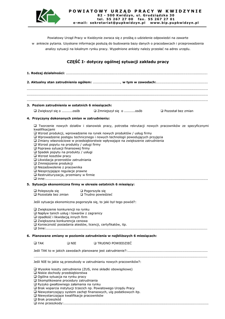 POWIATOWY URZĄD PRACY W KWIDZYNIE 82 - 500 Kwidzyn, ul. Grudziądzka 30 tel. 55 267 27 00 fax. 55 267 27 01 e-mail: [email protected] www.bip.pupkwidzyn.pl Powiatowy Urząd Pracy w Kwidzynie zwraca się z prośbą o udzielenie odpowiedzi na zawarte w ankiecie pytania. Uzyskane informacje posłużą do budowania bazy danych o pracodawcach i przeprowadzenia analizy sytuacji na lokalnym rynku pracy. Wypełnione ankiety należy przesłać na adres urzędu. CZĘŚĆ I- dotyczy ogólnej sytuacji zakładu pracy 1. Rodzaj działalności: ................................................................................................................................. 2. Aktualny stan zatrudnienia ogółem: ........................., w tym w zawodach:............................................... ..................................................................................................................................................................... ..................................................................................................................................................................... ..................................................................................................................................................................... 3. Poziom zatrudnienia w ostatnich 6 miesiącach: Zwiększył się o ..........osób Zmniejszył się o ..........osób Pozostał bez zmian 4. Przyczyny dokonanych zmian w zatrudnieniu: Tworzenie nowych działów i stanowisk pracy, potrzeba rekrutacji nowych pracowników ze specyficznymi kwalifikacjami Wzrost produkcji, wprowadzenie na rynek nowych produktów / usług firmy Wprowadzenie postępu technicznego i nowych technologii powodujących przyjęcia Zmiany własnościowe w przedsiębiorstwie wpływające na zwiększenie zatrudnienia Wzrost popytu na produkty / usługi firmy Poprawa sytuacji finansowej firmy Spadek popytu na produkty / usługi Wzrost kosztów pracy Likwidacja przerostów zatrudniania Zmniejszenie produkcji Niezadowolenie z pracownika Niesprzyjające regulacje prawne Restrukturyzacja, przemiany w firmie inne:.................................................................................................................................................... 5. Sytuacja ekonomiczna firmy w okresie ostatnich 6 miesięcy: Polepszyła się Pozostała bez zmian Pogorszyła się Trudno powiedzieć Jeśli sytuacja ekonomiczna pogorszyła się, to jaki był tego powód?: Zwiększenie konkurencji na rynku Napływ tanich usług i towarów z zagranicy Upadłość i likwidacją innych firm Zwiększona konkurencja cenowa Konieczność posiadania atestów, licencji, certyfikatów, itp. Inne:................................................................................................................................................... 6. Planowane zmiany w poziomie zatrudnienia w najbliższych 6 miesiącach: TAK NIE TRUDNO POWIEDZIEĆ Jeśli TAK to w jakich zawodach planowane jest zatrudnienie?:......................................................................... …............................................................................................................................................................ Jeśli NIE to jakie są przeszkody w zatrudnianiu nowych pracowników?: Wysokie koszty zatrudnienia (ZUS, inne składki obowiązkowe) Niskie dochody przedsiębiorstwa Ogólna sytuacja na rynku pracy Skomplikowane procedury zatrudniania Ryzyko gwałtownego załamania na rynku Brak wsparcia instytucji trzecich np. Powiatowego Urzędu Pracy Niewystarczający system zachęt finansowych, ulg podatkowych itp. Niewystarczające kwalifikacje pracowników Brak przeszkód inne przeszkody:.................................................................................................................................... 7. Niezbędne umiejętności potencjalnego pracownika: wiedza teoretyczna z zakresu umiejętności zawodowych umiejętność praktyczne związane z wykonywaniem danego zawodu (np. umiejętność obsługi kasy fiskalnej, podstawy księgowości, rachunkowości, prowadzenie pojazdu itp.) znajomość języków obcych (poziom.................................................................) umiejętność wykorzystania nowych technologii umiejętności adaptacyjne (np. samodyscyplina, odpowiedzialność, sumienność itp.) inne:.................................................................................................................................................... ............................................................................................................................................................... 8. Chęć korzystania z usług Powiatowego Urzędu Pracy: TAK NIE Jeśli TAK, to z jakich usług rynku pracy?: Pośrednictwo pracy EURES Poradnictwo zawodowe Szkolenia Jakimi formami pomocy byłaby zainteresowana Państwa firma? Pracami interwencyjnymi (refundacja części wynagrodzenia i części składek na ubezpieczenia społeczne) Refundacją kosztów wyposażenia lub doposażenia stanowiska pracy Stażami ( bez nawiązania stosunku pracy) Przygotowaniem zawodowym dorosłych (bez nawiązania stosunku pracy) Przeszkolenie osoby bezrobotnej w celu zatrudnienia (preferowany rodzaj szkolenia:................................................................................................................................................. ............................................................................................................................................................... inne:.................................................................................................................................................... CZĘŚĆ II – potrzeby szkoleniowe Prosimy zaznaczyć krzyżykiem –X oraz wymienić kierunek szkolenia, który jest zgodny z Państwa oczekiwaniami wobec przyszłych kandydatów do pracy w Państwa przedsiębiorstwie. Budowla