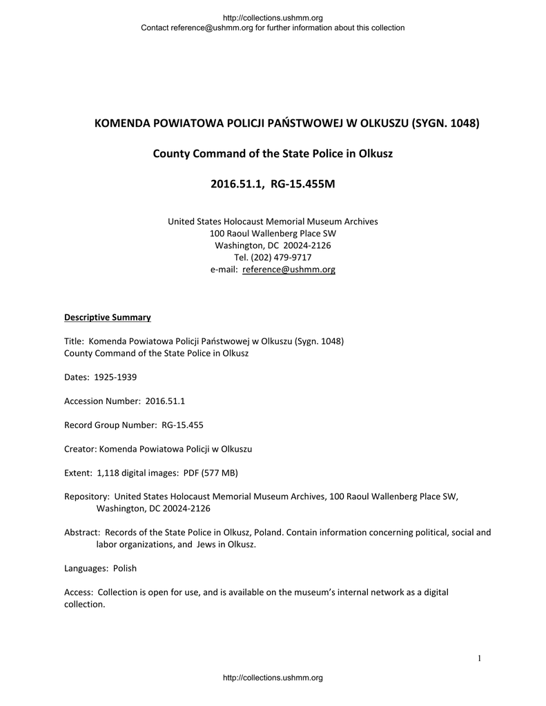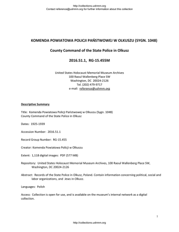 http://collections.ushmm.org Contact [email protected] for further information about this collection KOMENDA POWIATOWA POLICJI PAŃSTWOWEJ W OLKUSZU (SYGN. 1048) County Command of the State Police in Olkusz 2016.51.1, RG‐15.455M United States Holocaust Memorial Museum Archives 100 Raoul Wallenberg Place SW Washington, DC 20024‐2126 Tel. (202) 479‐9717 e‐mail: [email protected] Descriptive Summary Title: Komenda Powiatowa Policji Państwowej w Olkuszu (Sygn. 1048) County Command of the State Police in Olkusz Dates: 1925‐1939 Accession Number: 2016.51.1 Record Group Number: RG‐15.455 Creator: Komenda Powiatowa Policji w Olkuszu Extent: 1,118 digital images: PDF (577 MB) Repository: United States Holocaust Memorial Museum Archives, 100 Raoul Wallenberg Place SW, Washington, DC 20024‐2126 Abstract: Records of the State Police in Olkusz, Poland. Contain information concerning political, social and labor organizations, and Jews in Olkusz. Languages: Polish Access: Collection is open for use, and is available on the museum’s internal network as a digital collection. 1 http://collections.ushmm.org http://collections.ushmm.org Contact [email protected] for further information about this collection Reproduction and use: Reproduction of more than 100 pages of copies of documents for researchers or other institutions requires a written permission of the General Director of the State Archives of the Republic of Poland. Publication of more than 10 complete documents in an individual work requires the written authorization of the General Director. The Museum may not publish any archival material obtained from the General Director, including specific archives under his control, on the Internet, the World Wide Web, or any other publicly accessible on‐line network without the written permission of the General Director. Citation of the materials in any publication must refer to the Museum and the Polish State Archives and must include the name of the archival group and catalogue number of the originals. Preferred citation: (Identification of item), (identification of file), Reel number, Komenda Powiatowa Policji Państwowej w Olkuszu (Sygn. 1048), 1925‐1939, RG‐15.455, United States Holocaust Memorial Museum Archives, Washington, DC. Acquisition information: The United States Holocaust Memorial Museum Archives received the filmed collection via the United States Holocaust Memorial Museum International Archival Programs Division in Jan. 2016. This is a cooperative project based on the agreement between USHMM and Yad Vashem, Israel. Forms part of the Claims Conference International Holocaust Documentation Archive at the United States Holocaust Memorial Museum. This archive consists of documentation whose reproduction and/or acquisition was made possible with funding from the Conference on Jewish Material Claims Against Germany. Existence and location of originals: Archiwum Państwowe w Kielcach ul. Janusza Kusocińskiego 57 Kielce 25‐045 Poland Tel. 011 (0048 41) 260 53 11 e‐mail: [email protected] Web page: www.kielce.ap.gov.pl Copyright Holder: Naczelna Dyrekcja Archiwów Państwowych ul. Rakowiecka 20 Warsaw 02‐517 Poland Tel. 011 48 (22) 565‐46‐00 e‐mail: [email protected] Web page: www.archiwa.gov.pl The additional finding aid for the records of Sygn. 1048 housed at Archiwum Państwowe w Kielcach can be found at: http://baza.archiwa.gov.pl/sezam/sezam.php?l=pl&mode=show&zespoly id=22873 Accruals: Accruals may have been received since this collection was first processed, see archives catalog at collections.ushmm.org for further information. 2 http://collections.ushmm.org http://collections.ushmm.org Contact [email protected] for further information about this collection Processing history: Finding aid adapted from the inventory provided by the United States Holocaust Memorial Museum International Archival Programs Division by Aleksandra Borecka, May 2016. Scope and Content of Collection Reports and information from police informers relating to political, social and labor organizations. Includes police statistics, registers of crimes, and orders. System of Arrangement Arranged in six series: 1. Reports of police activities, 1921‐1924 2. Reports of social situation, 1925 3. Statistics and interrogation reports, 1920‐1929 4. General and situation reports, 1930, 1936 5. The list of criminal offenses, 1922‐1927, 1929‐1930, 1932‐1933, 1935‐1939 6. Orders and reports, 1930 to 1939. Indexing Terms Corporate Name: Komenda Powiatowa Policji w Olkuszu. Liga Pomocy Pracującym w Palestynie. Makabi ha‐tsaʻir (Associa on) Mizrachi. Ogólny Żydowski Związek Robotniczy "Bund" w Polsce. Stowarzyszenie Kupców i Rzemieślników Żydowskich. World Socialist Union of Jewish Workers‐‐Po'alei Zion. Genre/Form: Registers. Reports. Statistics. Geographic Name: Olkusz (Poland) Topical Term: Police‐‐Poland‐‐Olkusz‐‐History‐‐20th century. Crime and criminals‐‐Poland‐‐Olkusz‐‐History‐‐20th century. Criminal investigation‐‐Poland‐‐Olkusz‐‐History‐‐20th century‐‐Registers. Polish people‐‐Legal status, laws, etc.‐‐Poland‐‐Olkusz‐‐20th century. Jews‐‐Legal status, laws, etc.‐‐Poland‐‐Olkusz‐‐History‐‐20th century. 3 http://collections.ushmm.org http://collections.ushmm.org Contact [email protected] for further information about this collection Sygn. 4 Sprawozdanie o dochodzeniu w sprawie organizacji wiecu 1926‐1926 akta luźne, stan dobry, j. polski Sygn. 5 Sprawozdania 1926‐1927 k. 1‐4 Sprawozdanie informacyjne za styczeń 1926 r. Jest tutaj (k. 3‐4) precyzyjna charakterystyka wszystkich organizacji żydowskich działających na terenie tut. komendy, łącznie z ich przywódcami i pełną liczbą członków. Ponadto w charakterystyce pada następujące sformułowanie: „Żydzi (...) do Rządu odnoszą się nieprzychylnie, wykorzystując każdą chwilę na tle politycznem do celów spek