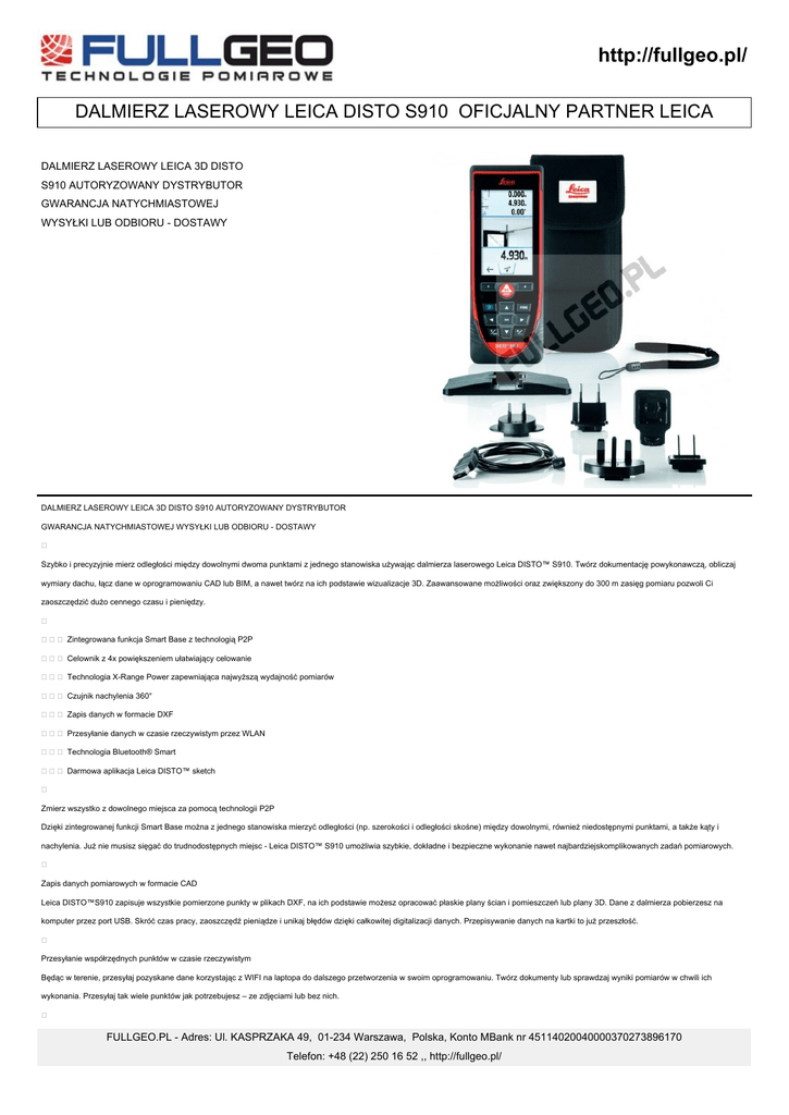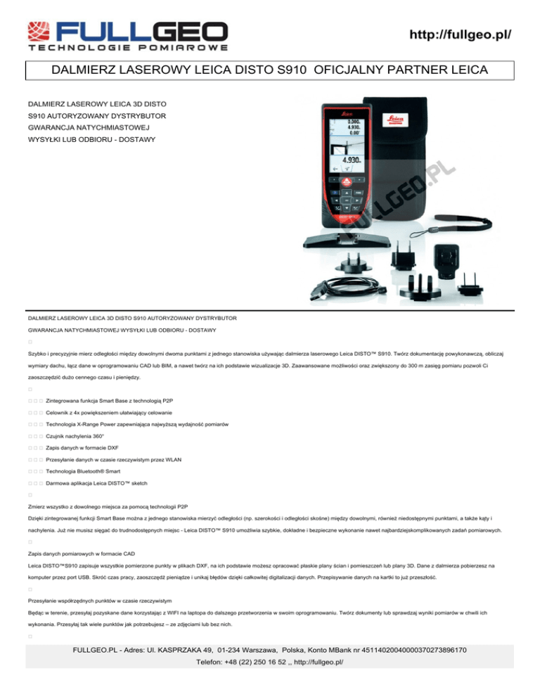 http://fullgeo.pl/ DALMIERZ LASEROWY LEICA DISTO S910 OFICJALNY PARTNER LEICA DALMIERZ LASEROWY LEICA 3D DISTO S910 AUTORYZOWANY DYSTRYBUTOR GWARANCJA NATYCHMIASTOWEJ WYSYŁKI LUB ODBIORU - DOSTAWY DALMIERZ LASEROWY LEICA 3D DISTO S910 AUTORYZOWANY DYSTRYBUTOR GWARANCJA NATYCHMIASTOWEJ WYSYŁKI LUB ODBIORU - DOSTAWY Szybko i precyzyjnie mierz odległości między dowolnymi dwoma punktami z jednego stanowiska używając dalmierza laserowego Leica DISTO™ S910. Twórz dokumentację powykonawczą, obliczaj wymiary dachu, łącz dane w oprogramowaniu CAD lub BIM, a nawet twórz na ich podstawie wizualizacje 3D. Zaawansowane możliwości oraz zwiększony do 300 m zasięg pomiaru pozwoli Ci zaoszczędzić dużo cennego czasu i pieniędzy. Zintegrowana funkcja Smart Base z technologią P2P Celownik z 4x powiększeniem ułatwiający celowanie Technologia X-Range Power zapewniająca najwyższą wydajność pomiarów Czujnik nachylenia 360° Zapis danych w formacie DXF Przesyłanie danych w czasie rzeczywistym przez WLAN Technologia Bluetooth® Smart Darmowa aplikacja Leica DISTO™ sketch Zmierz wszystko z dowolnego miejsca za pomocą technologii P2P Dzięki zintegrowanej funkcji Smart Base można z jednego stanowiska mierzyć odległości (np. szerokości i odległości skośne) między dowolnymi, również niedostępnymi punktami, a także kąty i nachylenia. Już nie musisz sięgać do trudnodostępnych miejsc - Leica DISTO™ S910 umożliwia szybkie, dokładne i bezpieczne wykonanie nawet najbardziejskomplikowanych zadań pomiarowych. Zapis danych pomiarowych w formacie CAD Leica DISTO™S910 zapisuje wszystkie pomierzone punkty w plikach DXF, na ich podstawie możesz opracować płaskie plany ścian i pomieszczeń lub plany 3D. Dane z dalmierza pobierzesz na komputer przez port USB. Skróć czas pracy, zaoszczędź pieniądze i unikaj błędów dzięki całkowitej digitalizacji danych. Przepisywanie danych na kartki to już przeszłość. Przesyłanie współrzędnych punktów w czasie rzeczywistym Będąc w terenie, przesyłaj pozyskane dane korzystając z WIFI na laptopa do dalszego przetworzenia w swoim oprogramowaniu. Twórz dokumenty lub sprawdzaj wyniki pomiarów w chwili ich wykonania. Przesyłaj tak wiele punktów jak potrzebujesz – ze zdjęciami lub bez nich. FULLGEO.PL - Adres: Ul. KASPRZAKA 49, 01-234 Warszawa, Polska, Konto MBank nr 45114020040000370273896170 Telefon: +48 (22) 250 16 52 ,, http://fullgeo.pl/ 300-metrowy zasięg pomiaru dzięki technologii X-Range Power http://fullgeo.pl/ Innowacyjna technologia X-Range Power sprawia, że Leica DISTO™ S910 kryje w sobie przyszłościową technologię wykonywania pomiarów. Dalmierz umożliwia wykonywanie pomiarów o zasięgu do 300 m i zapewnia pomiary nawet do obiektów słabo odbijających wiązkę lasera. Szybko i precyzyjnie mierz odległości między dowolnymi dwoma punktami z jednego stanowiska używając dalmierza laserowego Leica DISTO™ S910. Twórz dokumentację powykonawczą, obliczaj wymiary dachu, łącz dane w oprogramowaniu CAD lub BIM, a nawet twórz na ich podstawie wizualizacje 3D. Zaawansowane możliwości oraz zwiększony do 300 m zasięg pomiaru pozwoli Ci zaoszczędzić dużo cennego czasu i pieniędzy. Zintegrowana funkcja Smart Base z technologią P2P Celownik z 4x powiększeniem ułatwiający celowanie Technologia X-Range Power zapewniająca najwyższą wydajność pomiarów Czujnik nachylenia 360° Zapis danych w formacie DXF Przesyłanie danych w czasie rzeczywistym przez WLAN Technologia Bluetooth® Smart Darmowa aplikacja Leica DISTO™ sketch ZAWARTOŚĆ ZESTAWU Dalmierz laserowy Leica DISTO™ S910 Podstawa Smart Base Futerał Pasek na rękę Ładowarka USB z 4 wtyczkami Specyfikacje techniczne: Dokładność pomiaru ± 1 mm Zasięg pomiaru 0,05 do 300 m Technologia X-Range Power • Jednostki pomiarowe m, ft, in Odległość w metrach Ø plamki lasera w mm 10, 50, 100 m 6, 30, 60 mm Zakres pomiarów ze Smart Base W poziomie W pionie 360° -40° do 80° Odległość w metrach Tolerancja funkcji P2P 2, 5, 10 m 2, 5, 10 mm Zakres poziomowania ± 5° Celownik z 4x powiększeniem • Kamera szerokokątna • Format plików jpg, dxf Pamięć plików CAD 20 plików, każdy z 30 punktami Darmowe aplikacje dla Windows • Darmowe aplikacje mobilne iOS / Android Interfejs danych* Bluetooth® Smart, WLAN Ilość pomiarów na jednym zestawie baterii do 4000** Baterie Li-ion, wielokrotnego ładowania Czas ładowania 4h Klasa odporności IP 54 FULLGEO.PL - Adres: Ul. KASPRZAKA 49, 01-234 Warszawa, Polska, Konto MBank nr 45114020040000370273896170 Telefon: +48 (22) 250 16 52 ,, http://fullgeo.pl/ Wymiary 164x61x32 mm http://fullgeo.pl/ Waga z bateriami 290 g *) Wymagania systemowe i inne dane znajdziesz na stronie http://www.disto.com/ **) Mniej w trybie Bluetooth® lub WLAN Funkcje: Pomiar odległości • Pomiar maks. / min. odległości • Odejmowanie / dodawanie • Pomiar powierzchni / objętości • Wspomaganie prac malarskich • Pomiar pochylenia • Smart Horizontal Mode • Pomiar obiektów pochyłych • Wysokościowe pomiary śledzące • Pomiary profili wysokościowych • Celownik z 4x powiększeniem • Kamera • Pomiary na zdjęciach • Ustawienia osobiste • Ekran dotykowy • Kompas • Pomiar od punktu do punktu • Inteligentny pomiar kątów • Inteligentny pomiar powierzchni • Zapis danych w DXF • Przesyłanie danych przez WiFi • Bluetooth® SMART • Osługiwane urządzenia mobilne Łączność bezprzewodowa Transfer danych iPhone 4S, iPhone 5, iPhone 6, iPhone 6 plus Bluetooth® 4.0 w aplikacji lub z klawiatury* iPad mini Bluetooth® 4.0 w aplikacji lub z klawiatury* iPad 3 I nowsze wersje Bluetooth® 4.0 w aplikacji lub z klawiatury* iPod touch (piąte generacja) Bluetooth® 4.0 w aplikacji lub z klawiatury* Smartfony i tablet z Android 4.3 lub nowszym Bluetooth® 4.0 w aplikacji Tablety i Notebooki z Windows 8.1 lub nowszym Bluetooth® 4.0 DISTO™ transfer, tryb klawia
