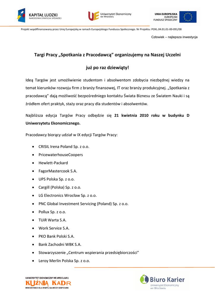 Projekt współfinansowany przez Unię Europejską w ramach Europejskiego Funduszu Społecznego. Nr Projektu: POKL.04.01.01‐00‐091/08 Człowiek – najlepsza inwestycja Targi Pracy „Spotkania z Pracodawcą” organizujemy na Naszej Uczelni już po raz dziewiąty! Ideą Targów jest umożliwienie studentom i absolwentom zdobycia niezbędnej wiedzy na temat kierunków rozwoju firm z branży finansowej, IT oraz branży produkcyjnej. „Spotkania z pracodawcą” dają możliwość bezpośredniego kontaktu Świata Biznesu ze Światem Nauki i są źródłem ofert praktyk, staży oraz pracy dla studentów i absolwentów. Najbliższa edycja Targów Pracy odbędzie się 21 kwietnia 2010 roku w budynku D Uniwersytetu Ekonomicznego. Pracodawcy biorący udział w IX edycji Targów Pracy: • CRISIL Irena Poland Sp. z o.o. • PricewaterhouseCoopers • Hewlett‐Packard • FagorMastercook S.A. • UPS Polska Sp. z o.o. • Cargill (Polska) Sp. z o.o. • LG Electronics Wrocław Sp. z o.o. • PNC Global Investment Servicing (Poland) Sp. z o.o. • Pollux Sp. z o.o. • TUiR Warta S.A. • Work Service S.A. • PKO Bank Polski S.A. • Bank Zachodni WBK S.A. • Stowarzyszenie „Centrum wspierania przedsiębiorczości” • Leroy Merlin Polska Sp. z o.o. Projekt współfinansowany przez Unię Europejską w ramach Europejskiego Funduszu Społecznego. Nr Projektu: POKL.04.01.01‐00‐091/08 • AXA Polska S.A. • ING Bank Polski S.A. • LKW Walter Internationale Transportorganisation AG • Dolnośląski Wojewódzki Urząd Pracy w Wałbrzychu • Centrum Informacji Zawodowej • Call Center Inter Galactica Sp. z o.o. • AG Test Hr Janusz Dziewit • Euro Bank S.A. • Top Emplyers Polska • Advisory Group TEST Human Resources • BRE BANK S.A. MultiBank • KarierawFinansach.pl Sp. z o.o. • Pozarządowy Ośrodek Kariery Człowiek – najlepsza inwestycja Serdecznie zapraszamy! Zespół Biura Karier i Promocji Zawodowej