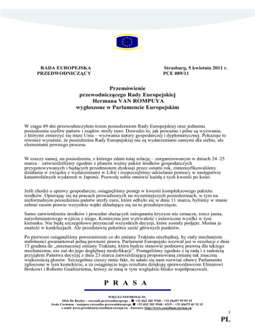 RADA EUROPEJSKA PRZEDWODNICZĄCY Strasburg, 5 kwietnia 2011 r. PCE 089/11 Przemówienie przewodniczącego Rady Europejskiej Hermana VAN ROMPUYA wygłoszone w Parlamencie Europejskim W ciągu 49 dni przewodniczyłem trzem posiedzeniom Rady Europejskiej oraz jednemu posiedzeniu szefów państw i rządów strefy euro. Dowodzi to, jak powaŜne i pilne są wyzwania, z którymi zmierzyć się musi Unia – wyzwania natury gospodarczej i dyplomatycznej. Pokazuje to równieŜ wyraźnie, Ŝe posiedzenia Rady Europejskiej nie są wydarzeniami samymi dla siebie, ale elementami pewnego procesu. W rzeczy samej, na posiedzeniu, z którego zdam tutaj relację – zorganizowanym w dniach 24–25 marca – zatwierdziliśmy zgodnie z planem waŜny pakiet środków gospodarczych przygotowywanych i będących przedmiotem dyskusji przez ostatni rok, zintensyfikowaliśmy działania w związku z wydarzeniami w Libii i rozpoczęliśmy udzielanie pomocy w następstwie katastrofalnych wydarzeń w Japonii. Pozwolę sobie omówić kaŜdą z tych kwestii po kolei. Jeśli chodzi o sprawy gospodarcze, osiągnęliśmy postęp w kwestii kompleksowego pakietu środków. Opierając się na pracach prowadzonych na wcześniejszych posiedzeniach, w tym na nieformalnym posiedzeniu państw strefy euro, które odbyło się w dniu 11 marca, byliśmy w stanie zebrać razem prawie wszystkie wątki składające się na to przedsięwzięcie. Samo zatwierdzenie środków i procedur słuŜących zaŜegnaniu kryzysu nie oznacza, rzecz jasna, natychmiastowego wyjścia z niego. Konieczna jest wytrwałość i ustawiczne wysiłki w tym kierunku. Nie będę szczegółowo przytaczał wszystkich decyzji, które zostały podjęte. MoŜna je znaleźć w konkluzjach. Ale przedstawię pokrótce sześć głównych punktów. Po pierwsze osiągnęliśmy porozumienie co do zmiany Traktatu niezbędnej, by stały mechanizm stabilności gwarantował pełną pewność prawa. Parlament Europejski wezwał juŜ w rezolucji z dnia 15 grudnia do „nieznacznej zmiany Traktatu, która będzie stanowić podstawę prawną dla takiego mechanizmu, nie zaś do jego dogłębnej modyfikacji”. Postąpiliśmy zgodnie z tą radą i z radością przyjąłem Państwa decyzję z dnia 23 marca zatwierdzającą proponowaną zmianę tak znaczną większością głosów. Szczególnie cieszy mnie fakt, Ŝe udało się nam rozwiać obawy Parlamentu zgłoszone w tym kontekście, a za osiągnięcie tego rezultatu dziękuję sprawozdawcom Elmarowi Brokowi i Roberto Gualtieriemu, którzy ze mną w tym względzie blisko współpracowali. P R A S A WIĘCEJ INFORMACJI: Dirk De Backer - rzecznik przewodniczącego - +32 (0)2 281 9768 - +32 (0)497 59 99 19 Jesús Carmona - zastępca rzecznika przewodniczącego +32 (0)2 281 9548 / 6319 - +32 (0)475 65 32 15 e-mail: [email protected] - Internet: http://www.consilium.europa.eu/ 1 PL Po drugie osiągnęliśmy porozumienie co do szczegółów, takich jak skala, zakres i tryb działania przyszłego mechanizmu stabilności, a takŜe co do poprawy rozwiązania tymczasowego. Po trzecie zatwierdziliśmy stanowisko Rady w sprawie sześciu wniosków ustawodawczych dotyczących nadzoru budŜetowego i makroekonomicznego, które będą następnie przedmiotem negocjacji z Parlamentem. Wiem, Ŝe Parlament intensywnie pracuje nad tym pakietem – spotkałem się juŜ ze sprawozdawcami, a dzisiejszego popołudnia czeka mnie spotkanie z Państwa koordynatorami. Wszystkie zaangaŜowane strony rozumieją, jak waŜne jest, by przedmiotowe prace zakończyły się do czerwca. Po czwarte rozpoczęliśmy europejski semestr. To przedsięwzięcie, za pomocą którego śledzimy realizację strategii „Europa 2020”, paktu stabilności i wzrostu oraz nadzoru makroekonomicznego. Rada Europejska wyciągnie stosowne wnioski w czerwcu. Osobiście dołoŜę starań, aby inicjatywa ta nie ugrzęzła w trybach biurokratycznej machiny. Po piąte uzgodniliśmy, Ŝe wkrótce wobec banków przeprowadzone zostaną rzetelne testy warunków skrajnych. Zadanie jest podwójne: banki muszą poddać się testom, a rządy – być gotowe zająć się ich wynikami. Po szóste zapewniliśmy nową jakość koordynacji gospodarczej. Inicjatywę tę nazwaliśmy paktem euro plus, a to z dwóch powodów: • po pierwsze poniewaŜ dotyczy ona tego, co jeszcze państwa strefy euro chcą zrobić; uŜywają wspólnej waluty i pragną podjąć dodatkowe starania, wykraczające poza zobowiązania i poza obecne ustalenia; • po drugie poniewaŜ udział w niej jest otwarty dla innych. Dlatego cieszę się, Ŝe sześć państw nienaleŜących do strefy euro zapowiedziało juŜ przyłączenie się do nowego paktu. To: Dania, Polska, Łotwa, Litwa, Bułgaria i Rumunia. Inicjatywa pozostaje otwarta dla pozostałych czterech państw członkowskich, jeśli zechcą dołączyć do niej później. Pragnę powtórzyć to raz jeszcze: zobowiązanie polityczne, którym jest pakt euro plus, jest zwieńczeniem wszystkich pozostałych środków w pakiecie mających polepszyć wyniki gospodarcze państw członkowskich: silniejszego paktu stabilności i wzrostu w odniesieniu do nadzoru budŜetowego; nowego nadzoru makroekonomicznego oraz realizacji kluczowej strategii „Europa 2020”, której celem są reformy strukturalne słuŜące osiągnięciu wzrostu gospodarczego. Zobowiązania w dziedzinie konkurencyjności, finansów publicznych i emerytur, zatrudnienia itp. muszą znaleźć swe odzwierciedlenie w krajowych programach reform i stabilności. Będą one takŜe przedmiotem corocznej oceny dokonywanej na najwyŜszym szczeblu. Ostatnia uwaga na temat gospodarki. Niektórzy obawiają się, Ŝe celem tych prac jest zlikwidowanie w Unii modelu państwa opiekuńczego, a takŜe ochrony socjalnej. Absolutnie nie. Jak powiedziałem, zwracając się do partnerów społecznych na trójstronnym szczycie społecznym: chodzi o ochronę tych podstawowych aspektów modelu europejskiego. Chcemy zagwarantować, Ŝe nasze gos