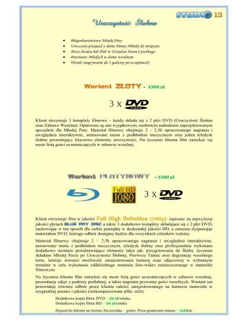Uroczystość Ślubna Błogosławieństwo Młodej Pary Uroczysty przejazd z domu Panny Młodej do świątyni. Msza Święta lub Ślub w Urzędzie Stanu Cywilnego Powitanie Młodych w domu weselnym Wesele (nagrywanie do 1 godziny po oczepinach) Klient otrzymuje 3 komplety filmowe – każdy składa się z 2 płyt DVD (Uroczystość Ślubna oraz Zabawa Weselna). Opatrzone są one wyjątkowym, osobistym nadrukiem zaprojektowanym specjalnie dla Młodej Pary. Materiał filmowy obejmuje 2 – 2,5h opracowanego nagrania i uwzględnia interaktywne, animowane menu z podkładem muzycznym oraz jeden teledysk ślubny prezentujący kluczowe elementy uroczystości. Na życzenie klienta film zamykać się może listą gości uczestniczących w zabawie weselnej. Klient otrzymuje film w jakości Full High Definition (1080p) zapisany na najwyższej jakości płytach BLUE RAY DISC a także 3 dodatkowe komplety składające się z 2 płyt DVD, zachowując w ten sposób dla siebie pamiątkę w doskonałej jakości HD, a zarazem dysponując materiałem DVD, którego odbiór dostępny będzie dla wszystkich członków rodziny. Materiał filmowy obejmuje 2 – 2,5h opracowanego nagrania i uwzględnia interaktywne, animowane menu z podkładem muzycznym, teledysk ślubny oraz profesjonalnie wykonane dodatkowe montaże przedstawiające elementy takie jak: przygotowania do Ślubu, życzenia składane Młodej Parze po Uroczystości Ślubnej, Pierwszy Taniec oraz degustację weselnego tortu. Istnieje również możliwość zarejestrowania kamerą sesji zdjęciowej w wybranym terminie w celu wykonania odddzielnego montażu foto-wideo zamieszczonego w materiale filmowym. Na życzenie klienta film zamykać się może listą gości uczestniczących w zabawie weselnej, prezentację zdjęć z podróży poślubnej, a także nagrania prywatne gości weselnych. Wariant ten przewiduje również odbiór przez klienta całości zarejestrowanego na kamerze materiału w oryginalnej postaci i jakości (niekompresowane pliki .m2t). Dodatkowa kopia filmu DVD – Dodatkowa kopia filmu BD – /sztuka /sztuka Dojazd do klienta na terenie Szczecinka – gratis. Poza granicami miasta – /km.