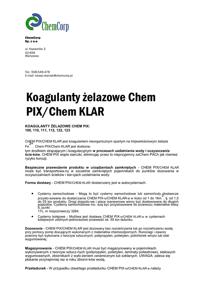 ChemCorp Sp. z o.o ul. Ksawerów 3 02-656 Warszawa Tel.: 508-549-478 E-mail: [email protected] Koagulanty żelazowe Chem PIX/Chem KLAR KOAGULANTY ŻELAZOWE CHEM PIX: 100, 110, 111, 112, 122, 123 CHEM PIX/CHEM KLAR jest koagulantem nieorganicznym opartym na trójwartościowym żelazie Fe 3+ . Chem PIX/Chem KLAR jest doskonałym środkiem strącającym i koagulacyjnym w procesach uzdatniania wody i oczyszczania ście-ków. CHEM PIX wiąże siarczki, eliminując przez to nieprzyjemny zaChem PACh jak również ryzyko korozji. Bezpieczne przewożenie produktu w urządzeniach zamkniętych - CHEM PIX/CHEM KLAR może być transportowa-ny w szczelnie zamkniętych pojemnikach do punktów dozowania w oczyszczalniach ścieków i sta-cjach uzdatniania wody. Forma dostawy - CHEM PIX/CHEM KLAR dostarczany jest w autocysternach. Cysterny samochodowe - Mogą to być cysterny samochodowe lub samochody dostawcze 3 przysto-sowane do dostarczania CHEM PIX-u/CHEM KLAR-a w ilości od 1 do 16m , tj. od 1,5 do 25 ton produktu. Drogi dojazdo-we i place manewrowe winny być dostosowane do długich pojazdów. Cysterny samochodowe mu -szą być przystosowane do przewozu materiałów klasy 8, punkt 17c, nr rozpoznawczy 3264. Cysterny kolejowe - Możliwa jest dostawa CHEM PIX-u/CHEM KLAR-a w cysternach kolejowych zdolnych jednorazowo przewieźć ok. 55 ton ładunku. Dozowanie - CHEM PIX/CHEM KLAR jest dozowany bez rozcieńczania lub po rozcieńczeniu wodą przy pomocy pomp dozujących wykonanych z materiałów chemoodpornych. Rurociagi i zawory powinny być wykonane z tworzyw sztucznych: polipropylen, polietylen, polichlorek winylu lub stali wygumowanej. Magazynowanie - CHEM PIX/CHEM KLAR musi być magazynowany w pojemnikach wykonywanych z tworzyw sztucz-nych (polipropylen, polietylen, laminaty poliestrowe), stalowych wygumowanych, zbiornikach z wyło-żeniem ceramicznym lub szklanych. UWAGA: zaleca się płukanie przynajmniej raz w roku zbiorni-ków wodą. Przeładunek - W przypadku otwartego przeładunku CHEM PIX-u/CHEM KLAR-a należy stosować sprzęt ochronny skóry i oczu. Środki ostrożności - CHEM PIX/CHEM KLAR jest środkiem lekko żrącym. Należy zapobiegać jego kontaktom ze skórą. W przypadku takiego kontaktu nalezy zmyć skórę obficie wodą. Zbiorniki magazynowe powinny być oznakowane. CHEM PIX/CHEM KLAR 110 jest to: Wodny roztwór chlorosiarczanu żelazowego. Wzór chemiczny: FeClSO4 Postać: ciemnobrunatny roztwór. CHEM PIX/CHEM KLAR 111, Wodne roztwory chlorku żelazowego. Wzór chemiczny: FeCl3 Postać: ciemnobrunatny roztwór. ZASTOSOWANIE Koagulant do: - Oczyszczania wody i ścieków, - Usuwania związków fosforu, - Usuwania siarkowodoru, - Zagęszczania osadów. SZCZEGÓLNE ZALETY - Produkt zawiera Fe +3 , - Nie jest wymagane utlenianie Fe +2 u użytkownika, - Bardzo niska zawartość metali ciężkich, - Wysoka skuteczność koagulacji w szerokim zakresie pH, - Łatwe i dokładne dozowanie. USŁUGI - Fachowe doradztwo i pomoc przy stosowaniu naszego produktu, - Przeprowadzenie prób testowych w skali laboratoryjnej i technicznej, - Pomoc w rozwiązywaniu problemów dotyczących oczyszczania ścieków i uzdatniania wody, - Kompletacja dostaw i sprzętu do dozowania CHEM PIX-u, - Zapewnienie transportu CHEM PIX-u do klienta. ChemCorp Sp. z o.o ul. Ksawerów 3 02-656 Warszawa Tel.: 508-549- 478 E-mail: [email protected] Koagulanty glinowe CHEM PAX/CHEM PAC KOAGULANTY GLINOWE CHEM PAX/CHEM PAC: 16, 18, 25, XL1, XL3, XL9, XL10, XL 19, XL 19 F, XL1905, XL60, XL61, XL69, 1881-25-2 3+ CHEM PAX/CHEM PAC jest koagulantem nieorganicznym opartym na trójwartościowym glinie Al . CHEM PAX/CHEM PAC jest doskonałym środkiem strącającym i koagulacyjnym w procesach uzdatniania wody pitnej i oczyszczania ście-ków komunalnych i przemysłowych. Bezpieczne przewożenie produktu w urządzeniach zamkniętych - CHEM PAX/CHEM PAC może być transportowany w szczelnie zamkniętych pojemnikach do punktów dozowania w oczyszczalniach ścieków i stacjach uzdatniania wody. Forma dostawy - CHEM PAX/CHEM PAC dostarczany jest w autocysternie. Cysterny samochodowe - Mogą to być cysterny samochodowe lub samochody dostawcze przystoso3 wane do dostarczania CHEM PAX-u/CHEM PAC-u w ilości od 1 do 16m , tj. od 1,5 do 25 ton produktu. Drogi dojazdowe i place manewrowe winny być dostosowane do długich pojazdów. Cysterny samochodowe muszą być przystosowane do przewozu materiałów klasy 8, punkt 5c, nr rozpoznawczy 2581. Cysterny kolejowe - Możliwa jest dostawa CHEM PAX-u/CHEM PAC-u w cysternach kolejowych zdolnych jednorazowo przewieźć ok. 55 ton ładunku. Dozowanie - CHEM PAX/CHEM PAC jest dozowany bez rozcieńczania lub po rozcieńczeniu wodą przy pomocy pomp dozujących wykonanych z materiałów chemoodpornych. Rurociagi i zawory powinny być wykonane z tworzyw sztucznych: polipropylen, polietylen, polichlorek winylu lub stali wygumowanej. Magazynowanie - CHEM PAX/CHEM PAC musi być magazynowany w pojemnikach wykonywanych z tworzyw sztucz-nych (polipropylen, polietylen, laminaty poliestrowe), stalowych wygumowanych, zbiornikach z wyło-żeniem ceramicznym lub szklanych. UWAGA: zaleca się płukanie przynajmniej raz w roku zbiorników wodą. Przeładunek - W przypadku otwartego przeładunku CHEM PAX-u/CHEM PAC-u należy stosować sprzęt ochronny skóry i oczu. Środki ostrożności - CHEM PAX/CHEM PAC jest środkiem lekko żrącym. Należy zapobiegać jego kontaktom ze skórą. W przypadku takiego kontaktu należy zmyć skórę obficie wodą. Zbiorniki magazynowe powinny być oznakowane. KOAGULANTY CHEM PAX/CHEM PAC 16, 18 są to: Wodne roztwory chlorku poliglinu. KOAGULANTY CHEM PAX/CHEM PAC XL1, XL9, XL19F, XL60, XL61, XL69 są to: Wodne roztwory chlorku poliglinu modyfikowane, zawierające między innymi jony Si, Na, Ca, Mg itp. Barwa: od bezbarwnej po jasnożółtą. KOAGULANTY CHEM PAX 25 są to: Wodne roztwory chlorku żelazochlorku poliglinu, zawierające między innymi jony Fe i SO4 Barwa: jasnobrąz