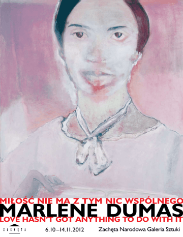 Miłość nie ma z tym nic wspólnego Marlene Dumas Love Hasn’t Got Anything To Do With It 6.10 –14.11.2012 Zachęta Narodowa Galeria Sztuki Marlene Dumas. Miłość nie ma z tym nic wspólnego Hanna Wróblewska Wystawa Marlene Dumas jest pierwszą prezentacją tej wybitnej artystki w Polsce (nie licząc epizodycznego udziału w 1981 roku w II Triennale Rysunku we Wrocławiu). Nie jest to wyczerpująca retrospektywa, lecz przygotowany we współpracy z artystką pokaz kilku wątków z jej bogatego dorobku. Punktem wyjścia są wczesne prace: rysunki i kolaże z pierwszej połowy lat 80., ale pojawiają się na wystawie też nowsze dzieła malarskie. Tytuł wystawy pochodzi od jednej z najwcześniejszych prac artystki, w pewien sposób puentuje jednak całą jej twórczość. Obrazy Dumas wymykają się łatwej kategoryzacji, choć pozornie dostarczają krytykom wielu pojęć-kluczy, wręcz klisz stosowanych współcześnie w odczytywaniu malarstwa i sztuki najnowszej. Polityka i feminizm, gender i zaangażowanie, tropy ikonograficzne i stylistyczne z historii sztuki i filmu, cytaty pośrednie lub bezpośrednie, obrazy-wizerunki nie z natury, lecz już przetworzone wcześniej przez film, fotografię itp. — to tylko niektóre z nich. Każde z tych pojęć jest prawdziwe i żadne nie oddaje w pełni prawdy. Miłość i nienawiść, czułość i okrucieństwo, niewinność i wina, świętość i bluźnierstwo, śmierć i życie — ambiwalencja nastrojów, pojęć i stanów zdaje się dominować w opisach tych dzieł. Eros i Thanatos, seks i śmierć, erotyzm i pornografia. Obrazy wieszane grupami, często wchodzą ze sobą w dialog, a nawet w gwałtowne konflikty, choć pomiędzy nimi jest ogromna biała ściana czy pusta przestrzeń. Zróżnicowane pod względem skali — czasem trzymetrowe, nieraz tylko kilkudziesięciocentymetrowe, za duże lub za małe, za kolorowe lub za szare — nigdy nie są neutralne w stosunku do istniejącej przestrzeni. Nigdy nie „pasują” do końca, wymykając się estetyce white cube. Postacie z obrazów-portretów łączą się niekiedy w przestrzeniach wystawy w pary. Matka i syn. Mamma Roma i Pasolini. Pasolini i jego matka. Pasolini i Chrystus. Dziecko i trup. Chrystus i Osama bin Laden. Martwy Céline i żywa Emily. Pejzaż i ciało. Parą niedoskonałą czy ułomną wydaje się być wizerunek Piety Rondanini z Mediolanu, nawiązanie do Michała Anioła i jego nieukończonego dzieła, kształtu nie w pełni wydobytego z materii kamienia. Nawet przedstawienia kobiet z pokazywanych tu wczesnych kolaży z lat 80. są również takimi ułomnymi parami. To żony uwięzionych, nieobecnych, zamordowanych bojowników i przywódców politycznych z Afryki, Ameryki Południowej i Północnej (m.in. Coretta Scott King, Ntsiki Biko czy Hortensia Bussi). Malarstwo Dumas zawsze wzbudzało żywe reakcje w krytykach — od agresji do uwielbienia, od nieukrywanej niechęci po zachwyt. Rzadko kto przechodził i przechodzi wobec niego obojętnie. Jej sztuka to nie opowieść, ale mocna artystyczna deklaracja, domagająca się również od odbiorcy zajęcia stanowiska. Żąda dopełnienia — żywej reakcji, gorącego uczucia, a nie tylko (choć tego również) zimnej kalkulacji. I być może tym drugim wobec sztuki Dumas, tym innym, tym do pary, wyobrażonym, choć niepokazanym jest tu właśnie widz? A miłość nie ma z tym nic wspólnego. Marlene Dumas. Love Hasn’t Got Anything to Do With It Hanna Wróblewska The exhibition of works by Marlene Dumas marks the first presentation of this outstanding artist in Poland (not counting the episodic participation in the Second Triennial of Drawing in Wrocław in 1981). Rather than a comprehensive retrospective, this exhibition developed in collaboration with the artist, focuses on a number of themes present in Dumas’ rich output. Although Love Hasn’t Got Anything to Do With It takes as its point of departure the artist’s early works — drawings and collages from the first half of the 1980s — the show also includes recent paintings. Its title, borrowed from one of Dumas’ first works, can be read as a fitting commentary to the whole of her practice. Dumas’ paintings do not lend themselves to one-line definitions, although, at the same time, they seem to offer critics a whole number of keywords, not to say clichés, which are widely used in interpreting both painting as well as contemporary art in general. These include politics and feminism, gender and engagement, iconographic and stylistic tropes from the history of art and film, direct and indirect quotes, painterly representations of that which was already processed in cinema, photography, etc. — to name but a few. Each of these concepts is correct in the above context and, at the same time, none of them fully grasps the essence. Love and hate, tenderness and cruelty, innocence and guilt, sanctity and blasphemy, life and death — such ambivalence seems to dominate the descriptions of Dumas’ works. Eros and Thanatos, sex and death, eroticism and pornography. Presented in groups, her paintings often come into a dialogue, or violent conflicts, with each other — even though they are separated by a massive white wall or an empty space. Varying in scale — 2 from three meters to merely several dozen centimeters — either too big or too small, too vivid or too grey, they are never neutral in relation to the surrounding space. They never seem ‘fully at home’, eluding the aesthetic of the white cube. Sometimes, the figures in the paintings-portraits meet, forming matching pairs in the exhibition space. Mother and son. Mamma Roma and Pasolini. Pasolini and his mother. Pasolini and Christ. A child and a corpse. Christ and Osama bin Laden, dead Céline and Emily alive. The landscape and the body. The image of the Rondanini Pietà from Milan, a reference to Michelangelo and his unfinished work, a form left undeveloped in the stone material, seems to be an
