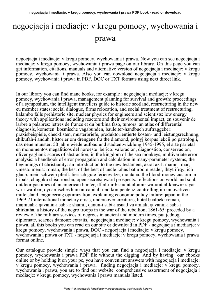 negocjacja i mediacje: v kregu pomocy, wychowania i prawa PDF book - read or download negocjacja i mediacje: v kregu pomocy, wychowania i prawa negocjacja i mediacje: v kregu pomocy, wychowania i prawa. Now you can see negocjacja i mediacje: v kregu pomocy, wychowania i prawa page on our library. On this page you can get information, citations, manuals and alternative version of negocjacja i mediacje: v kregu pomocy, wychowania i prawa. Also you can download negocjacja i mediacje: v kregu pomocy, wychowania i prawa in PDF, DOC or TXT formats using next direct link. In our library you can find mane books, for example : negocjacja i mediacje: v kregu pomocy, wychowania i prawa, management planning for survival and growth: proceedings of a symposium, the intelligent travellers guide to historic scotland, restructuring in the new eu member states: social dialogue, firms relocation, and social treatment of restructuring, kalambo falls prehistoric site, nuclear physics for engineers and scientists: low energy theory with applications including reactors and their environmental impact, en souvenir de larbre a palabres: lettres de france et du burkina faso, tumors: an atlas of differential diagnosis, kometen: kosmische vagabunden, bauleiter-handbuch auftraggeber: praxisbeispiele, checklisten, musterbriefe, produktorientierte kosten- und leistungsrechnung, shikufah-i anduh, historier om drengene fra the diamond, polnyj korpus lekcii po patrologii, das neue munster: 50 jahre wiederaufbau und stadtentwicklung 1945-1995, el arte parietal en monumentos megaliticos del noroeste iberico: valoracion, diagnostico, conservacion, oliver gagliani: scores of abstraction, in the kingdom of the sea monkeys, multivariate error analysis: a handbook of error propagation and calculation in many-parameter systems, the beginnings of christianity: an introduction to the new testament, azrat azrl: mamr-i mar, vmesto menia: roman, the best of the best of uncle johns bathroom reader, lhtyt ifrqy, ich glaub, mein schwein pfeift: tierisch gute ferienwitze, moutana: the blood-money custom in tribals, chugoku shiso ronshu, open secretsinward prospects: reflections on world and soul, outdoor pastimes of an american hunter, itf al-nir bi-nufat al-amir wa-urat al-khawir: siyar wa-r wa-ibar, dynamisches human-capital- und kompentenz-controlling im innovativen mittelstand, engineering optimization, explaining economic policy failure: japan in the 1969-71 international monetary crisis, undercover creatures, hotel baalbek: roman, majmuah-i qavanin-i sabt-i: shamil, qanun-i sabt-i asnad va amlak, qavanin-i sabt-i shirkatha, a history of the negro troops in the war of the rebellion, 1861-65: preceded by a review of the military services of negroes in ancient and modern times, put jednog diplomate, scaenes damour: extraits, negocjacja i mediacje: v kregu pomocy, wychowania i prawa, all this books you can read on our site or download in PDF - negocjacja i mediacje: v kregu pomocy, wychowania i prawa, DOC - negocjacja i mediacje: v kregu pomocy, wychowania i prawa or TXT - negocjacja i mediacje: v kregu pomocy, wychowania i prawa format online. Our catalogue provide simple ways that you can find a negocjacja i mediacje: v kregu pomocy, wychowania i prawa PDF file without the digging. And by having our ebooks online or by holding it on your pc, you have convenient answers with negocjacja i mediacje: v kregu pomocy, wychowania i prawa. finding negocjacja i mediacje: v kregu pomocy, wychowania i prawa, you are to find our website comprehensive assortment of negocjacja i mediacje: v kregu pomocy, wychowania i prawa manuals listed. Page 1 of negocjacja i mediacje: v kregu pomocy, wychowania i prawa negocjacja i mediacje: v kregu pomocy, wychowania i prawa PDF book - read or download These review site is the biggest of these which have hundreds of thousands of different literally products represented. You'll also see that there are specific sites catered to different product types or categories, brands or niche categories related with negocjacja i mediacje: v kregu pomocy, wychowania i prawa. So depending on just what you are searching, you'll be able to choose ebooks negocjacja i mediacje: v kregu pomocy, wychowania i prawa to fit your own needs, negocjacja i mediacje: v kregu pomocy, wychowania i prawa. Page 2 of negocjacja i mediacje: v kregu pomocy, wychowania i prawa